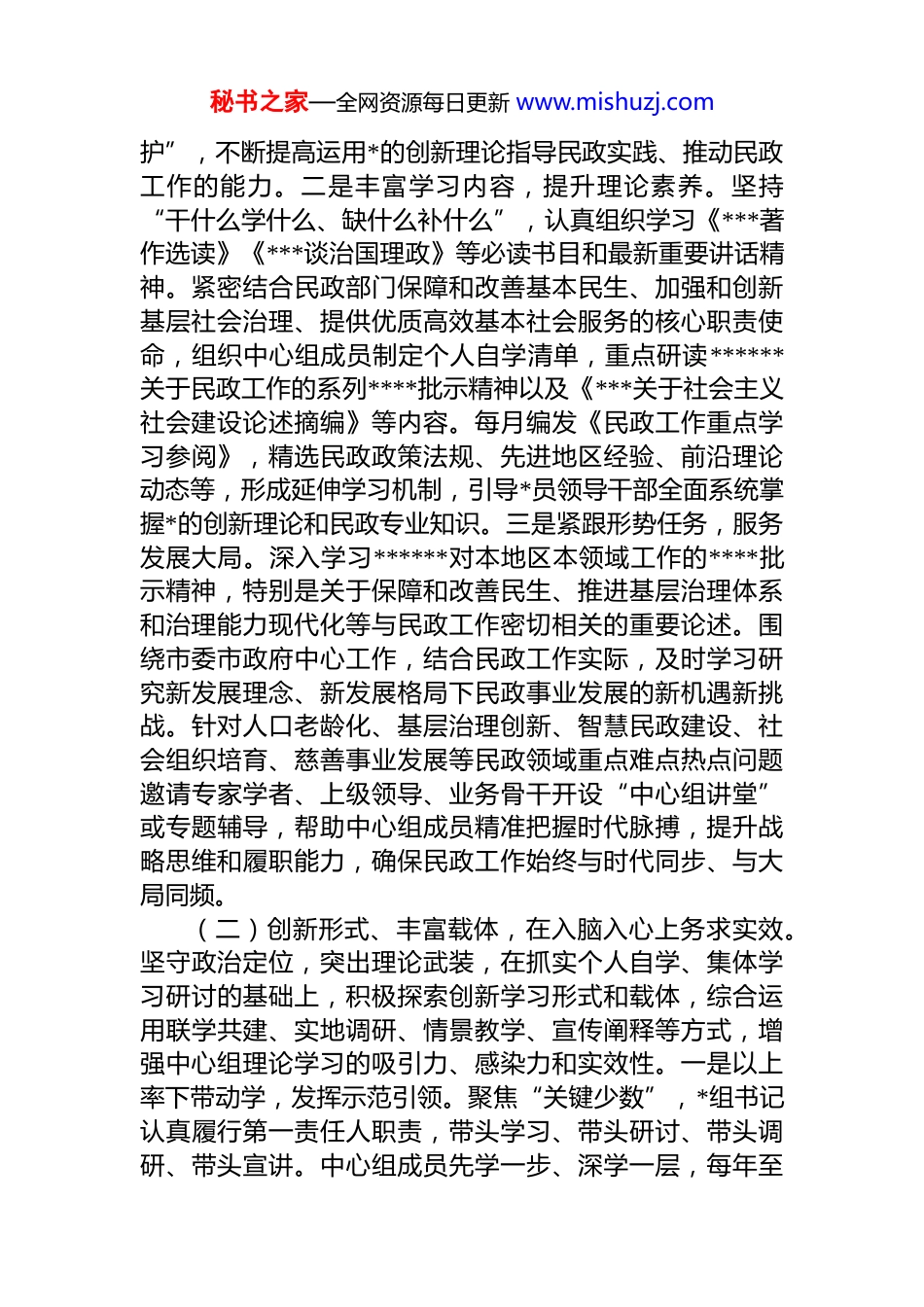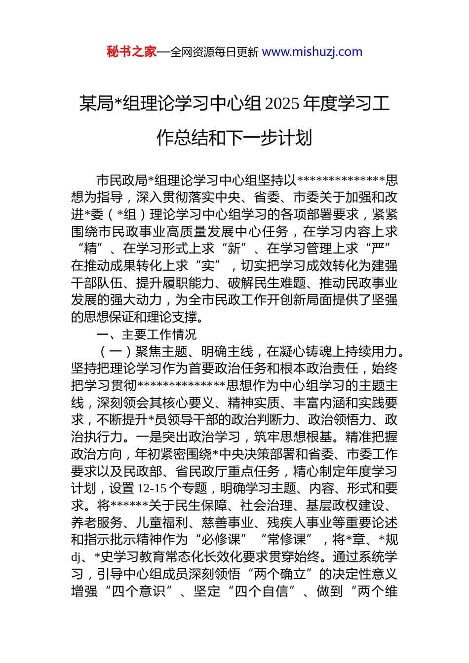 秘书之家—全网资源每日更新 www.mishuzj.com某局*组理论学习中心组 2025 年度学习工作总结和下一步计划市民政局*组理论学习中心组坚持以**************思想为指导,深入贯彻落实中央、省委、市委关于加强和改进*委(*组)理论学习中心组学习的各项部署要求,紧紧围绕市民政事业高质量发展中心任务,在学习内容上求“精”、在学习形式上求“新”、在学习管理上求“严”在推动成果转化上求“实”,切实把学习成效转化为建强干部队伍、提升履职能力、破解民生难题、推动民政事业发展的强大动力,为全市民政工作开创新局面提供了坚强的思想保证和理论支撑。一、主要工作情况(一)聚焦主题、明确主线,在凝心铸魂上持续用力。坚持把理论学习作为首要政治任务和根本政治责任,始终把学习贯彻**************思想作为中心组学习的主题主线,深刻领会其核心要义、精神实质、丰富内涵和实践要求,不断提升*员领导干部的政治判断力、政治领悟力、政治执行力。一是突出政治学习,筑牢思想根基。精准把握政治方向,年初紧密围绕*中央决策部署和省委、市委工作要求以及民政部、省民政厅重点任务,精心制定年度学习计划,设置 12-15 个专题,明确学习主题、内容、形式和要求。将******关于民生保障、社会治理、基层政权建设、养老服务、儿童福利、慈善事业、残疾人事业等重要论述和指示批示精神作为“必修课”“常修课”,将*章、*规dj、*史学习教育常态化长效化要求贯穿始终。通过系统学习,引导中心组成员深刻领悟“两个确立”的决定性意义增强“四个意识”、坚定“四个自信”、做到“两个维秘书之家—全网资源每日更新 www.mishuzj.com护”,不断提高运用*的创新理论指导民政实践、推动民政工作的能力。二是丰富学习内容,提升理论素养。坚持“干什么学什么、缺什么补什么”,认真组织学习《***著作选读》《***谈治国理政》等必读书目和最新重要讲话精神。紧密结合民政部门保障和改善基本民生、加强和创新基层社会治理、提供优质高效基本社会服务的核心职责使命,组织中心组成员制定个人自学清单,重点研读******关于民政工作的系列****批示精神以及《***关于社会主义社会建设论述摘编》等内容。每月编发《民政工作重点学习参阅》,精选民政政策法规、先进地区经验、前沿理论动态等,形成延伸学习机制,引导*员领导干部全面系统掌握*的创新理论和民政专业知识。三是紧跟形势任务,服务发展大局。深入学习******对本地区本领域工作的****批示精神,特别是关于保障和改善民生、推进基层治理体系和治理能力现代化等与民政工作密切相关的重要论述。围绕市委市政府中心工作,结合民政工作实际,及时学习研究新发展理念、新发展格局下民政事业发展的新机遇新挑战。针对人口老龄化、基层治理创新、智慧民政建设、社会组织培育、慈善事业发展等民政领域重点难点热点问题邀请专家学者、上级领导、业务骨干开设“中心组讲堂”或专题辅导,帮助中心组成员精准把握时代脉搏,提升战略思维和履职能力,确保民政工作始终与时代同步、与大局同频。(二)创新形式、丰富载体,在入脑入心上务求实效。坚守政治定位,突出理论武装,在抓实个人自学、集体学习研讨的基础上,积极探索创新学习形式和载体,综合运用联学共建、实地调研、情景教学、宣传阐释等方式,增强中心组理论学习的吸引力、感染力和实效性。一是以上率下带动学,发挥示范引领。聚焦“关键少数”,*组书记认真履行第一责任人职责,带头学习、带头研讨、带头调研、带头宣讲。中心组成员先学一步、深学一层,每年至秘书之家—全网资源每日更新 www.mishuzj.com少举办一期专题读书班,严格落实前置自学、集中研讨、专题辅导、成果交流等环节。在重要学习教育活动期间,如学习贯彻中央八项规定精神、dj 学习教育等,组织中心组成员分专题深入学习相关论述摘编和辅导材料,并安排新提拔干部、年轻干部列席旁听、参与研讨、重点发言,形成领导干部带头学、全体*员跟进学的良好氛围。二是联学共建拓展学,凝聚工作合力。积极探索跨部门、跨层级跨领域的联学模式,制定《市民政局*组理论学习中心组“联学共建”活动方案》,将联学作为常态化学习...
