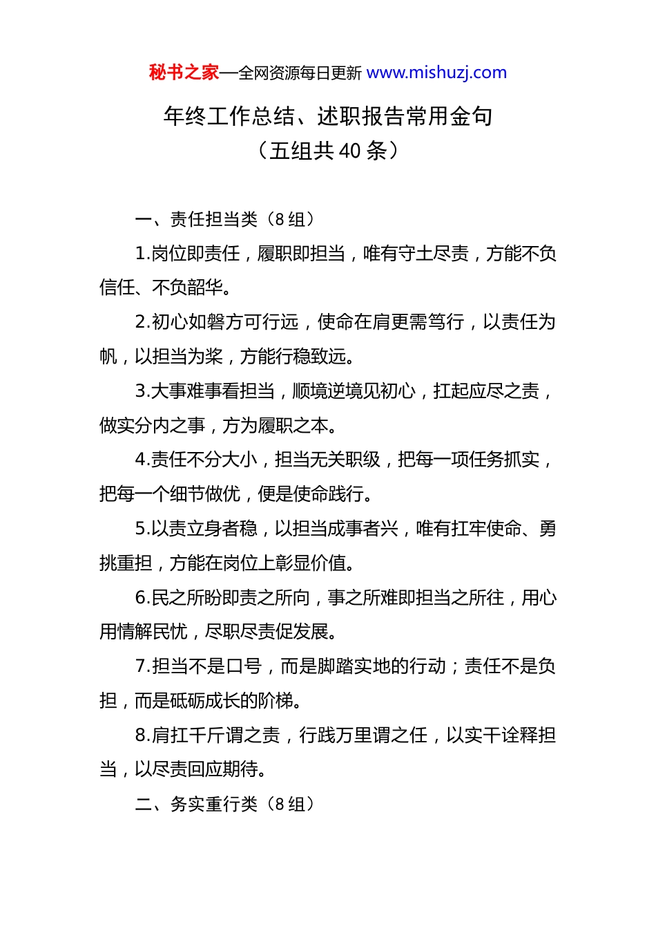 秘书之家—全网资源每日更新 www.mishuzj.com年终工作总结、述职报告常用金句(五组共 40 条)一、责任担当类(8 组)1.岗位即责任,履职即担当,唯有守土尽责,方能不负信任、不负韶华。2.初心如磐方可行远,使命在肩更需笃行,以责任为帆,以担当为桨,方能行稳致远。3.大事难事看担当,顺境逆境见初心,扛起应尽之责,做实分内之事,方为履职之本。4.责任不分大小,担当无关职级,把每一项任务抓实,把每一个细节做优,便是使命践行。5.以责立身者稳,以担当成事者兴,唯有扛牢使命、勇挑重担,方能在岗位上彰显价值。6.民之所盼即责之所向,事之所难即担当之所往,用心用情解民忧,尽职尽责促发展。7.担当不是口号,而是脚踏实地的行动;责任不是负担,而是砥砺成长的阶梯。8.肩扛千斤谓之责,行践万里谓之任,以实干诠释担当,以尽责回应期待。二、务实重行类(8 组)秘书之家—全网资源每日更新 www.mishuzj.com1.空谈误事,实干兴业,所有成绩皆源于脚踏实地,所有突破皆来自真抓实干。2.凡事成于实、败于虚,唯有深耕细作、务实笃行,方能把蓝图变为实景、把愿景变为现实。3.基层工作无捷径,实干是唯一良方,以“钉钉子”精神抓落实,以“实打实”作风解难题。4.功不唐捐,玉汝于成,把每一件小事做透,把每一项工作落地,便是最好的履职答卷。5.执行重在实效,落实贵在坚持,察实情、出实招、求实效,方能破解发展难题、夯实工作根基。6.不驰于空想,不骛于虚声,以“踏石留印”的劲头抓执行,以“抓铁有痕”的作风促落地。7.实干方能破局,笃行方可致远,在实践中找方法,在落实中求突破,方能不负韶华、不负重托。8.小事不避繁,大事不畏难,以务实之举回应需求,以实干之果回馈信任。三、展望未来类(8 组)1.征程万里风正劲,重任千钧再出发,以过往为序章,以奋斗为笔墨,书写更精彩的新篇章。2.过往皆为序章,未来皆可期待,唯有永葆初心、勇毅前行,方能在新征程上再创佳绩。秘书之家—全网资源每日更新 www.mishuzj.com3.新程已启,未来可期,以梦为马、不负时光,用拼搏绘就蓝图,用实干成就未来。4.路虽远,行则将至;事虽难,做则必成,新一年锚定目标、笃行不怠,终能抵达理想彼岸。5.岁月不居,时节如流,总结过往明方向,展望未来再扬帆,以奋进之姿续写新篇。6.潮平岸阔催人进,风正扬帆正当时,怀揣梦想、脚踏实地,在新征程上勇毅争先、砥砺前行。7.既往成绩皆为底气,未来征途更需奋进,以坚定的信念、务实的作风,奔赴下一场山海。8.新起点承载新希望,新使命呼唤新作为,凝心聚力再出发,真抓实干启新程。四、团结协作类(8 组)1.单丝不成线,独木难成林,唯有同心聚力、携手同行,方能凝聚磅礴力量、共克艰难险阻。2.人心齐则泰山移,众志坚则万事成,汇聚团队智慧,凝聚协作之力,方能所向披靡、再创辉煌。3.协作是成功之基,同心是奋进之要,心往一处想、劲往一处使,方能形成无坚不摧的合力。4.独行快,众行远,以包容之心聚合力,以协作之力破难题,共赴高质量发展新征程。秘书之家—全网资源每日更新 www.mishuzj.com5.群策群力则无往不胜,同心同德则万事可成,感恩并肩同行,未来继续携手致远。6.聚是一团火,散是满天星,每一份力量都不可或缺,每一次协作都意义非凡。7.同心山成玉,协力土变金,唯有上下同欲、内外同心,方能攻坚克难、续写荣光。8.团队之强在于心齐,事业之兴在于协作,以团结凝聚力量,以协作成就未来。五、激励奋进类(8 组)1.道阻且长,行则将至;行而不辍,未来可期,以奋斗之姿逐光而行,以奋进之势书写华章。2.青春逢盛世,奋斗正当时,不负时代、不负韶华,用拼搏定义时光,用实干成就梦想。3.志不强者智不达,言不信者行不果,以坚定之志砥砺前行,以奋进之力勇攀高峰。4.艰难方显勇毅,磨砺始得玉成,所有挫折都是成长的养分,所有奋斗终将绽放光芒。5.勤能补拙,韧可攻坚,以“时不我待”的紧迫感、“舍我其谁”的责任感,勇挑重担、奋勇争先。6.心有光芒,何惧路长,以初心为舵,以奋进为帆,在逐梦路上永不停歇、勇毅前行。秘书之家—全网资源每日更新 www.mishuzj.com7.不恋过往荣光,不惧未...