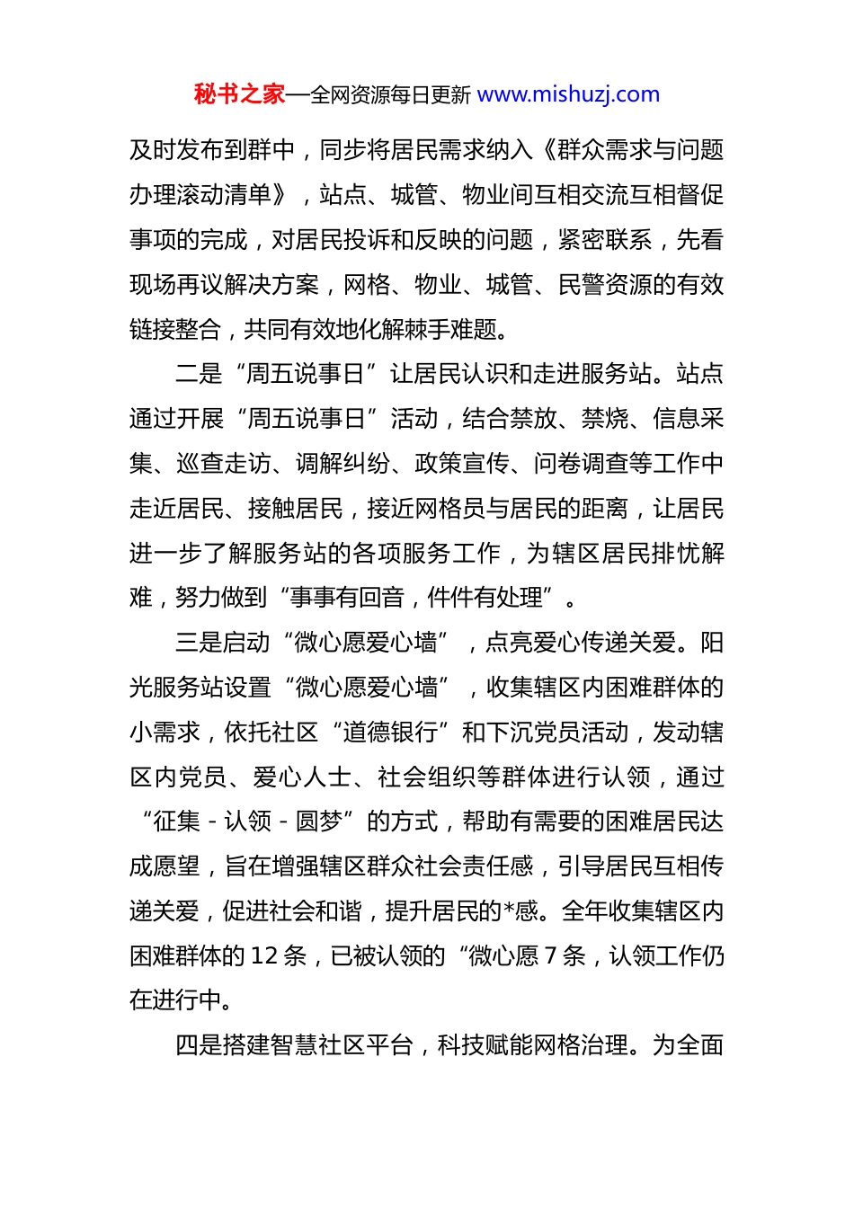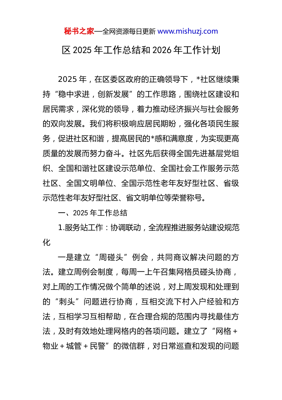 秘书之家—全网资源每日更新 www.mishuzj.com区 2025 年工作总结和 2026 年工作计划 2025 年,在区委区政府的正确领导下,*社区继续秉持“稳中求进,创新发展”的工作思路,围绕社区建设和居民需求,深化党的领导,着力推动经济振兴与社会服务的双向发展。我们将积极响应居民期盼,强化各项民生服务,促进社区和谐,提高居民的*感和满意度,为实现更高质量的发展而努力奋斗。社区先后获得全国先进基层党组织、全国和谐社区建设示范单位、全国社会工作服务示范社区、全国文明单位、全国示范性老年友好型社区、省级示范性老年友好型社区、省文明单位等荣誉称号。一、2025 年工作总结1.服务站工作:协调联动,全流程推进服务站建设规范化一是建立“周碰头”例会,共同商议解决问题的方法。建立周例会制度,每周一上午召集网格员碰头协商,对上周的工作情况做个简单的述说,对上周发现和处理到的“刺头”问题进行协商,互相交流下村入户经验和方法,互相学习互相帮助,在合理合规的范围内寻找最佳方法,及时有效地处理网格内的各项问题。建立了“网格+物业+城管+民警”的微信群,对日常巡查和发现的问题秘书之家—全网资源每日更新 www.mishuzj.com及时发布到群中,同步将居民需求纳入《群众需求与问题办理滚动清单》,站点、城管、物业间互相交流互相督促事项的完成,对居民投诉和反映的问题,紧密联系,先看现场再议解决方案,网格、物业、城管、民警资源的有效链接整合,共同有效地化解棘手难题。二是“周五说事日”让居民认识和走进服务站。站点通过开展“周五说事日”活动,结合禁放、禁烧、信息采集、巡查走访、调解纠纷、政策宣传、问卷调查等工作中走近居民、接触居民,接近网格员与居民的距离,让居民进一步了解服务站的各项服务工作,为辖区居民排忧解难,努力做到“事事有回音,件件有处理”。三是启动“微心愿爱心墙”,点亮爱心传递关爱。阳光服务站设置“微心愿爱心墙”,收集辖区内困难群体的小需求,依托社区“道德银行”和下沉党员活动,发动辖区内党员、爱心人士、社会组织等群体进行认领,通过“征集-认领-圆梦”的方式,帮助有需要的困难居民达成愿望,旨在增强辖区群众社会责任感,引导居民互相传递关爱,促进社会和谐,提升居民的*感。全年收集辖区内困难群体的 12 条,已被认领的“微心愿 7 条,认领工作仍在进行中。四是搭建智慧社区平台,科技赋能网格治理。为全面秘书之家—全网资源每日更新 www.mishuzj.com推行网格化和 AB 岗服务模式,提升基层治理精细化、智能化水平,*社区联合电信公司,共同开发建设了”*社区智慧社区试点系统“。该系统自上线试运行以来,初步实现了社区基础信息的数字化、网格事件的流程化、社区服务的便捷化与文明建设的可视化。2.经济工作:狠抓项目进展,促进经济发展一是固定资产投资稳步推进。固定资产投资:完成入库投资 2.12 亿占年度目标 2 亿元的 106%,已超额完成。重大项目建设:任务数全年纳统项目(8 个)、新开工亿元项目(2 个)及 5000 万以上项目(3 个)目标。新开工5000 万以下项目 2 个,撒沃食品中央厨房项目和悦水阑亭都市休闲综合体项目,拟纳统。二是亲商安商环境深化。健全”亲清有约“机制,常态化开展”四送一服“。累计联系企业 900 余户,帮助企业解决难题,按时完成省平台填报。防范非法集资集中宣传 11 次,覆盖超 3000 人次,发放宣传品 1600 余件,提升群众风险防范意识。三是招商引资稳中有进。成功新签约省外亿元项目 1个,已开工。区通报完成省外资金 0.2 亿元。积极”走出去、请进来“,外出招商 2 次,拜访机构 6 家,接待来访48 家,报送重点项目线索 4 条。秘书之家—全网资源每日更新 www.mishuzj.com2.党建工作:强化党建引领,筑牢党性根基一是加强理论学习,夯实主题教育学习成果。结合社区实际,利用学习日、主题党日、三会一课开展多种形式的理论学习;党纪学习教育跟着上,不限形式,不限场地。各网格支部依托社区党校,充分利用支委会、党员大会、学习强国、共产党员网、微信群等组织开展学习,通过群发消息,组织党员集中...