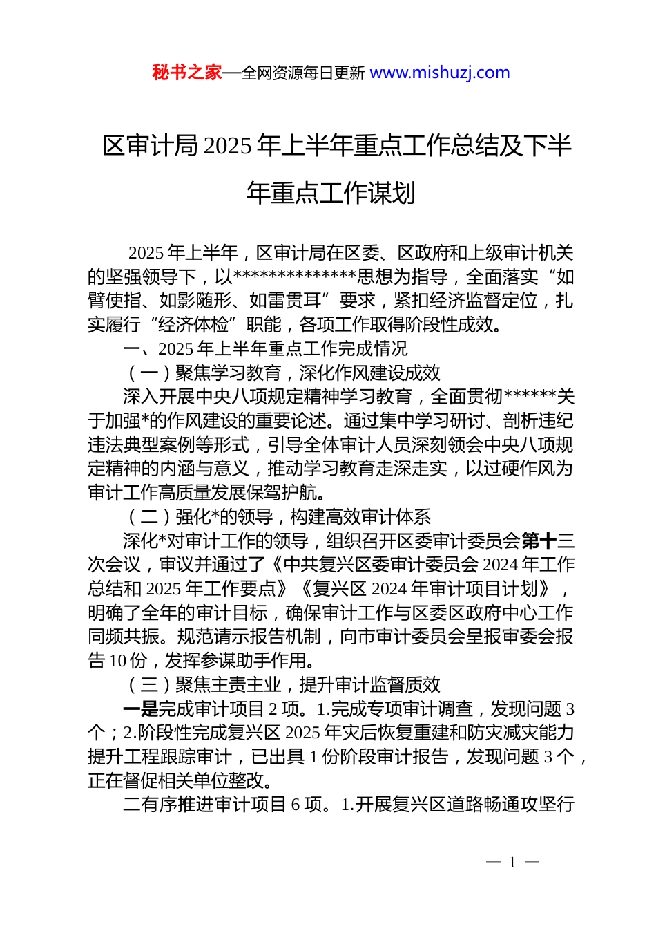 秘书之家—全网资源每日更新 www.mishuzj.com区审计局 2025 年上半年重点工作总结及下半年重点工作谋划 2025 年上半年,区审计局在区委、区政府和上级审计机关的坚强领导下,以**************思想为指导,全面落实“如臂使指、如影随形、如雷贯耳”要求,紧扣经济监督定位,扎实履行“经济体检”职能,各项工作取得阶段性成效。一、2025 年上半年重点工作完成情况(一)聚焦学习教育,深化作风建设成效深入开展中央八项规定精神学习教育,全面贯彻******关于加强*的作风建设的重要论述。通过集中学习研讨、剖析违纪违法典型案例等形式,引导全体审计人员深刻领会中央八项规定精神的内涵与意义,推动学习教育走深走实,以过硬作风为审计工作高质量发展保驾护航。(二)强化*的领导,构建高效审计体系深化*对审计工作的领导,组织召开区委审计委员会第十三次会议,审议并通过了《中共复兴区委审计委员会 2024 年工作总结和 2025 年工作要点》《复兴区 2024 年审计项目计划》,明确了全年的审计目标,确保审计工作与区委区政府中心工作同频共振。规范请示报告机制,向市审计委员会呈报审委会报告 10 份,发挥参谋助手作用。(三)聚焦主责主业,提升审计监督质效一是完成审计项目 2 项。1.完成专项审计调查,发现问题 3个;2.阶段性完成复兴区 2025 年灾后恢复重建和防灾减灾能力提升工程跟踪审计,已出具 1 份阶段审计报告,发现问题 3 个,正在督促相关单位整改。二有序推进审计项目 6 项。1.开展复兴区道路畅通攻坚行— 1 —秘书之家—全网资源每日更新 www.mishuzj.com动跟踪审计,对辖区 6 条道路的建设情况和资金使用情况进行跟踪监督;2.开展解决“烂尾楼”攻坚行动专项审计调查,聚焦盛锦花园和碧桂园雍华府 2 个小区,重点关注政策落实、项目管理、资金使用及绩效评价等情况;3.开展 2024 年度区级预算执行及决算草案编制情况审计,确保预算科学、执行规范,提高财政资金效能;4.继续开展灾后重建工程跟踪审计,对我区灾后重建与防灾工程进行跟踪监督,保障专款专用,提升防灾能力;5.开展农村集体经济组织接受使用财政资金情况审计调查,及时发现并纠正资金使用中的违规违纪问题,助力农村集体经济健康可持续发展;6.开展我区高层次人才科研经费使用情况审计监督检查,规范经费使用,避免资金闲置或违规使用给用人单位带来管理风险。三是完成审计问题整改销号。通过下达整改督办函,召开调度会等方式,督促指导涉及我区审计问题的整改工作,加压推进问题整改高效落实,截至目前,省“三项审计”涉及复兴区 10 个问题和对省委巡视发现审计查出整改不到位的 10 个问题已全部完成整改,并按要求上报省审计厅、市审计局完成问题销号。四是强化与上级机关的沟通衔接。配合市审计局进行国债项目资金专项跟踪审计,派员参与全市群众身边腐败集中整治项目审计调查,通过以审代训、以查带训,锻炼实战能力,进一步拓宽工作视野,快速提升工作能力。(四)提升队伍建设,筑牢审计监督根基始终将队伍建设作为提升审计质效的关键抓手,通过“传帮带”、“审计师考试”等机制强化审计能力提升,打造专业化审计队伍。上半年局里有 1 名同志获评省审计厅“审计系统先进工作者”(全市仅 6 人),1 个审计项目被评为市级优秀审计项目,审计业务质量在全市年度检查中获市审计局通报肯定,队伍战斗力与监督效能实现双提升。— 2 —秘书之家—全网资源每日更新 www.mishuzj.com二、下半年重点工作谋划(一)聚焦主责主业,深耕审计质效紧扣区委、区政府中心工作,围绕财政资金使用、群腐集中整治、重大项目建设等重点领域,严格落实年度审计计划,精准实施审计项目。强化审计资源的合理分配,提升审计监督的深度,确保完成上级审计机关交办和本级的审计工作,以高质量审计成果服务区域经济社会发展。(二)狠抓问题整改,筑牢监督闭环建立健全审计整改台账,明确整改责任人和整改时限,实行“清单化”管理,“销号式”推进。同时加强与纪检监察、组织人事等部门的联动协作,适时开展整改“回头看”,对整改不力、敷衍塞责的单位和个人严肃追责问...