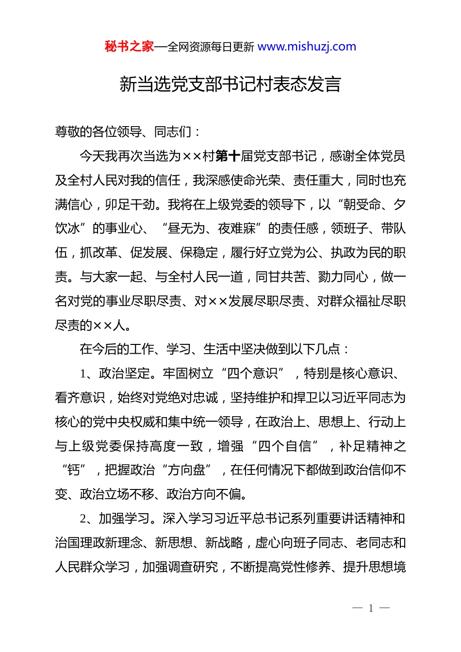 秘书之家—全网资源每日更新 www.mishuzj.com新当选党支部书记村表态发言尊敬的各位领导、同志们: 今天我再次当选为××村第十届党支部书记,感谢全体党员及全村人民对我的信任,我深感使命光荣、责任重大,同时也充满信心,卯足干劲。我将在上级党委的领导下,以“朝受命、夕饮冰”的事业心、“昼无为、夜难寐”的责任感,领班子、带队伍,抓改革、促发展、保稳定,履行好立党为公、执政为民的职责。与大家一起、与全村人民一道,同甘共苦、勠力同心,做一名对党的事业尽职尽责、对××发展尽职尽责、对群众福祉尽职尽责的××人。 在今后的工作、学习、生活中坚决做到以下几点: 1、政治坚定。牢固树立“四个意识”,特别是核心意识、看齐意识,始终对党绝对忠诚,坚持维护和捍卫以习近平同志为核心的党中央权威和集中统一领导,在政治上、思想上、行动上与上级党委保持高度一致,增强“四个自信”,补足精神之“钙”,把握政治“方向盘”,在任何情况下都做到政治信仰不变、政治立场不移、政治方向不偏。 2、加强学习。深入学习习近平总书记系列重要讲话精神和治国理政新理念、新思想、新战略,虚心向班子同志、老同志和人民群众学习,加强调查研究,不断提高党性修养、提升思想境— 1 —秘书之家—全网资源每日更新 www.mishuzj.com界、增强能力水平。 3、敢于担当,为民服务,为民办事。在征地拆迁中坚持公平正义,维护人民群众合法权益,勇挑重担。亲力亲为抓发展,扑下身子抓落实。对侵害党和人民利益的人和事“零容忍”、不留情、敢亮剑。 4、务实重行。始终坚持从实际出发,讲实话、干实事,以“功成不必在我”的境界、“功成必定有我”的担当,一任接着一任干,一张蓝图绘到底,真抓实干,一抓到底。 5、精诚团结。时刻以党的事业为重,以全村大局为重,以人民利益为重,带头执行民主集中制,发挥好“两委”班子每位班子成员的积极性和创造性,相互尊重,相互支持,用实际行动报效组织和人民。 6、清正廉洁。带头严守党章党规党纪,带头落实中央八项规定精神和省委六条意见、市委七条意见,带头履行全面从严治党“第一责任人”职责。不以权谋私、不假公济私、不优亲厚友,接受全村人民群众的监督。 “功崇惟志,业广惟勤”。我有信心,有决心,在上级党委的坚强领导下,团结带领支部一班人,同村“两委”班子一道,紧紧依靠全村广大党员干部和人民群众,共同把××的工作做好、把××的事情办好,实现共同发展、共同富裕,努力让××村每一位人民都能过上幸福美好的生活,向上级党委和××人民交上— 2 —秘书之家—全网资源每日更新 www.mishuzj.com一份满意的答案。 最后祝愿大家身体健康、生活愉快、工作顺利、阖家幸福! 谢谢大家! ××村:×× XX 年月日 — 3 —