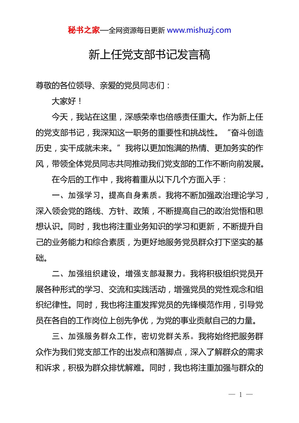 秘书之家—全网资源每日更新 www.mishuzj.com新上任党支部书记发言稿尊敬的各位领导、亲爱的党员同志们:大家好!今天,我站在这里,深感荣幸也倍感责任重大。作为新上任的党支部书记,我深知这一职务的重要性和挑战性。“奋斗创造历史,实干成就未来。”我将以更加饱满的热情、更加务实的作风,带领全体党员同志共同推动我们党支部的工作不断向前发展。在今后的工作中,我将着重从以下几个方面入手:一、加强学习,提高自身素质。我将不断加强政治理论学习,深入领会党的路线、方针、政策,不断提高自己的政治觉悟和思想认识。同时,我也将注重业务知识的学习和更新,不断提升自己的业务能力和综合素质,为更好地服务党员群众打下坚实的基础。二、加强组织建设,增强支部凝聚力。我将积极组织党员开展各种形式的学习、交流和实践活动,增强党员的党性观念和组织纪律性。同时,我也将注重发挥党员的先锋模范作用,引导党员在各自的工作岗位上创先争优,为党的事业贡献自己的力量。三、加强服务群众工作,密切党群关系。我将始终把服务群众作为我们党支部工作的出发点和落脚点,深入了解群众的需求和诉求,积极为群众排忧解难。同时,我也将注重加强与群众的— 1 —秘书之家—全网资源每日更新 www.mishuzj.com沟通和联系,及时听取群众的意见和建议,不断改进我们的工作方法和作风,努力赢得群众的信任和支持。四、加强党风廉政建设,营造风清气正的政治生态。我将始终把党风廉政建设作为我们党支部工作的重要内容之一,加强对党员的教育、管理和监督,确保党员在思想上、政治上、行动上与党中央保持高度一致。同时,我也将注重加强制度建设,建立健全各项规章制度,为营造风清气正的政治生态提供有力的制度保障。“路虽远,行则将至;事虽难,做则必成。”我将以这一信念为座右铭,开启党支部工作的新航程。我会以虚怀若谷之心,博采众长,以开拓进取之意,破冰除障。我期待与全体党员同志并肩同行,将每一份力量凝聚成磅礴伟力。让我们携手并进,共同书写属于我们党支部的辉煌篇章!谢谢大家!— 2 —