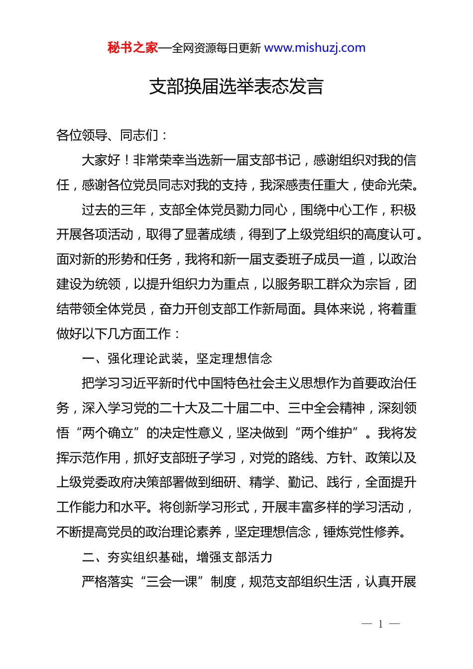 秘书之家—全网资源每日更新 www.mishuzj.com支部换届选举表态发言各位领导、同志们:大家好!非常荣幸当选新一届支部书记,感谢组织对我的信任,感谢各位党员同志对我的支持,我深感责任重大,使命光荣。过去的三年,支部全体党员勠力同心,围绕中心工作,积极开展各项活动,取得了显著成绩,得到了上级党组织的高度认可。面对新的形势和任务,我将和新一届支委班子成员一道,以政治建设为统领,以提升组织力为重点,以服务职工群众为宗旨,团结带领全体党员,奋力开创支部工作新局面。具体来说,将着重做好以下几方面工作:一、强化理论武装,坚定理想信念把学习习近平新时代中国特色社会主义思想作为首要政治任务,深入学习党的二十大及二十届二中、三中全会精神,深刻领悟“两个确立”的决定性意义,坚决做到“两个维护”。我将发挥示范作用,抓好支部班子学习,对党的路线、方针、政策以及上级党委政府决策部署做到细研、精学、勤记、践行,全面提升工作能力和水平。将创新学习形式,开展丰富多样的学习活动,不断提高党员的政治理论素养,坚定理想信念,锤炼党性修养。二、夯实组织基础,增强支部活力严格落实“三会一课”制度,规范支部组织生活,认真开展— 1 —秘书之家—全网资源每日更新 www.mishuzj.com批评和自我批评,增强党内政治生活的政治性。积极探索新时代党建工作模式,创新活动载体,丰富活动内容,增强支部活动的吸引力和实效性,不断提升支部的凝聚力和战斗力。高度重视发展党员工作,严格按照党员发展程序,吸纳优秀人才加入党组织。认真学习贯彻党风廉政建设的各项规定,加强党员的廉洁自律教育,定期开展警示教育活动,引导党员以案为鉴,警钟长鸣,营造风清气正的良好政治生态。三、发挥先锋模范作用,服务中心大局紧紧围绕项目建设大局,坚持党建引领,加强支部政治建设、组织建设、作风建设,不断发挥支部战斗堡垒作用。积极引导党员立足岗位,发挥先锋模范作用,在各项工作中走在前列、干在实处。扎实开展“党员先锋岗”创建活动,鼓励党员在各自的工作岗位上建功立业。密切联系职工群众,倾听职工群众呼声,帮助他们解决实际困难,切实发挥党支部的战斗堡垒作用。我深知,个人的力量是有限的,做好以上工作,需要全体党员的共同努力。我将倍加珍惜大家的信任和支持,与新一届支委班子成员一道,紧紧依靠全体党员,同心同德、群策群力,不断提升支部建设水平,为公司高质量发展提供坚实保障。我们也真诚地希望各位党员同志一如既往地支持支部的工作,积极建言献策,共同为支部建设贡献力量。谢谢大家!— 2 —