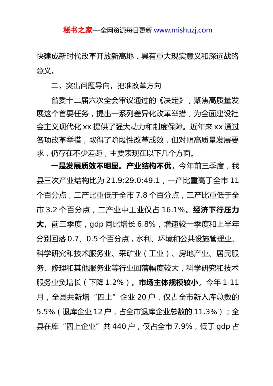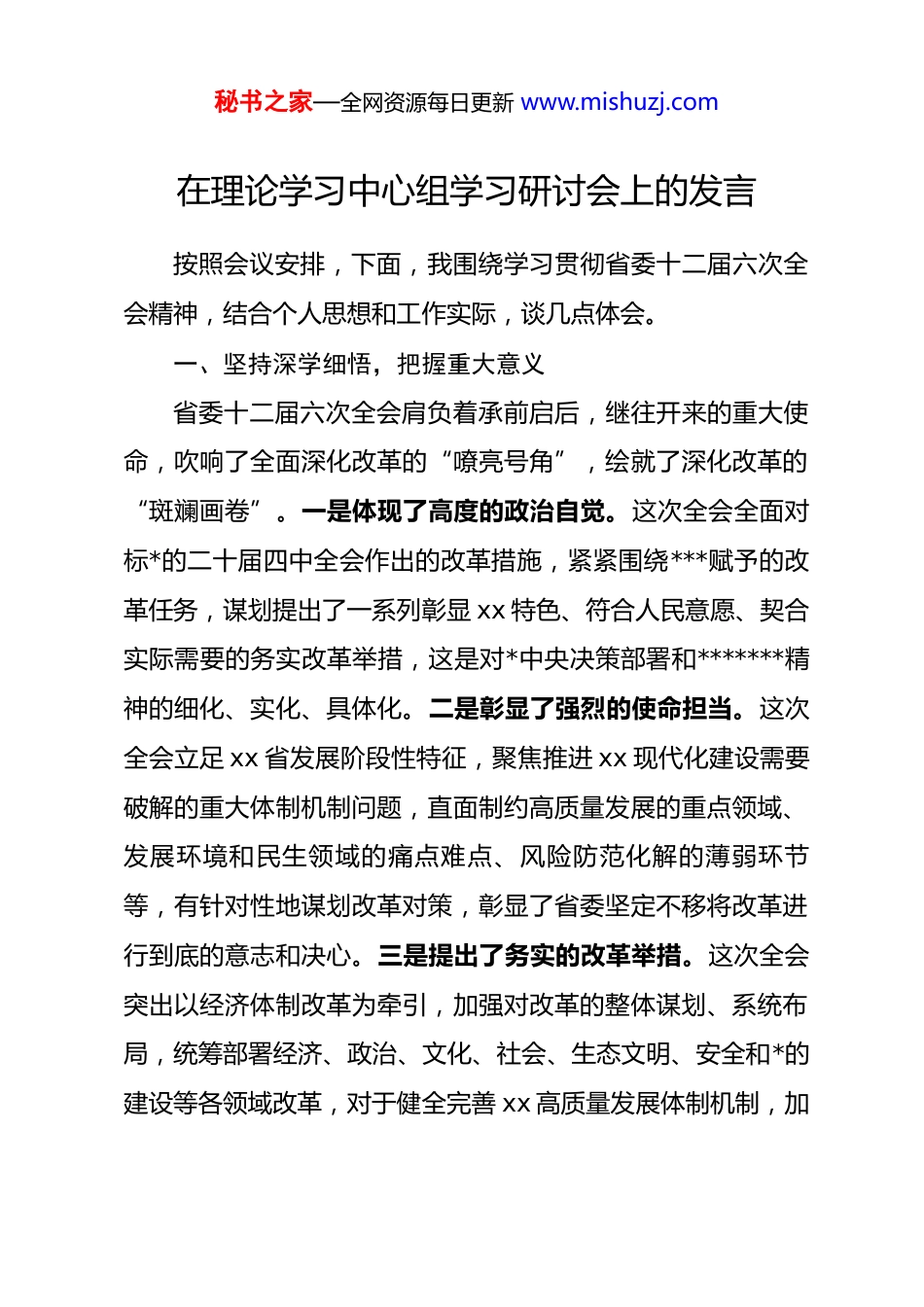 秘书之家—全网资源每日更新 www.mishuzj.com在理论学习中心组学习研讨会上的发言按照会议安排,下面,我围绕学习贯彻省委十二届六次全会精神,结合个人思想和工作实际,谈几点体会。一、坚持深学细悟,把握重大意义省委十二届六次全会肩负着承前启后,继往开来的重大使命,吹响了全面深化改革的“嘹亮号角”,绘就了深化改革的“斑斓画卷”。一是体现了高度的政治自觉。这次全会全面对标*的二十届四中全会作出的改革措施,紧紧围绕***赋予的改革任务,谋划提出了一系列彰显 xx 特色、符合人民意愿、契合实际需要的务实改革举措,这是对*中央决策部署和*******精神的细化、实化、具体化。二是彰显了强烈的使命担当。这次全会立足 xx 省发展阶段性特征,聚焦推进 xx 现代化建设需要破解的重大体制机制问题,直面制约高质量发展的重点领域、发展环境和民生领域的痛点难点、风险防范化解的薄弱环节等,有针对性地谋划改革对策,彰显了省委坚定不移将改革进行到底的意志和决心。三是提出了务实的改革举措。这次全会突出以经济体制改革为牵引,加强对改革的整体谋划、系统布局,统筹部署经济、政治、文化、社会、生态文明、安全和*的建设等各领域改革,对于健全完善 xx 高质量发展体制机制,加秘书之家—全网资源每日更新 www.mishuzj.com快建成新时代改革开放新高地,具有重大现实意义和深远战略意义。二、突出问题导向,把准改革方向省委十二届六次全会审议通过的《决定》,聚焦高质量发展这个首要任务,提出一系列差异化改革举措,为全面建设社会主义现代化 xx 提供了强大动力和制度保障。近年来 xx 通过各项改革举措,取得了阶段性改革成效,但对照高质量发展要求,仍存在不少差距,主要表现在以下几个方面。一是发展质效不明显。产业结构不优,今年前三季度,我县三次产业结构比为 21.9:29.0:49.1,一产比重高于全市 11个百分点,二产比重低于全市 7.8 个百分点,三产比重低于全市 3.2 个百分点,二产业中工业仅占 16.1%。经济下行压力大,前三季度,gdp 同比增长 6.8%,增速较一季度和上半年分别回落 0.7、0.5 个百分点,水利、环境和公共设施管理业、科学研究和技术服务业、采矿业(工业)、房地产业、居民服务、修理和其他服务业等行业回落幅度较大,科学研究和技术服务业负增长(下降 1.2%)。市场主体规模较小,今年 1-11月,全县共新增“四上”企业 20 户,仅占全市新入库总数的5.5%(退库企业 12 户,占全市退库企业总数的 11.3%);全县在库“四上企业”共 440 户,仅占全市 7.9%,低于 gdp 占秘书之家—全网资源每日更新 www.mishuzj.com全市比重 5.2 个百分点。工业园区内产值 10 亿元以上企业仅有 3 户,暂无 50 亿元级龙头企业,支撑带动作用不突出。重点项目推进滞后,目前,3 个预算内项目未按时序进度推进;16 个专项债项目、20xx 年 6 个增发国债项目资金支付进度滞后。文旅资源利用不够,全县仅 3 家 a 级旅游景区且最高为 3a级,消费集聚区、新业态等建设滞后,一大批资源知名度、影响力挖掘不足,前三季度文化、体育和娱乐业对 gdp 的贡献率仅为 1.4%。二是城乡融合不紧密。基础设施方面,乡村在能源、供水、污水处理等方面远落后于城市,农田水利设施老化损毁严重、渠道渗漏、灌溉效率低等问题亟待解决,城乡结合部污水管网老旧破损,充电桩等设施还不完善。基本公共服务方面,城乡在教育、医疗、养老等公共服务配套设施规划制定上还缺乏统筹,城市公共服务覆盖面广、服务质量相对较高,而乡村在公共服务配套设施建设上相对滞后,普遍面临着资金短缺、人才不足等难题。乡镇经济发展方面,xx 人多地广,受地理位置、资源禀赋等多因素影响,部分乡镇主导产业优势不明显且无特色产业支撑,各乡镇经济发展还存在不平衡、不充分等问题。三是底线防线不牢固。安全隐患治理方面,道路交通安全秘书之家—全网资源每日更新 www.mishuzj.com隐患依然突出,今年以来全县发生一般程序道路交通事故 270余起、同比上升 1.49%,消防、燃气、自建房等重点领域,安全隐患仍然不同程度地存在。生态环境保护方面...
