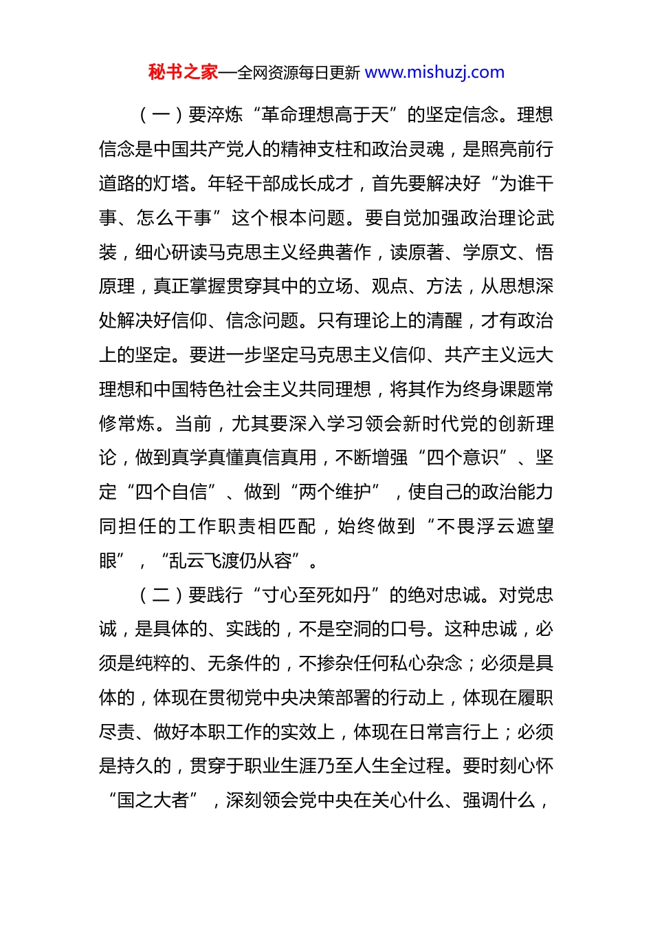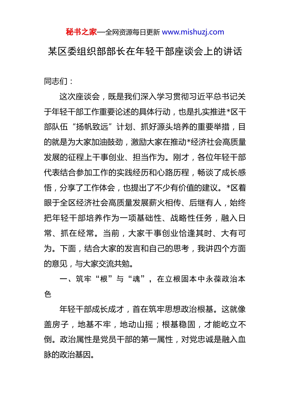 秘书之家—全网资源每日更新 www.mishuzj.com某区委组织部部长在年轻干部座谈会上的讲话 同志们:这次座谈会,既是我们深入学习贯彻习近平总书记关于年轻干部工作重要论述的具体行动,也是扎实推进*区干部队伍“扬帆致远”计划、抓好源头培养的重要举措,目的就是为大家加油鼓劲,激励大家在推动*经济社会高质量发展的征程上干事创业、担当作为。刚才,各位年轻干部代表结合参加工作的实践经历和心路历程,畅谈了成长感悟,分享了工作体会,也提出了不少有价值的建议。*区着眼于全区经济社会高质量发展薪火相传、后继有人,始终把年轻干部培养作为一项基础性、战略性任务,融入日常、抓在经常。当前,大家干事创业恰逢其时、大有可为。下面,结合大家的发言和自己的思考,我讲四个方面的意见,与大家交流共勉。一、筑牢“根”与“魂”,在立根固本中永葆政治本色年轻干部成长成才,首在筑牢思想政治根基。这就像盖房子,地基不牢,地动山摇;根基稳固,才能屹立不倒。政治属性是党员干部的第一属性,对党忠诚是融入血脉的政治基因。秘书之家—全网资源每日更新 www.mishuzj.com(一)要淬炼“革命理想高于天”的坚定信念。理想信念是中国共产党人的精神支柱和政治灵魂,是照亮前行道路的灯塔。年轻干部成长成才,首先要解决好“为谁干事、怎么干事”这个根本问题。要自觉加强政治理论武装,细心研读马克思主义经典著作,读原著、学原文、悟原理,真正掌握贯穿其中的立场、观点、方法,从思想深处解决好信仰、信念问题。只有理论上的清醒,才有政治上的坚定。要进一步坚定马克思主义信仰、共产主义远大理想和中国特色社会主义共同理想,将其作为终身课题常修常炼。当前,尤其要深入学习领会新时代党的创新理论,做到真学真懂真信真用,不断增强“四个意识”、坚定“四个自信”、做到“两个维护”,使自己的政治能力同担任的工作职责相匹配,始终做到“不畏浮云遮望眼”,“乱云飞渡仍从容”。(二)要践行“寸心至死如丹”的绝对忠诚。对党忠诚,是具体的、实践的,不是空洞的口号。这种忠诚,必须是纯粹的、无条件的,不掺杂任何私心杂念;必须是具体的,体现在贯彻党中央决策部署的行动上,体现在履职尽责、做好本职工作的实效上,体现在日常言行上;必须是持久的,贯穿于职业生涯乃至人生全过程。要时刻心怀“国之大者”,深刻领会党中央在关心什么、强调什么,秘书之家—全网资源每日更新 www.mishuzj.com深刻领会什么是党和国家最重要的利益、什么是最需要坚定维护的立场,自觉在思想上政治上行动上同以习近平同志为核心的党中央保持高度一致。要严守党的政治纪律和政治规矩,做到党中央提倡的坚决响应、党中央决定的坚决执行、党中央禁止的坚决不做,决不搞上有政策、下有对策,决不搞有令不行、有禁不止,以“一片丹心向阳开”的赤诚,把对党的忠诚落实到推动*发展的具体实践中。(三)要提升“一览众山小”的政治站位。站得高,才能看得远;想得深,才能做得实。年轻干部要善于从政治高度观察问题、分析问题、处理问题,不断提高政治判断力、政治领悟力、政治执行力。看问题要多放眼全局,干工作要多算大账、长远账,不能局限于自己的一亩三分地,要自觉把本职工作放到全区、全市乃至全国发展大局中去思考、去谋划、去推进。比如,在推动一项具体改革时,不能只算部门账、眼前账,更要算好整体账、长远账,看是否符合新发展理念,是否有利于*的长远发展和人民群众的根本利益。要增强政治敏锐性和政治鉴别力,在复杂形势面前保持清醒头脑,在大是大非面前敢于亮剑,确保各项工作沿着正确的政治方向前进,做到“既为一域争光,更为全局添彩”。秘书之家—全网资源每日更新 www.mishuzj.com二、锤炼“胆”与“识”,在摸爬滚打中增长才干本领干部干部,“干”字当头。干事担事,是干部的职责所在,也是价值所在。年轻干部最大的优势是朝气蓬勃,最具潜力的是可塑性强,最需补齐的是经验短板。要想在未来挑重担、扛大梁,必须在实践中经风雨、见世面、壮筋骨、长才干。(一)要砥砺“敢教日月换新天”的担当魄力。担当是时代赋予年轻干部的鲜明气质。党和人民把岗位交到我...