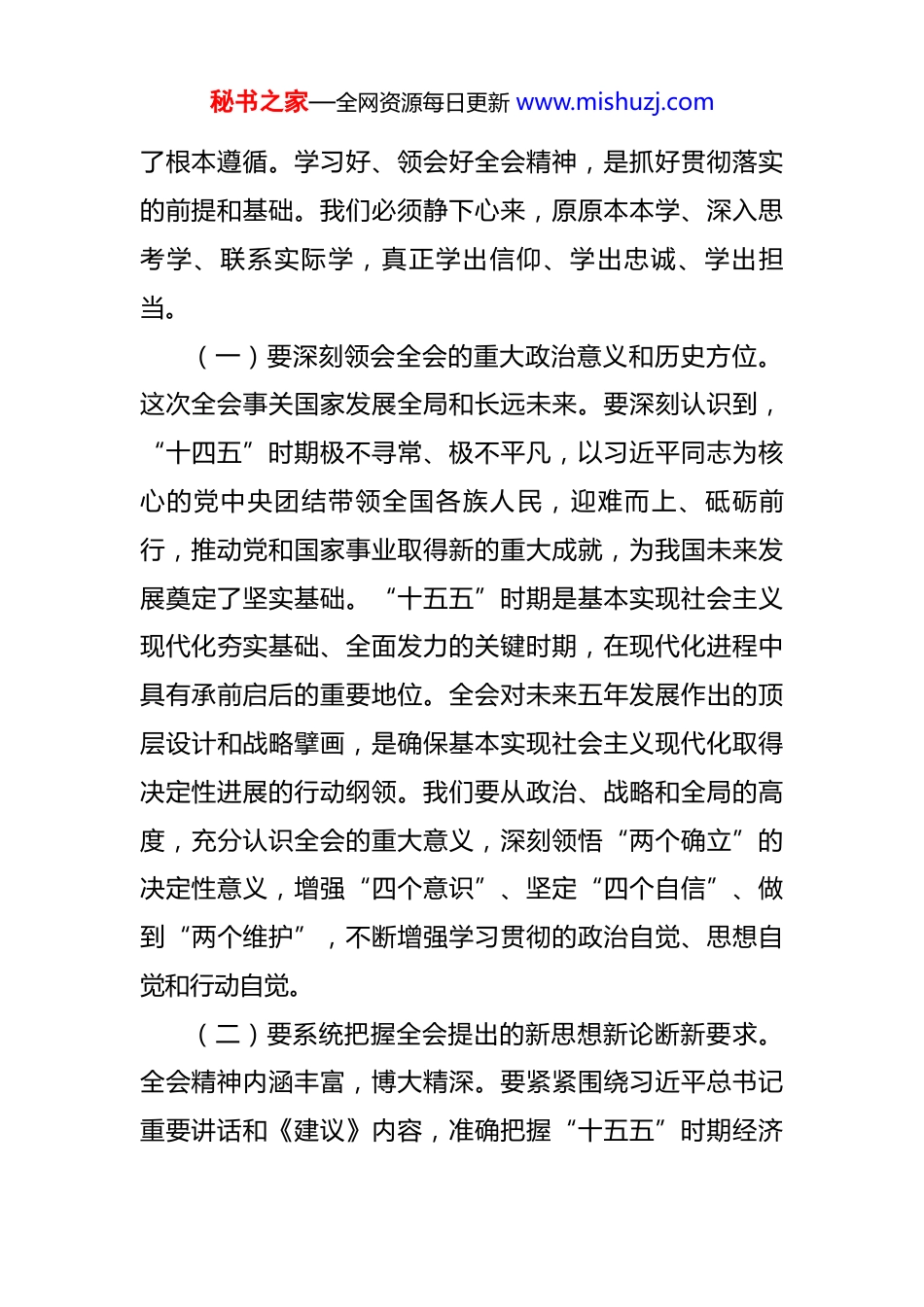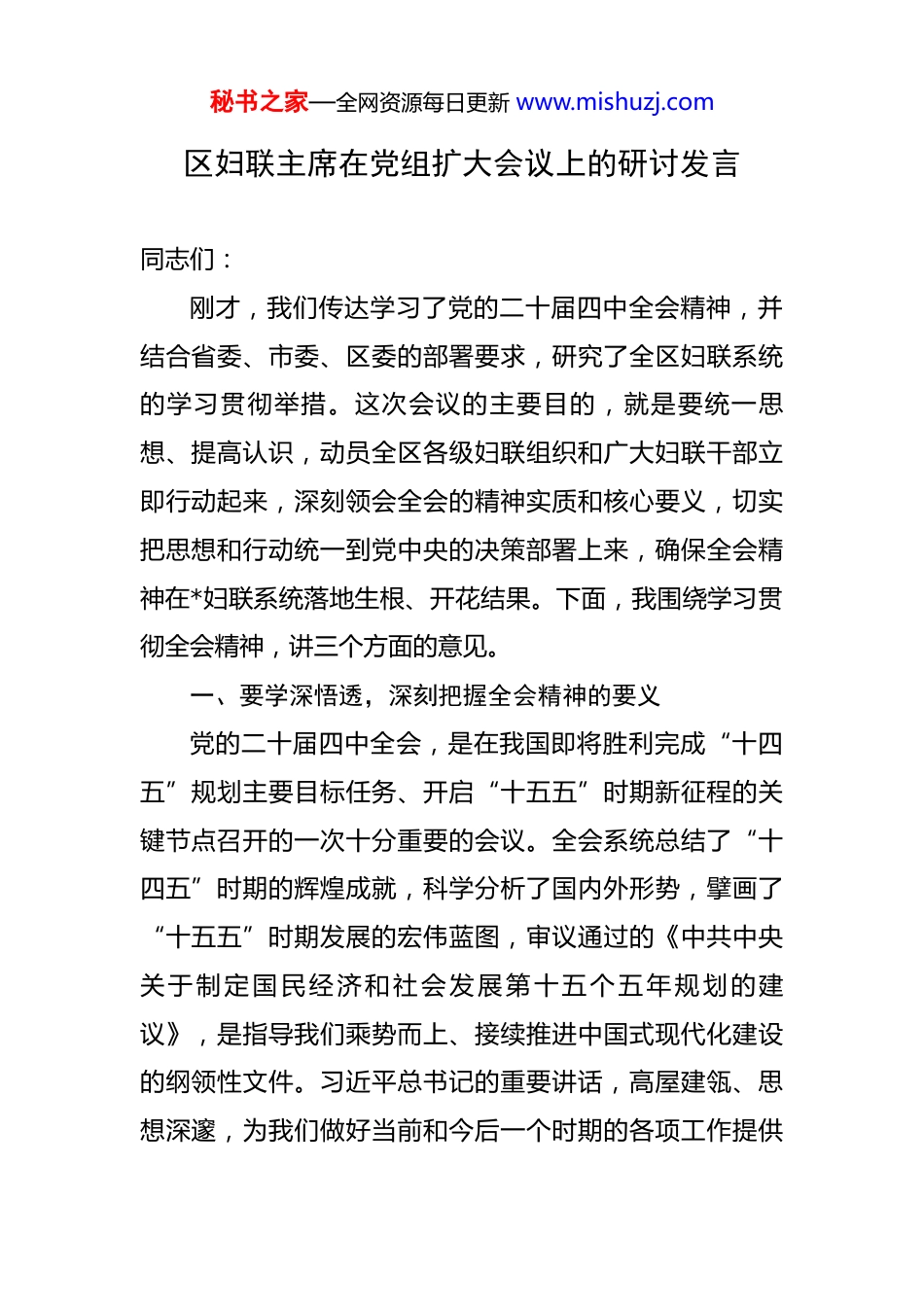 秘书之家—全网资源每日更新 www.mishuzj.com区妇联主席在党组扩大会议上的研讨发言 同志们:刚才,我们传达学习了党的二十届四中全会精神,并结合省委、市委、区委的部署要求,研究了全区妇联系统的学习贯彻举措。这次会议的主要目的,就是要统一思想、提高认识,动员全区各级妇联组织和广大妇联干部立即行动起来,深刻领会全会的精神实质和核心要义,切实把思想和行动统一到党中央的决策部署上来,确保全会精神在*妇联系统落地生根、开花结果。下面,我围绕学习贯彻全会精神,讲三个方面的意见。一、要学深悟透,深刻把握全会精神的要义党的二十届四中全会,是在我国即将胜利完成“十四五”规划主要目标任务、开启“十五五”时期新征程的关键节点召开的一次十分重要的会议。全会系统总结了“十四五”时期的辉煌成就,科学分析了国内外形势,擘画了“十五五”时期发展的宏伟蓝图,审议通过的《中共中央关于制定国民经济和社会发展第十五个五年规划的建议》,是指导我们乘势而上、接续推进中国式现代化建设的纲领性文件。习近平总书记的重要讲话,高屋建瓴、思想深邃,为我们做好当前和今后一个时期的各项工作提供秘书之家—全网资源每日更新 www.mishuzj.com了根本遵循。学习好、领会好全会精神,是抓好贯彻落实的前提和基础。我们必须静下心来,原原本本学、深入思考学、联系实际学,真正学出信仰、学出忠诚、学出担当。(一)要深刻领会全会的重大政治意义和历史方位。这次全会事关国家发展全局和长远未来。要深刻认识到,“十四五”时期极不寻常、极不平凡,以习近平同志为核心的党中央团结带领全国各族人民,迎难而上、砥砺前行,推动党和国家事业取得新的重大成就,为我国未来发展奠定了坚实基础。“十五五”时期是基本实现社会主义现代化夯实基础、全面发力的关键时期,在现代化进程中具有承前启后的重要地位。全会对未来五年发展作出的顶层设计和战略擘画,是确保基本实现社会主义现代化取得决定性进展的行动纲领。我们要从政治、战略和全局的高度,充分认识全会的重大意义,深刻领悟“两个确立”的决定性意义,增强“四个意识”、坚定“四个自信”、做到“两个维护”,不断增强学习贯彻的政治自觉、思想自觉和行动自觉。(二)要系统把握全会提出的新思想新论断新要求。全会精神内涵丰富,博大精深。要紧紧围绕习近平总书记重要讲话和《建议》内容,准确把握“十五五”时期经济秘书之家—全网资源每日更新 www.mishuzj.com社会发展的指导方针、主要目标和重点任务。要深刻理解高质量发展是首要任务,科技自立自强是战略支撑,全面深化改革是根本动力,人民生活品质是价值追求,美丽中国是生态底色,国家安全是坚强保障。要准确把握《建议》中关于建设现代化产业体系、加快高水平科技自立自强、建设强大国内市场、促进区域协调发展、扩大高水平对外开放、加快农业农村现代化、繁荣发展社会主义文化、加大民生保障力度、建设美丽中国、统筹发展和安全等一系列战略部署。对这些新部署新要求,要逐条学习、深入研讨,做到融会贯通、了然于胸。(三)要紧密联系妇女儿童事业和妇联工作实际。学习全会精神,最终要落脚到推动工作上。要深刻领会全会对保障妇女儿童合法权益、促进男女平等和妇女儿童全面发展,以及发挥群团组织作用等方面提出的明确要求。要清醒认识妇联组织在推进中国式现代化进程中肩负的光荣使命和重大责任。要将学习全会精神与学习贯彻习近平总书记在全球妇女峰会上的主旨讲话精神、关于妇女儿童和妇联工作的重要论述结合起来,深入思考新时代新征程妇联工作的方位方向、着力重点、方法路径。要对照全会提出的重大战略任务,特别是涉及妇女、儿童、家庭的目标任务,找准妇联工作的切入点、结合点和着力点,思考如秘书之家—全网资源每日更新 www.mishuzj.com何更好地服务大局、服务妇女、服务家庭。(四)要汲取成就经验坚定发展信心决心。“十四五”时期重大成就的取得,根本在于以习近平同志为核心的党中央领航掌舵,在于习近平新时代中国特色社会主义思想科学指引。实践再次证明,“两个确立”对于我们应对各种风险挑战、推进中国式现代化建设具有决...