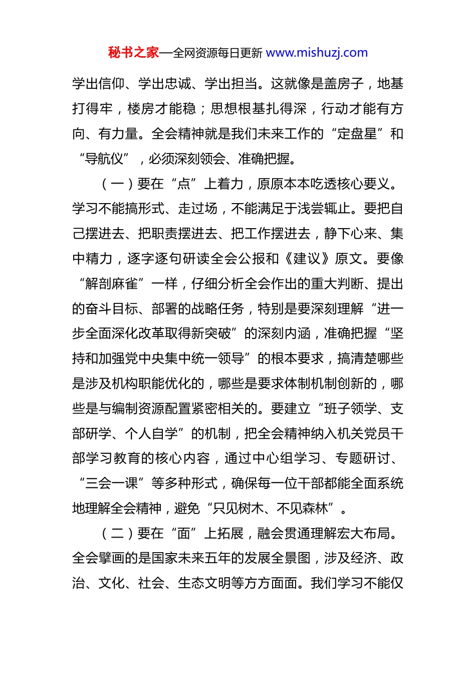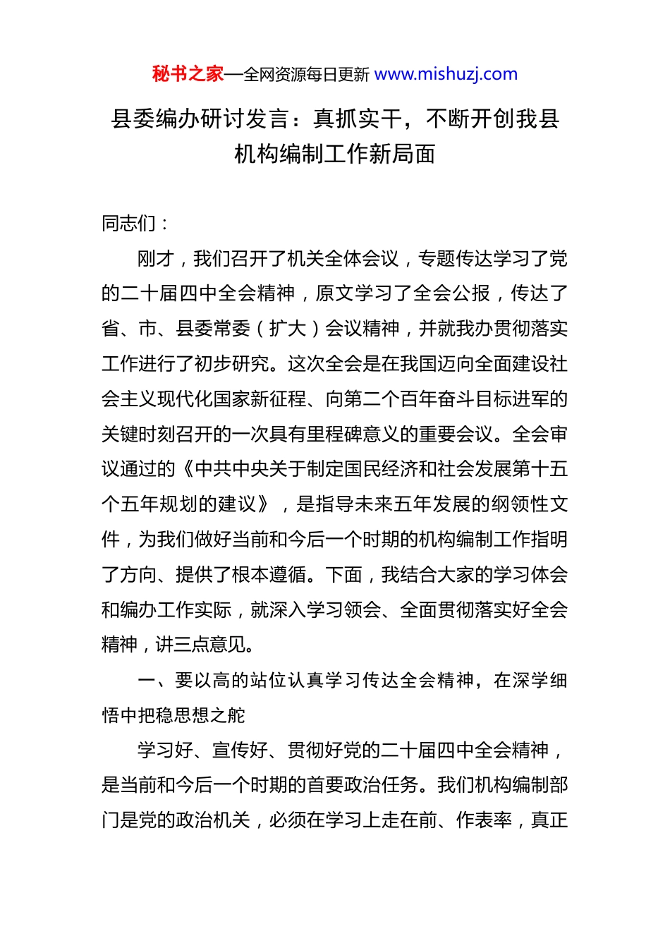 秘书之家—全网资源每日更新 www.mishuzj.com县委编办研讨发言:真抓实干,不断开创我县机构编制工作新局面 同志们:刚才,我们召开了机关全体会议,专题传达学习了党的二十届四中全会精神,原文学习了全会公报,传达了省、市、县委常委(扩大)会议精神,并就我办贯彻落实工作进行了初步研究。这次全会是在我国迈向全面建设社会主义现代化国家新征程、向第二个百年奋斗目标进军的关键时刻召开的一次具有里程碑意义的重要会议。全会审议通过的《中共中央关于制定国民经济和社会发展第十五个五年规划的建议》,是指导未来五年发展的纲领性文件,为我们做好当前和今后一个时期的机构编制工作指明了方向、提供了根本遵循。下面,我结合大家的学习体会和编办工作实际,就深入学习领会、全面贯彻落实好全会精神,讲三点意见。一、要以高的站位认真学习传达全会精神,在深学细悟中把稳思想之舵学习好、宣传好、贯彻好党的二十届四中全会精神,是当前和今后一个时期的首要政治任务。我们机构编制部门是党的政治机关,必须在学习上走在前、作表率,真正秘书之家—全网资源每日更新 www.mishuzj.com学出信仰、学出忠诚、学出担当。这就像是盖房子,地基打得牢,楼房才能稳;思想根基扎得深,行动才能有方向、有力量。全会精神就是我们未来工作的“定盘星”和“导航仪”,必须深刻领会、准确把握。(一)要在“点”上着力,原原本本吃透核心要义。学习不能搞形式、走过场,不能满足于浅尝辄止。要把自己摆进去、把职责摆进去、把工作摆进去,静下心来、集中精力,逐字逐句研读全会公报和《建议》原文。要像“解剖麻雀”一样,仔细分析全会作出的重大判断、提出的奋斗目标、部署的战略任务,特别是要深刻理解“进一步全面深化改革取得新突破”的深刻内涵,准确把握“坚持和加强党中央集中统一领导”的根本要求,搞清楚哪些是涉及机构职能优化的,哪些是要求体制机制创新的,哪些是与编制资源配置紧密相关的。要建立“班子领学、支部研学、个人自学”的机制,把全会精神纳入机关党员干部学习教育的核心内容,通过中心组学习、专题研讨、“三会一课”等多种形式,确保每一位干部都能全面系统地理解全会精神,避免“只见树木、不见森林”。(二)要在“面”上拓展,融会贯通理解宏大布局。全会擘画的是国家未来五年的发展全景图,涉及经济、政治、文化、社会、生态文明等方方面面。我们学习不能仅秘书之家—全网资源每日更新 www.mishuzj.com仅盯着与机构编制直接相关的表述,更要树立全局视野,把机构编制工作放到党和国家事业发展的大局中去思考、去谋划。要深刻认识“十五五”时期我国发展环境的“变”与“不变”,准确把握高质量发展是全面建设社会主义现代化国家的首要任务,科技自立自强是国家安全和发展的战略支撑,扩大内需是构建新发展格局的战略基点,全面深化改革是根本动力,等等。只有理解了这些重大战略部署之间的内在联系和逻辑关系,我们才能更好地找准机构编制工作的切入点和着力点,使我们的资源配置、职能优化更好地服务于中心大局,避免就机构论机构、就编制论编制的狭隘思维。(三)要在“体”上建构,联系实际形成工作思路。学习的最终目的是为了应用。我们要大力弘扬理论联系实际的学风,把学习全会精神与学习习近平总书记关于机构编制工作的重要论述结合起来,与当前我县改革发展稳定的实际结合起来,与我们编办承担的具体任务结合起来。要聚焦全会提出的七大发展目标,比如建设现代化产业体系、加快高水平科技自立自强、促进区域协调发展、加大民生保障力度等,深入思考这些领域对我们机构职能体系、体制机制、编制资源配置提出了哪些新要求新挑战。要围绕“健全与中国式现代化实践相适应的机构职能体系秘书之家—全网资源每日更新 www.mishuzj.com和体制机制”这一目标,提前调研、超前谋划,思考如何持续做好机构改革“后半篇”文章,如何使机构设置更加科学、职能更加优化、权责更加协同、运行更加高效、监管更加有力。这种联系实际的学习,才能让全会精神从“纸面”落到“地面”,真正转化为推动工作的具体思路和务实举措。(四)要在“魂”上筑牢,深刻领悟强...