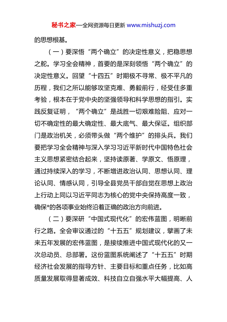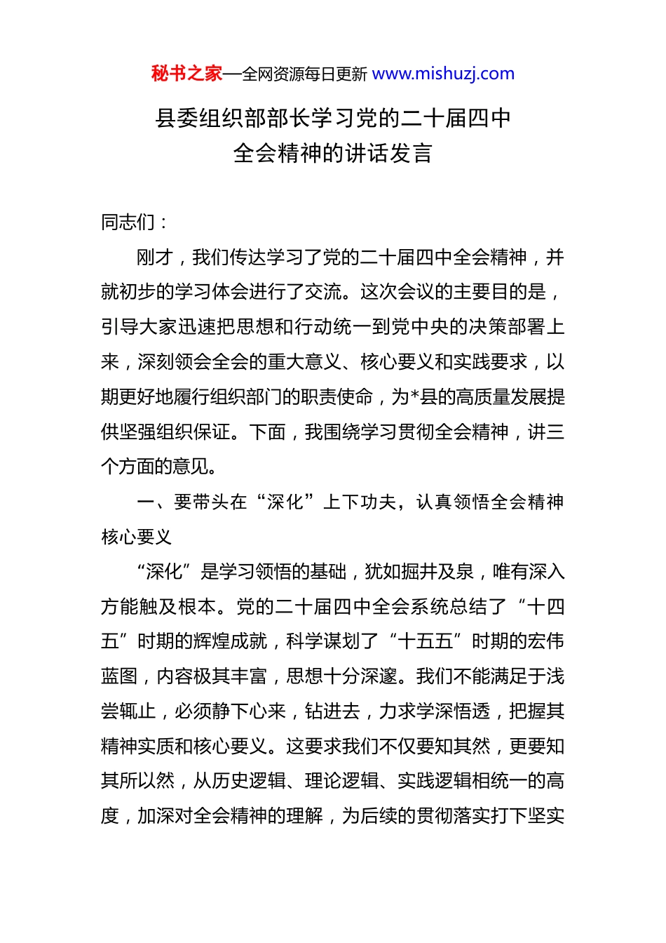 秘书之家—全网资源每日更新 www.mishuzj.com县委组织部部长学习党的二十届四中全会精神的讲话发言 同志们:刚才,我们传达学习了党的二十届四中全会精神,并就初步的学习体会进行了交流。这次会议的主要目的是,引导大家迅速把思想和行动统一到党中央的决策部署上来,深刻领会全会的重大意义、核心要义和实践要求,以期更好地履行组织部门的职责使命,为*县的高质量发展提供坚强组织保证。下面,我围绕学习贯彻全会精神,讲三个方面的意见。一、要带头在“深化”上下功夫,认真领悟全会精神核心要义“深化”是学习领悟的基础,犹如掘井及泉,唯有深入方能触及根本。党的二十届四中全会系统总结了“十四五”时期的辉煌成就,科学谋划了“十五五”时期的宏伟蓝图,内容极其丰富,思想十分深邃。我们不能满足于浅尝辄止,必须静下心来,钻进去,力求学深悟透,把握其精神实质和核心要义。这要求我们不仅要知其然,更要知其所以然,从历史逻辑、理论逻辑、实践逻辑相统一的高度,加深对全会精神的理解,为后续的贯彻落实打下坚实秘书之家—全网资源每日更新 www.mishuzj.com的思想根基。(一)要深悟“两个确立”的决定性意义,把稳思想之舵。学习全会精神,首要的是深刻领悟“两个确立”的决定性意义。回望“十四五”时期极不寻常、极不平凡的历程,我们之所以能够攻坚克难、勇毅前行,经受住多重考验,根本在于党中央的坚强领导和科学思想的指引。实践反复证明,“两个确立”是战胜一切艰难险阻、应对一切不确定性的最大确定性、最大底气、最大保证。组织部门是政治机关,必须带头做“两个维护”的排头兵。我们要把学习全会精神与深入学习习近平新时代中国特色社会主义思想紧密结合起来,坚持读原著、学原文、悟原理,通过持续深入的学习,不断增进政治认同、思想认同、理论认同、情感认同,引导全县党员干部自觉在思想上政治上行动上同以习近平同志为核心的党中央保持高度一致,确保*的各项事业始终沿着正确的政治方向前进。(二)要深研“中国式现代化”的宏伟蓝图,明晰前行之路。全会审议通过的“十五五”规划建议,擘画了未来五年发展的宏伟蓝图,是接续推进中国式现代化的又一次总动员、总部署。这份蓝图系统阐述了“十五五”时期经济社会发展的指导方针、主要目标和重点任务,比如高质量发展取得显著成效、科技自立自强水平大幅提高、人秘书之家—全网资源每日更新 www.mishuzj.com民生活品质不断提高等。我们要全面、系统、深入地研究这份蓝图,深刻理解“中国式现代化”的丰富内涵和本质要求,准确把握*在全国、全省、全市发展大局中的方位和使命。这好比远航需要精准的海图,只有把蓝图研究透彻,我们才能在服务大局中找准组织工作的切入点和着力点,使我们的各项工作更好契合中央的战略意图和地方的现实需求。(三)要深察“时与势”的发展变化,保持战略清醒。全会深入分析了我国发展环境面临的深刻复杂变化,指出我国发展处于战略机遇和风险挑战并存、不确定难预料因素增多的时期。这是一种基于现实的科学判断。作为组织部门的干部,我们不仅要埋头拉车,更要抬头看路,要具备敏锐的洞察力,深刻认识当前国际国内形势的深刻变化,理解新发展阶段的新特征新要求。这就要求我们保持战略定力,增强忧患意识,提高运用战略思维、系统思维、底线思维观察形势、分析问题、谋划工作的水平。在干部选拔、人才培养、组织建设等工作中,都要充分考虑“时与势”的影响,做到未雨绸缪,精准施策,以组织工作的确定性来应对发展环境的不确定性。(四)要深解“进一步全面深化改革”的内在要求,激发内生动力。全会将“进一步全面深化改革取得新突秘书之家—全网资源每日更新 www.mishuzj.com破”列为“十五五”时期的主要目标之一。改革是发展的根本动力。组织工作本身也是改革的重要内容,同时也是改革的重要保障。我们要深刻领会全会关于全面深化改革,特别是深化党的建设制度改革的重要部署。要明白,改革越深入,对组织工作提出的要求就越高。比如,如何更好地坚持和加强党的全面领导,如何优化干部选育管用机制,如何破解人才发展体制机制障碍,如何增强基层党组织的政治...