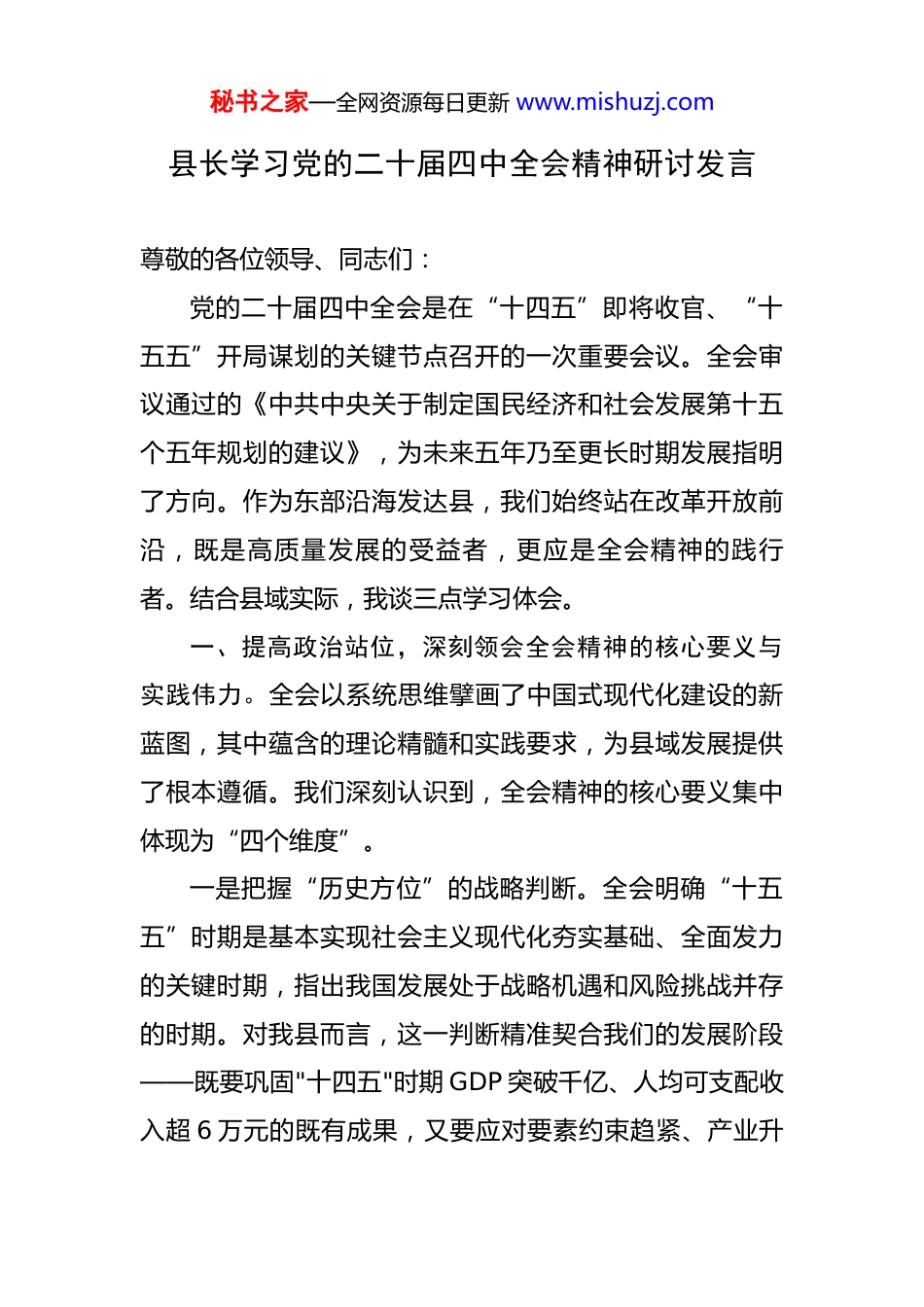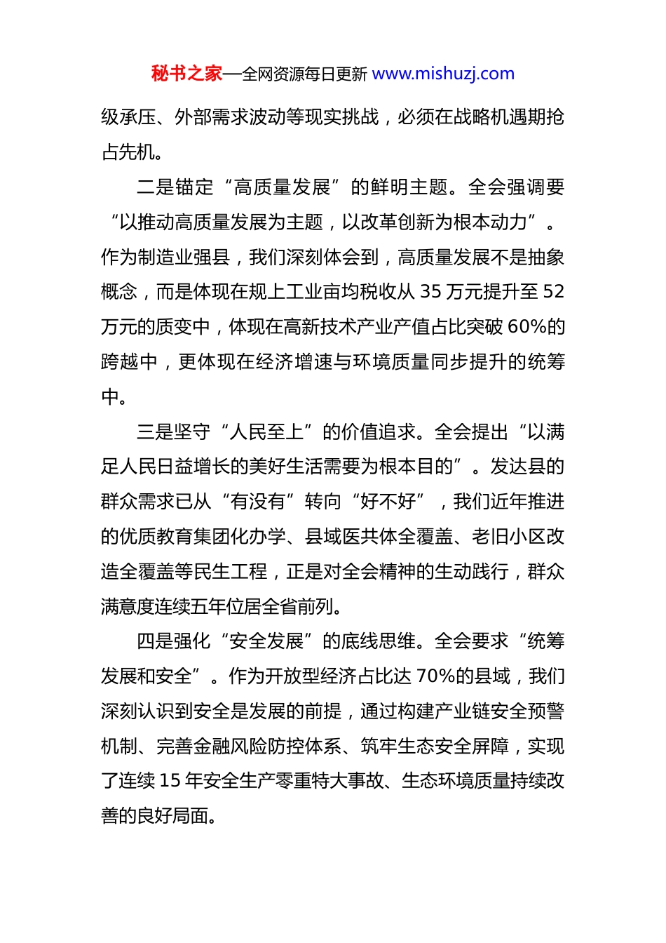 秘书之家—全网资源每日更新 www.mishuzj.com县长学习党的二十届四中全会精神研讨发言 尊敬的各位领导、同志们:党的二十届四中全会是在“十四五”即将收官、“十五五”开局谋划的关键节点召开的一次重要会议。全会审议通过的《中共中央关于制定国民经济和社会发展第十五个五年规划的建议》,为未来五年乃至更长时期发展指明了方向。作为东部沿海发达县,我们始终站在改革开放前沿,既是高质量发展的受益者,更应是全会精神的践行者。结合县域实际,我谈三点学习体会。一、提高政治站位,深刻领会全会精神的核心要义与实践伟力。全会以系统思维擘画了中国式现代化建设的新蓝图,其中蕴含的理论精髓和实践要求,为县域发展提供了根本遵循。我们深刻认识到,全会精神的核心要义集中体现为“四个维度”。一是把握“历史方位”的战略判断。全会明确“十五五”时期是基本实现社会主义现代化夯实基础、全面发力的关键时期,指出我国发展处于战略机遇和风险挑战并存的时期。对我县而言,这一判断精准契合我们的发展阶段——既要巩固"十四五"时期 GDP 突破千亿、人均可支配收入超 6 万元的既有成果,又要应对要素约束趋紧、产业升秘书之家—全网资源每日更新 www.mishuzj.com级承压、外部需求波动等现实挑战,必须在战略机遇期抢占先机。二是锚定“高质量发展”的鲜明主题。全会强调要“以推动高质量发展为主题,以改革创新为根本动力”。作为制造业强县,我们深刻体会到,高质量发展不是抽象概念,而是体现在规上工业亩均税收从 35 万元提升至 52万元的质变中,体现在高新技术产业产值占比突破 60%的跨越中,更体现在经济增速与环境质量同步提升的统筹中。三是坚守“人民至上”的价值追求。全会提出“以满足人民日益增长的美好生活需要为根本目的”。发达县的群众需求已从“有没有”转向“好不好”,我们近年推进的优质教育集团化办学、县域医共体全覆盖、老旧小区改造全覆盖等民生工程,正是对全会精神的生动践行,群众满意度连续五年位居全省前列。四是强化“安全发展”的底线思维。全会要求“统筹发展和安全”。作为开放型经济占比达 70%的县域,我们深刻认识到安全是发展的前提,通过构建产业链安全预警机制、完善金融风险防控体系、筑牢生态安全屏障,实现了连续 15 年安全生产零重特大事故、生态环境质量持续改善的良好局面。秘书之家—全网资源每日更新 www.mishuzj.com二、锚定高质量发展,把全会精神转化为县域实践的过硬成效。贯彻全会精神,关键要在转化落实上见真章。我们将立足东部发达县的基础优势,聚焦全会部署的重点任务,重点抓好“四个攻坚”。(一)攻坚科技创新,激活新质生产力引擎。全会提出“加快高水平科技自立自强,引领发展新质生产力”。我们将打造“三位一体”创新生态:一是建强创新平台,深化与中科院、清华等 12 所高校的合作,推进总投资 50亿元的先进制造研究院建设,年内实现省级以上科创平台全覆盖;二是强化企业主体,实施高新技术企业“倍增计划”,今年新增规上工业企业研发机构 50 家,推动龙头企业牵头组建 3 个产业技术创新联盟,研发投入占 GDP 比重提升至 3.8%;三是集聚创新人才,推行"人才飞地+项目合作"模式,设立 1 亿元人才发展基金,重点引进集成电路、生物医药等领域的"高精尖缺"人才,年内新增国家级人才 5 名以上。(二)攻坚产业升级,构建现代化产业体系。全会要求“建设现代化产业体系,巩固壮大实体经济根基”。我们将聚焦"智造强县"目标,推动产业向“高端化、智能化、绿色化”转型:一是做强主导产业,推动汽车零部件、智能装备两大千亿产业集群向价值链高端攀升,实施总投资秘书之家—全网资源每日更新 www.mishuzj.com300 亿元的 15 个技改项目,年内实现规上工业数字化改造全覆盖;二是培育新兴产业,设立 20 亿元新兴产业基金,重点发展新能源、半导体、工业机器人等产业,力争年内新兴产业产值突破 400 亿元;三是提升服务业质效,推动生产性服务业与制造业深度融合,建设跨境电商综合服务平台,目标全年跨境电商交易额突破 200 亿元,现代服务业占比提升至 48%。(三)攻坚开...