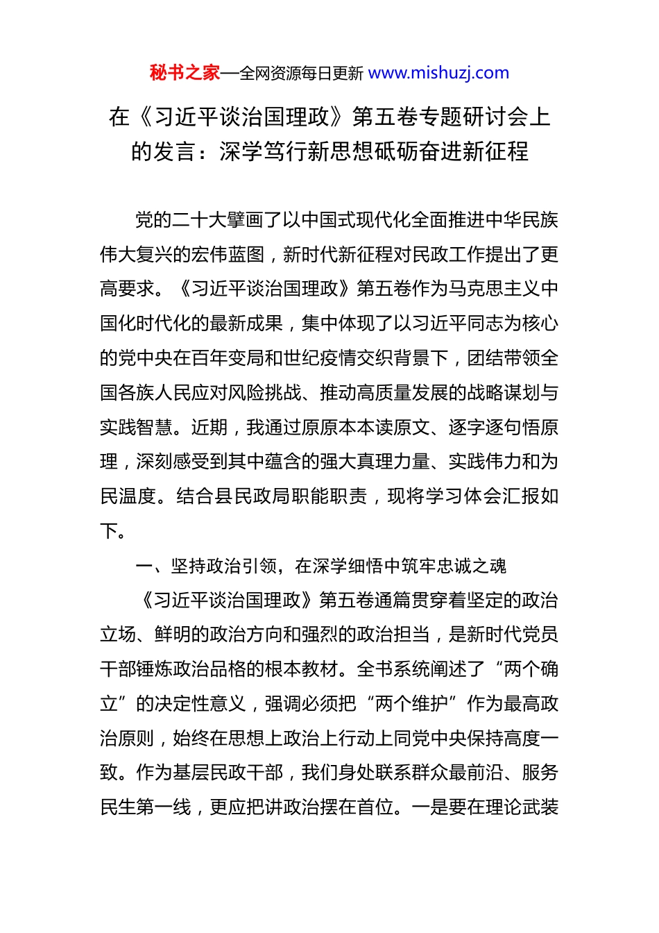 秘书之家—全网资源每日更新 www.mishuzj.com在《习近平谈治国理政》第五卷专题研讨会上的发言:深学笃行新思想砥砺奋进新征程 党的二十大擘画了以中国式现代化全面推进中华民族伟大复兴的宏伟蓝图,新时代新征程对民政工作提出了更高要求。《习近平谈治国理政》第五卷作为马克思主义中国化时代化的最新成果,集中体现了以习近平同志为核心的党中央在百年变局和世纪疫情交织背景下,团结带领全国各族人民应对风险挑战、推动高质量发展的战略谋划与实践智慧。近期,我通过原原本本读原文、逐字逐句悟原理,深刻感受到其中蕴含的强大真理力量、实践伟力和为民温度。结合县民政局职能职责,现将学习体会汇报如下。一、坚持政治引领,在深学细悟中筑牢忠诚之魂《习近平谈治国理政》第五卷通篇贯穿着坚定的政治立场、鲜明的政治方向和强烈的政治担当,是新时代党员干部锤炼政治品格的根本教材。全书系统阐述了“两个确立”的决定性意义,强调必须把“两个维护”作为最高政治原则,始终在思想上政治上行动上同党中央保持高度一致。作为基层民政干部,我们身处联系群众最前沿、服务民生第一线,更应把讲政治摆在首位。一是要在理论武装秘书之家—全网资源每日更新 www.mishuzj.com中强化政治自觉。把学习贯彻第五卷作为当前和今后一个时期的重大政治任务,纳入党组理论学习中心组、“三会一课”、主题党日等制度安排,推动形成常态化、长效化学习机制。二是要在对标对表中校准前进方向。围绕书中关于“健全分层分类的社会救助体系”“完善覆盖全民的社会保障体系”等重要论述,主动对照中央决策部署找差距、查不足、明举措,确保民政政策制定与执行始终沿着正确政治方向推进。三是要在知行合一中体现政治担当。始终把人民群众对美好生活的向往作为一切工作的出发点和落脚点,把每一件惠民实事办实、办好、办出成效,用实际行动诠释对党忠诚、为民尽责的政治本色。二、聚焦主责主业,在实干笃行中彰显担当作为《习近平谈治国理政》第五卷不仅立意高远,更立足现实、贴近民生,为新时代民政工作提供了根本遵循和行动指南。书中反复强调“民之所忧,我必念之;民之所盼,我必行之”,这既是对执政理念的深刻诠释,也是对我们基层工作者的殷切嘱托。我们要紧扣“保基本、兜底线、促公平”职能定位,切实把学习成果转化为推动工作的强大动力。一是要织密织牢社会救助网。当前我县仍有部分困难群众因病因残、失业失能等原因面临生活困境。要坚持“应保尽保、应救尽救”原则,健全动态监测预警秘书之家—全网资源每日更新 www.mishuzj.com机制,依托“智慧民政”平台实现数据比对、精准识别、快速响应。2023 年以来,全县新增临时救助对象 127人,发放救助金 48.6 万元,真正让困难群众感受到党和政府的温暖。二是要提升养老服务供给水平。面对人口老龄化加速态势,必须加快构建居家社区机构相协调、医养康养相结合的养老服务体系。今年已建成农村幸福院 8 个、城市嵌入式养老服务中心 3 处,配备助餐、护理、康复等功能设施,惠及老年人超过 2300 人次。下一步将重点推进老旧小区适老化改造,加装电梯、增设无障碍通道、优化照明系统,让“银发一族”安享晚年。三是要深化基层治理创新。持续推进“党建+网格+慈善”融合模式,发挥村(居)民委员会自治功能,培育发展志愿服务队伍,引导社会组织参与矛盾调解、心理疏导、儿童关爱等工作。截至目前,全县注册登记社会组织达 196 家,年均开展公益活动 600 余场次,有效提升了基层治理效能。三、强化自我革命,在严于律己中永葆清廉本色《习近平谈治国理政》第五卷中关于全面从严治党的论述振聋发聩、催人警醒。书中指出:“打铁必须自身硬”,只有始终保持自我革命精神,才能赢得历史主动。作为掌管民生资金、经手群众利益的重要部门,我们必须时刻绷紧纪律规矩这根弦。一是要压实主体责任。严格落秘书之家—全网资源每日更新 www.mishuzj.com实党风廉政建设责任制,层层签订责任书,定期召开警示教育大会,通报典型案例,用身边事教育身边人。二是要扎紧制度笼子。聚焦低保审批、福利发放、项目招投标等关键环节,建立权力运...