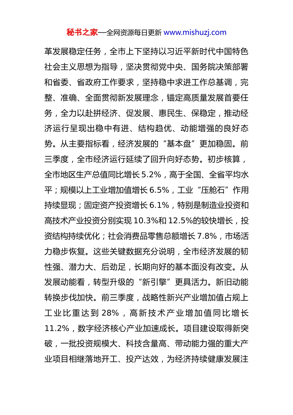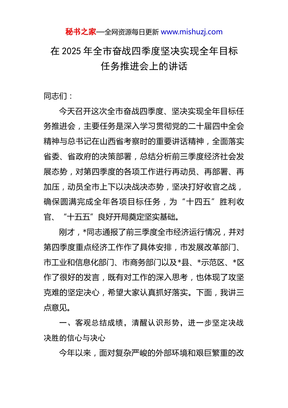 秘书之家—全网资源每日更新 www.mishuzj.com在 2025 年全市奋战四季度坚决实现全年目标任务推进会上的讲话 同志们:今天召开这次全市奋战四季度、坚决实现全年目标任务推进会,主要任务是深入学习贯彻党的二十届四中全会精神与总书记在山西省考察时的重要讲话精神,全面落实省委、省政府的决策部署,总结分析前三季度经济社会发展态势,对第四季度的各项工作进行再动员、再部署、再加压,动员全市上下以决战决态势,坚决打好收官之战,确保圆满完成全年各项目标任务,为“十四五”胜利收官、“十五五”良好开局奠定坚实基础。刚才,*同志通报了前三季度全市经济运行情况,并对第四季度重点经济工作作了具体安排,市发展改革部门、市工业和信息化部门、市商务部门以及*县、*示范区、*区作了很好的发言,既有对工作的深入思考,也体现了攻坚克难的坚定决心,希望大家认真抓好落实。下面,我讲三点意见。一、客观总结成绩,清醒认识形势,进一步坚定决战决胜的信心与决心今年以来,面对复杂严峻的外部环境和艰巨繁重的改秘书之家—全网资源每日更新 www.mishuzj.com革发展稳定任务,全市上下坚持以习近平新时代中国特色社会主义思想为指导,坚决贯彻党中央、国务院决策部署和省委、省政府工作要求,坚持稳中求进工作总基调,完整、准确、全面贯彻新发展理念,锚定高质量发展首要任务,全力以赴拼经济、促发展、惠民生、保稳定,推动经济运行呈现出稳中有进、结构趋优、动能增强的良好态势。从主要指标看,经济发展的“基本盘”更加稳固。前三季度,全市经济运行延续了回升向好态势。初步核算,全市地区生产总值同比增长 5.2%,高于全国、全省平均水平;规模以上工业增加值增长 6.5%,工业“压舱石”作用持续显现;固定资产投资增长 6.1%,特别是制造业投资和高技术产业投资分别实现 10.3%和 12.5%的较快增长,投资结构持续优化;社会消费品零售总额增长 7.8%,市场活力稳步恢复。这些关键数据充分说明,全市经济发展的韧性强、潜力大、后劲足,长期向好的基本面没有改变。从发展动能看,转型升级的“新引擎”更具活力。新旧动能转换步伐加快。前三季度,战略性新兴产业增加值占规上工 业 比 重 达 到 28% , 高 新 技 术 产 业 增 加 值 同 比 增 长11.2%,数字经济核心产业加速成长。项目建设取得新突破,一批投资规模大、科技含量高、带动能力强的重大产业项目相继落地开工、投产达效,为经济持续健康发展注秘书之家—全网资源每日更新 www.mishuzj.com入了强劲动力。创新生态持续优化,全市研发投入强度稳步提升,新增省级以上创新平台 8 家,技术合同成交额增长超过 20%,创新正加速成为引领发展的第一动力。从民生福祉看,社会大局的“稳定器”更加牢靠。就业形势总体稳定,前三季度城镇新增就业 6.5 万人,完成了全年目标的 92%。居民收入与经济增长基本同步,城乡居民人均可支配收入分别增长 5.0%和 6.8%。民生领域的财政支出占比始终保持在 75%以上,教育、医疗、养老、社保等基本公共服务体系不断完善,人民群众的获得感、幸福感、安全感持续增强。平安*、法治*建设向纵深推进,安全生产形势平稳,社会大局保持和谐稳定。在肯定成绩的同时,也必须清醒地看到,当前发展面临的困难和挑战依然不少。从外部看,全球经济复苏乏力,地缘政治冲突加剧,不稳定不确定因素增多。从内部看,经济恢复的基础尚不牢固,部分行业和企业经营压力较大,有效需求仍然不足,一些长期积累的结构性、周期性矛盾依然突出。特别是对照全年目标任务,部分指标进度不及预期,完成任务尚有缺口,时间紧、任务重、压力大。现在距离年底只剩下不足两个月的时间,已经到了决战决战、冲刺撞线的关键时刻。全市各级各部门必须切实增强紧迫感、责任感和使命感,把思想和行动统一到市秘书之家—全网资源每日更新 www.mishuzj.com委、市政府的决策部署上来,下定决心、坚定信心,以“人一之、我十之”的拼抢劲头,向全年目标发起最后冲刺。二、聚焦重点领域,实施精准攻坚,全力打好决胜全年的收官之战第四季度是定全年、保全局的最后关口,做好这个季度的工作,...