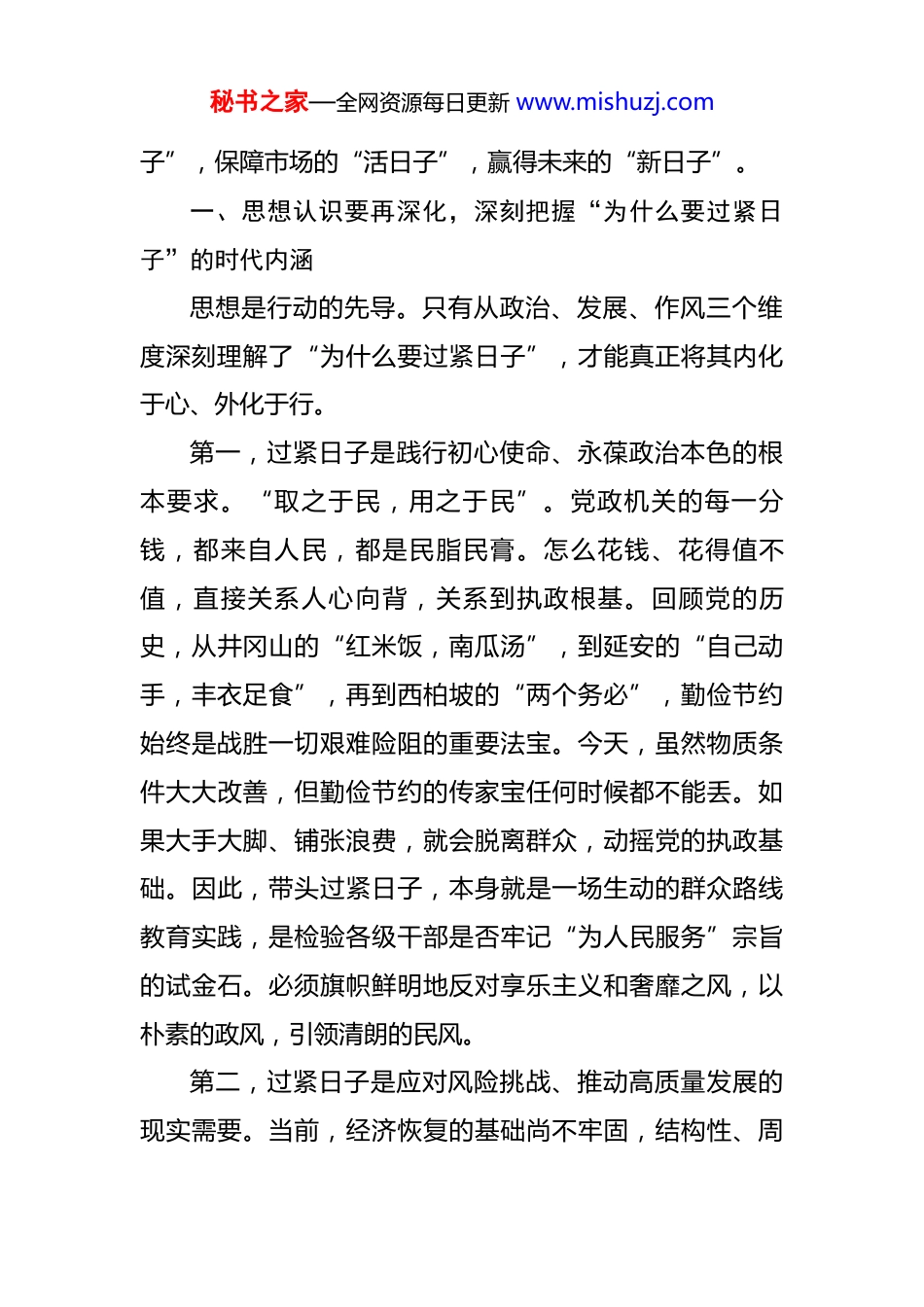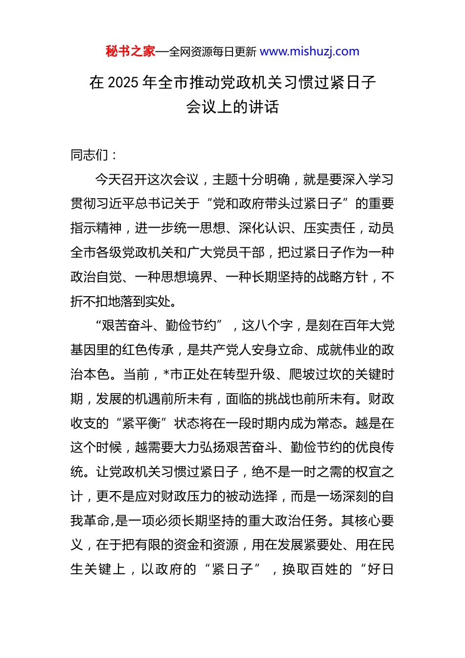 秘书之家—全网资源每日更新 www.mishuzj.com在 2025 年全市推动党政机关习惯过紧日子会议上的讲话 同志们:今天召开这次会议,主题十分明确,就是要深入学习贯彻习近平总书记关于“党和政府带头过紧日子”的重要指示精神,进一步统一思想、深化认识、压实责任,动员全市各级党政机关和广大党员干部,把过紧日子作为一种政治自觉、一种思想境界、一种长期坚持的战略方针,不折不扣地落到实处。“艰苦奋斗、勤俭节约”,这八个字,是刻在百年大党基因里的红色传承,是共产党人安身立命、成就伟业的政治本色。当前,*市正处在转型升级、爬坡过坎的关键时期,发展的机遇前所未有,面临的挑战也前所未有。财政收支的“紧平衡”状态将在一段时期内成为常态。越是在这个时候,越需要大力弘扬艰苦奋斗、勤俭节约的优良传统。让党政机关习惯过紧日子,绝不是一时之需的权宜之计,更不是应对财政压力的被动选择,而是一场深刻的自我革命,是一项必须长期坚持的重大政治任务。其核心要义,在于把有限的资金和资源,用在发展紧要处、用在民生关键上,以政府的“紧日子”,换取百姓的“好日秘书之家—全网资源每日更新 www.mishuzj.com子”,保障市场的“活日子”,赢得未来的“新日子”。一、思想认识要再深化,深刻把握“为什么要过紧日子”的时代内涵思想是行动的先导。只有从政治、发展、作风三个维度深刻理解了“为什么要过紧日子”,才能真正将其内化于心、外化于行。第一,过紧日子是践行初心使命、永葆政治本色的根本要求。“取之于民,用之于民”。党政机关的每一分钱,都来自人民,都是民脂民膏。怎么花钱、花得值不值,直接关系人心向背,关系到执政根基。回顾党的历史,从井冈山的“红米饭,南瓜汤”,到延安的“自己动手,丰衣足食”,再到西柏坡的“两个务必”,勤俭节约始终是战胜一切艰难险阻的重要法宝。今天,虽然物质条件大大改善,但勤俭节约的传家宝任何时候都不能丢。如果大手大脚、铺张浪费,就会脱离群众,动摇党的执政基础。因此,带头过紧日子,本身就是一场生动的群众路线教育实践,是检验各级干部是否牢记“为人民服务”宗旨的试金石。必须旗帜鲜明地反对享乐主义和奢靡之风,以朴素的政风,引领清朗的民风。第二,过紧日子是应对风险挑战、推动高质量发展的现实需要。当前,经济恢复的基础尚不牢固,结构性、周秘书之家—全网资源每日更新 www.mishuzj.com期性问题交织。从*市的实际情况看,一方面,产业转型、城市更新、民生保障、风险防范等领域,都需要大量的资金投入;另一方面,财政收入增速放缓,土地、税收等传统增收渠道面临瓶颈,收支矛盾日益突出。巧妇难为无米之炊。要想“集中力量办大事”,就必须在“节流”上狠下功夫。节约下来的每一分钱,都可以转化为支持实体经济发展的真金白银,都可以变成补齐民生短板的暖心工程,都可以成为撬动社会投资的有效杠杆。据财政部门测算,全市各级机关运行经费每压减 1 个百分点,就能腾出近 5000 万元资金。这笔钱,可以新建或改扩建 5 所标准化学校,可以支持 100 家中小微企业技术改造,可以为上万名困难群众提供兜底保障。所以,过紧日子,不是不发展、不作为,恰恰是为了更好地发展、更精准地作为。第三,过紧日子是推进自我革命、建设廉洁高效政府的内在逻辑。作风建设永远在路上。一个地方的营商环境好不好,政府效能高不高,很大程度上就体现在花钱的理念和方式上。铺张浪费与贪污腐败往往只有一步之遥,精打细算和廉洁高效则是一体两面。如果一个部门预算管理松弛,花钱大手大脚,就容易滋生“跑冒滴漏”的现象,甚至成为腐败的温床。反之,把预算的“笼子”扎紧了,把支出的“龙头”拧紧了,就能从源头上压缩权力寻租的秘书之家—全网资源每日更新 www.mishuzj.com空间,倒逼各级干部提升专业素养,学会“花小钱办大事”的本领。这本身就是对干部队伍的一场深刻锤炼。因此,推动习惯过紧日子,就是以刀刃向内的勇气,向管理要效能,向作风要战力,持续深化政府治理体系和治理能力现代化。二、成绩成效要再肯定,清醒看待“紧日子过得怎么样”的现实答卷近年来,市委、市政府坚决贯彻中央...