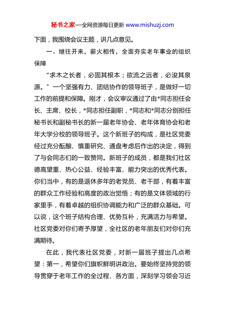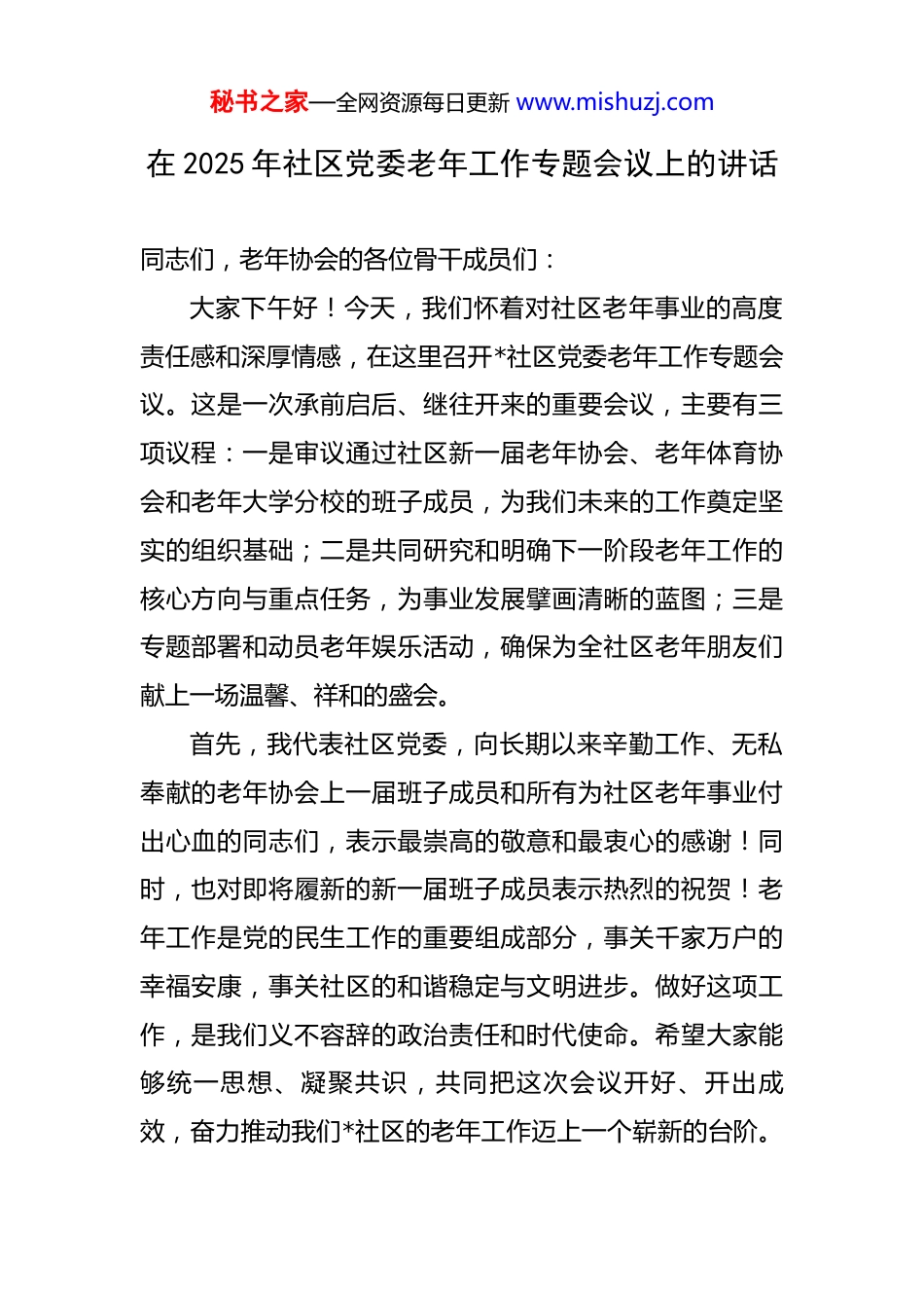 秘书之家—全网资源每日更新 www.mishuzj.com在 2025 年社区党委老年工作专题会议上的讲话 同志们,老年协会的各位骨干成员们:大家下午好!今天,我们怀着对社区老年事业的高度责任感和深厚情感,在这里召开*社区党委老年工作专题会议。这是一次承前启后、继往开来的重要会议,主要有三项议程:一是审议通过社区新一届老年协会、老年体育协会和老年大学分校的班子成员,为我们未来的工作奠定坚实的组织基础;二是共同研究和明确下一阶段老年工作的核心方向与重点任务,为事业发展擘画清晰的蓝图;三是专题部署和动员老年娱乐活动,确保为全社区老年朋友们献上一场温馨、祥和的盛会。首先,我代表社区党委,向长期以来辛勤工作、无私奉献的老年协会上一届班子成员和所有为社区老年事业付出心血的同志们,表示最崇高的敬意和最衷心的感谢!同时,也对即将履新的新一届班子成员表示热烈的祝贺!老年工作是党的民生工作的重要组成部分,事关千家万户的幸福安康,事关社区的和谐稳定与文明进步。做好这项工作,是我们义不容辞的政治责任和时代使命。希望大家能够统一思想、凝聚共识,共同把这次会议开好、开出成效,奋力推动我们*社区的老年工作迈上一个崭新的台阶。秘书之家—全网资源每日更新 www.mishuzj.com下面,我围绕会议主题,讲几点意见。一、继往开来,薪火相传,全面夯实老年事业的组织保障“求木之长者,必固其根本;欲流之远者,必浚其泉源。”一个坚强有力、团结协作的领导班子,是做好一切工作的前提和保障。刚才,会议审议通过了由*同志担任会长、主席、校长,*同志担任副职,*同志和*同志分别担任秘书长和副秘书长的新一届老年协会、老年体育协会和老年大学分校的领导班子。这个新班子的构成,是社区党委经过充分酝酿、慎重研究、通盘考虑后作出的决定,得到了与会同志们的一致赞同。新班子的成员,都是我们社区德高望重、热心公益、经验丰富、能力突出的优秀代表。你们当中,有的是退休多年的老党员、老干部,有着丰富的群众工作经验和高度的政治觉悟;有的是文体领域的行家里手,有着卓越的组织协调能力和广泛的群众基础。可以说,这个班子结构合理、优势互补,充满活力与希望。社区党委对你们寄予厚望,全社区的老年朋友们对你们充满期待。在此,我代表社区党委,对新一届班子提出几点希望:第一,希望你们旗帜鲜明讲政治。要始终坚持党的领导贯穿于老年工作的全过程、各方面,深刻学习领会习近秘书之家—全网资源每日更新 www.mishuzj.com平总书记关于老龄工作的重要论述精神,确保老年协会各项工作始终沿着正确的政治方向前进。要发挥好党组织的战斗堡垒作用和党员的先锋模范作用,团结带领广大老年朋友感党恩、听党话、跟党走。第二,希望你们精诚团结聚合力。团结是班子的生命线,是干事创业的基础。班子成员之间要互相信任、互相支持、互相补台,大事讲原则、小事讲风格,形成心往一处想、劲往一处使的强大合力。要发扬民主集中制,健全议事决策机制,做到科学决策、民主决策,不断增强班子的凝聚力和战斗力。第三,希望你们勇于担当善作为。新的岗位意味着新的责任。希望你们尽快进入角色,熟悉情况,以高度的责任心和事业心,大胆开展工作。要继承和发扬历届老协班子的优良传统和宝贵经验,同时也要解放思想、开拓创新,在新的历史起点上不断创造新的业绩。社区党委和居委会将一如既往地全力支持老年协会的工作,在政策、资金、场地上给予最大程度的保障,为你们开展工作创造最优越的条件。我们相信,在以*同志为班长的新一届领导班子的带领下,我社区的老年工作组织体系必将更加完善,工作机制必将更加顺畅,为推动老年事业高质量发展提供最坚实的组织保证。二、明确方向,精准发力,系统擘画老年工作的发展秘书之家—全网资源每日更新 www.mishuzj.com蓝图做好新时代的老年工作,不仅要有热情,更要有思路;不仅要有干劲,更要有方法。刚才会议研究并明确了下一步工作的五大重点方向,我完全赞同。这五个方向,抓住了当前我社区老年工作的关键点和着力点,具有很强的指导性和可操作性。下面,我结合社区的实际情况,对这五个方面再作一些阐述和深...