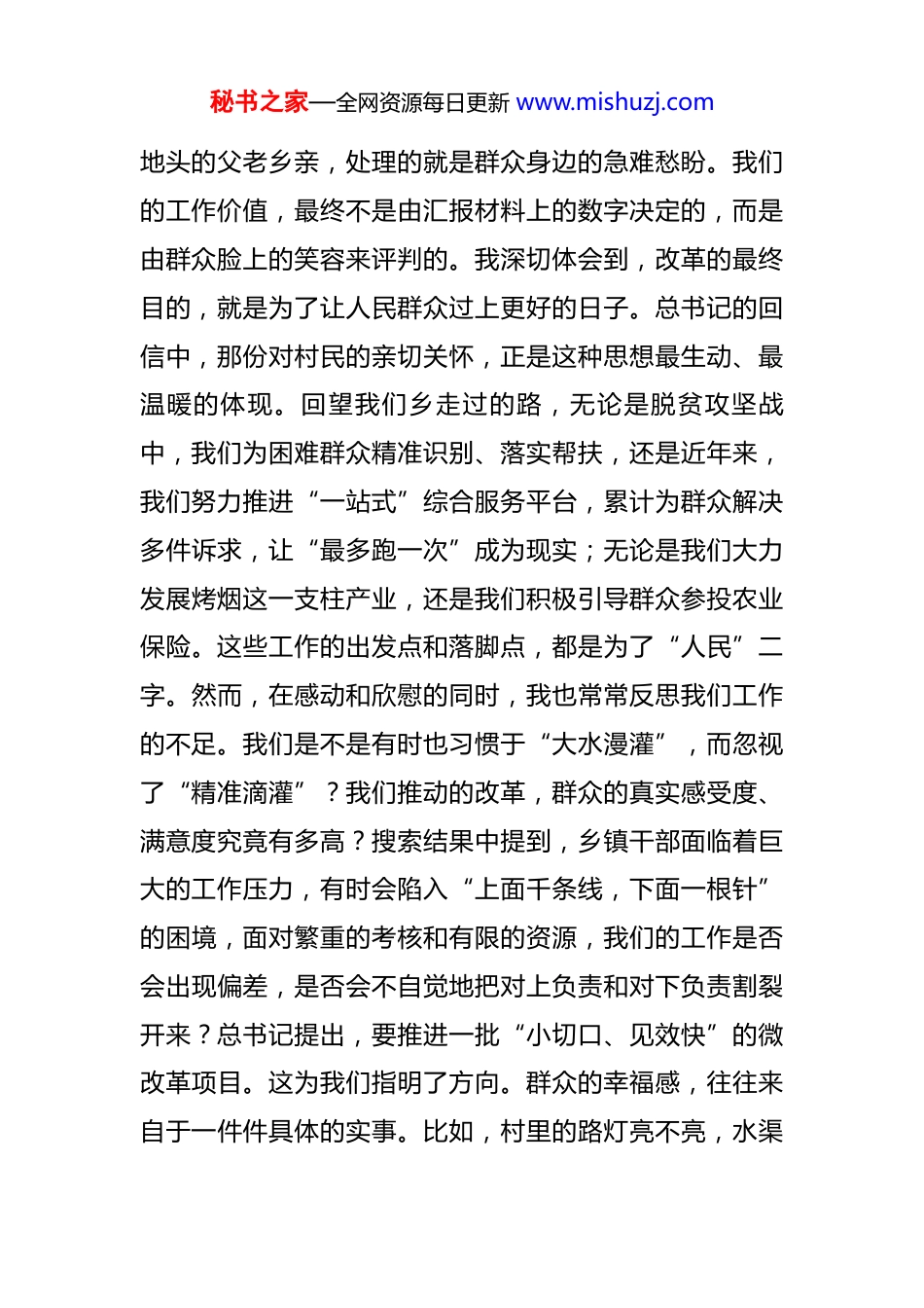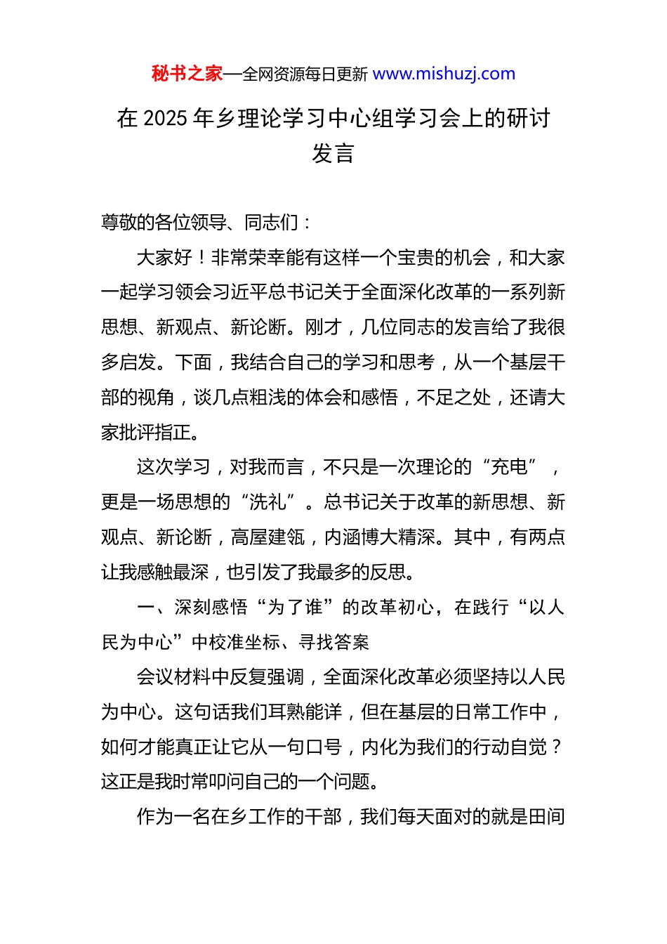 秘书之家—全网资源每日更新 www.mishuzj.com在 2025 年乡理论学习中心组学习会上的研讨发言 尊敬的各位领导、同志们:大家好!非常荣幸能有这样一个宝贵的机会,和大家一起学习领会习近平总书记关于全面深化改革的一系列新思想、新观点、新论断。刚才,几位同志的发言给了我很多启发。下面,我结合自己的学习和思考,从一个基层干部的视角,谈几点粗浅的体会和感悟,不足之处,还请大家批评指正。这次学习,对我而言,不只是一次理论的“充电”,更是一场思想的“洗礼”。总书记关于改革的新思想、新观点、新论断,高屋建瓴,内涵博大精深。其中,有两点让我感触最深,也引发了我最多的反思。一、深刻感悟“为了谁”的改革初心,在践行“以人民为中心”中校准坐标、寻找答案会议材料中反复强调,全面深化改革必须坚持以人民为中心。这句话我们耳熟能详,但在基层的日常工作中,如何才能真正让它从一句口号,内化为我们的行动自觉?这正是我时常叩问自己的一个问题。作为一名在乡工作的干部,我们每天面对的就是田间秘书之家—全网资源每日更新 www.mishuzj.com地头的父老乡亲,处理的就是群众身边的急难愁盼。我们的工作价值,最终不是由汇报材料上的数字决定的,而是由群众脸上的笑容来评判的。我深切体会到,改革的最终目的,就是为了让人民群众过上更好的日子。总书记的回信中,那份对村民的亲切关怀,正是这种思想最生动、最温暖的体现。回望我们乡走过的路,无论是脱贫攻坚战中,我们为困难群众精准识别、落实帮扶,还是近年来,我们努力推进“一站式”综合服务平台,累计为群众解决多件诉求,让“最多跑一次”成为现实;无论是我们大力发展烤烟这一支柱产业,还是我们积极引导群众参投农业保险。这些工作的出发点和落脚点,都是为了“人民”二字。然而,在感动和欣慰的同时,我也常常反思我们工作的不足。我们是不是有时也习惯于“大水漫灌”,而忽视了“精准滴灌”?我们推动的改革,群众的真实感受度、满意度究竟有多高?搜索结果中提到,乡镇干部面临着巨大的工作压力,有时会陷入“上面千条线,下面一根针”的困境,面对繁重的考核和有限的资源,我们的工作是否会出现偏差,是否会不自觉地把对上负责和对下负责割裂开来?总书记提出,要推进一批“小切口、见效快”的微改革项目。这为我们指明了方向。群众的幸福感,往往来自于一件件具体的实事。比如,村里的路灯亮不亮,水渠秘书之家—全网资源每日更新 www.mishuzj.com堵没堵,孩子上学方不方便,看病报销快不快。这些看似琐碎的小事,却是民心向背的大问题。因此,我体会到,践行以人民为中心,就是要我们沉下身子,把群众的“问题清单”当作我们的“改革清单”,把他们的“期盼”作为我们努力的方向。未来的工作中,我们或许更应该聚焦这些“微改革”,用一个个“小切口”的突破,汇聚成群众获得感、幸福感、安全感的巨大提升,这才是对“为了谁”这个改革根本问题最响亮的回答。二、深刻领会“怎么改”的科学方法,在把握“守正创新”中寻求突破、行稳致远总书记关于改革的系列论述中,“守正创新”是一个极为重要的关键词。它深刻揭示了改革的内在规律,为我们基层工作提供了科学的方法论。在*乡的实践中,我对此也有着切身的体会。所谓“守正”,守的是什么?我认为,在*乡,首先守的是党的领导这个“根”和“魂”。基层党组织就是我们攻坚克难的“战斗堡垒”。我们通过“党员示范户”“党员责任区”等方式,培育了党员产业带头人,带动周边群众共同发展,形成了“一名党员一面旗”的生动局面。这就是“守正”的力量。其次,守的是我们的基本盘和优势。烤烟产业是我们*乡的支柱,是数千户家庭的主要收入秘书之家—全网资源每日更新 www.mishuzj.com来源。坚持烤烟支柱地位不动摇,通过专业合作社提供全链条服务,保障烟农收益,这就是守住了发展的“正”。这是我们的责任,也是我们创新的基础。所谓“创新”,新在何处?我理解,创新不是推倒重来,而是在“守正”基础上的优化、突破和提升。面对新形势新要求,故步自封没有出路。我们不能只守着烤烟这一亩三分地。因此,乡里近年来也在不断探索新的增长...