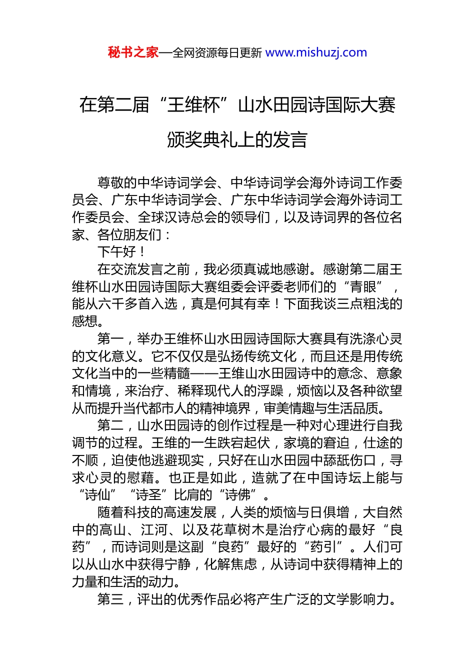 秘书之家—全网资源每日更新 www.mishuzj.com在第二届“王维杯”山水田园诗国际大赛颁奖典礼上的发言尊敬的中华诗词学会、中华诗词学会海外诗词工作委员会、广东中华诗词学会、广东中华诗词学会海外诗词工作委员会、全球汉诗总会的领导们,以及诗词界的各位名家、各位朋友们:下午好!在交流发言之前,我必须真诚地感谢。感谢第二届王维杯山水田园诗国际大赛组委会评委老师们的“青眼”,能从六千多首入选,真是何其有幸!下面我谈三点粗浅的感想。第一,举办王维杯山水田园诗国际大赛具有洗涤心灵的文化意义。它不仅仅是弘扬传统文化,而且还是用传统文化当中的一些精髓——王维山水田园诗中的意念、意象和情境,来治疗、稀释现代人的浮躁,烦恼以及各种欲望从而提升当代都市人的精神境界,审美情趣与生活品质。第二,山水田园诗的创作过程是一种对心理进行自我调节的过程。王维的一生跌宕起伏,家境的窘迫,仕途的不顺,迫使他逃避现实,只好在山水田园中舔舐伤口,寻求心灵的慰藉。也正是如此,造就了在中国诗坛上能与“诗仙”“诗圣”比肩的“诗佛”。随着科技的高速发展,人类的烦恼与日俱增,大自然中的高山、江河、以及花草树木是治疗心病的最好“良药”,而诗词则是这副“良药”最好的“药引”。人们可以从山水中获得宁静,化解焦虑,从诗词中获得精神上的力量和生活的动力。第三,评出的优秀作品必将产生广泛的文学影响力。秘书之家—全网资源每日更新 www.mishuzj.com一个举办成功的大赛,选出来的获奖作品,会成为诗词界的“风向标”。好的作品评出来之后,可以带领全球读者一起走进山水田园诗中优美的意境,让更多的人领略自然纯净之美。这种给人们带来的精神价值,是无与伦比,无法衡量的。在喧嚣的都市里,愿你我的心中有田园,有山水,有远方,更有诗!