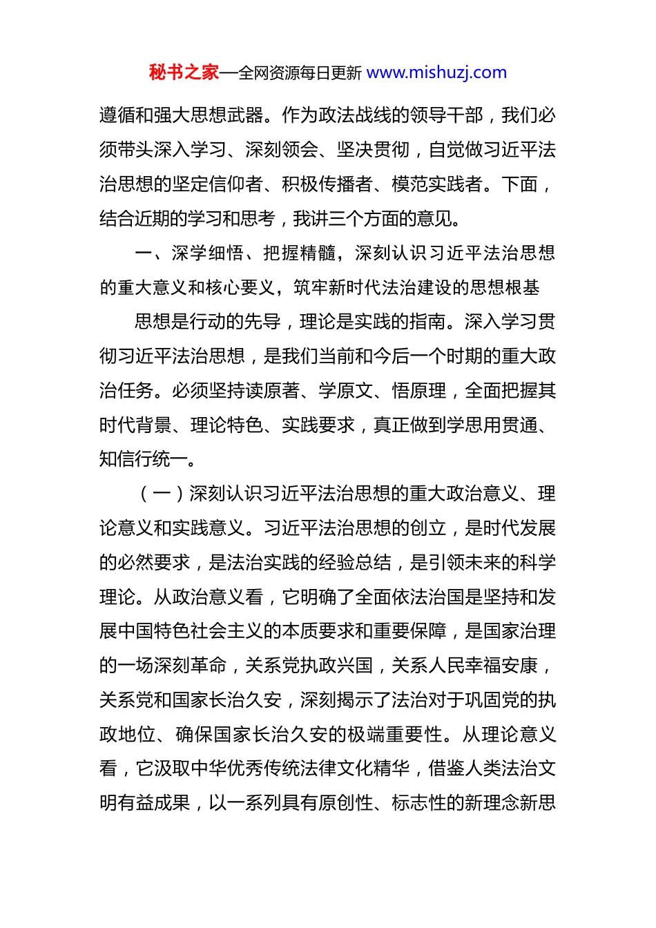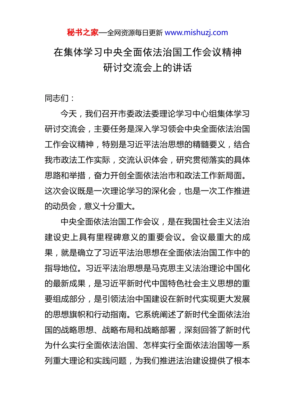 秘书之家—全网资源每日更新 www.mishuzj.com在集体学习中央全面依法治国工作会议精神研讨交流会上的讲话 同志们:今天,我们召开市委政法委理论学习中心组集体学习研讨交流会,主要任务是深入学习领会中央全面依法治国工作会议精神,特别是习近平法治思想的精髓要义,结合我市政法工作实际,交流认识体会,研究贯彻落实的具体思路和举措,奋力开创全面依法治市和政法工作新局面。这次会议既是一次理论学习的深化会,也是一次工作推进的动员会,意义十分重大。中央全面依法治国工作会议,是在我国社会主义法治建设史上具有里程碑意义的重要会议。会议最重大的成果,就是确立了习近平法治思想在全面依法治国工作中的指导地位。习近平法治思想是马克思主义法治理论中国化的最新成果,是习近平新时代中国特色社会主义思想的重要组成部分,是引领法治中国建设在新时代实现更大发展的思想旗帜和行动指南。它系统阐述了新时代全面依法治国的战略思想、战略布局和战略部署,深刻回答了新时代为什么实行全面依法治国、怎样实行全面依法治国等一系列重大理论和实践问题,为我们推进法治建设提供了根本秘书之家—全网资源每日更新 www.mishuzj.com遵循和强大思想武器。作为政法战线的领导干部,我们必须带头深入学习、深刻领会、坚决贯彻,自觉做习近平法治思想的坚定信仰者、积极传播者、模范实践者。下面,结合近期的学习和思考,我讲三个方面的意见。一、深学细悟、把握精髓,深刻认识习近平法治思想的重大意义和核心要义,筑牢新时代法治建设的思想根基思想是行动的先导,理论是实践的指南。深入学习贯彻习近平法治思想,是我们当前和今后一个时期的重大政治任务。必须坚持读原著、学原文、悟原理,全面把握其时代背景、理论特色、实践要求,真正做到学思用贯通、知信行统一。(一)深刻认识习近平法治思想的重大政治意义、理论意义和实践意义。习近平法治思想的创立,是时代发展的必然要求,是法治实践的经验总结,是引领未来的科学理论。从政治意义看,它明确了全面依法治国是坚持和发展中国特色社会主义的本质要求和重要保障,是国家治理的一场深刻革命,关系党执政兴国,关系人民幸福安康,关系党和国家长治久安,深刻揭示了法治对于巩固党的执政地位、确保国家长治久安的极端重要性。从理论意义看,它汲取中华优秀传统法律文化精华,借鉴人类法治文明有益成果,以一系列具有原创性、标志性的新理念新思秘书之家—全网资源每日更新 www.mishuzj.com想新战略,丰富和发展了马克思主义法治理论,开辟了中国特色社会主义法治理论的新境界,为发展人类法治文明贡献了中国智慧和中国方案。从实践意义看,它科学总结了党领导法治建设的宝贵经验,直面法治建设领域的突出矛盾和问题,系统阐述了全面依法治国的总目标、总抓手、工作布局、重点任务等,为新时代推进全面依法治国提供了总蓝图、路线图和施工图,是指导我们破解法治难题、深化法治实践的“金钥匙”。我们要从这样的高度来认识和把握习近平法治思想,不断增强学习贯彻的思想自觉、政治自觉和行动自觉。(二)准确把握习近平法治思想“十一个坚持”的核心要义和内在逻辑。“十一个坚持”系统构成了习近平法治思想的主要内容和核心要义,涵盖了全面依法治国的方向性、根本性、全局性、战略性重大问题,是一个内涵丰富、论述深刻、逻辑严密、系统完备的科学理论体系。一是坚持党对全面依法治国的领导。这是中国特色社会主义法治之魂,是全面依法治国的根本保证。必须深刻理解党的领导是我国社会主义法治同西方资本主义国家法治最大的区别,自觉把党的领导贯穿到依法治市全过程和各方面,确保法治建设的正确政治方向。二是坚持以人民为中心。这是全面依法治国的根本立场。法治建设要为了人秘书之家—全网资源每日更新 www.mishuzj.com民、依靠人民、造福人民、保护人民,把体现人民利益、反映人民愿望、维护人民权益、增进人民福祉落实到依法治国各领域全过程,努力让人民群众在每一项法律制度、每一个执法决定、每一宗司法案件中都感受到公平正义。三是坚持中国特色社会主义法治道路。这是建设社会主义法治国家的唯一正确道路。...