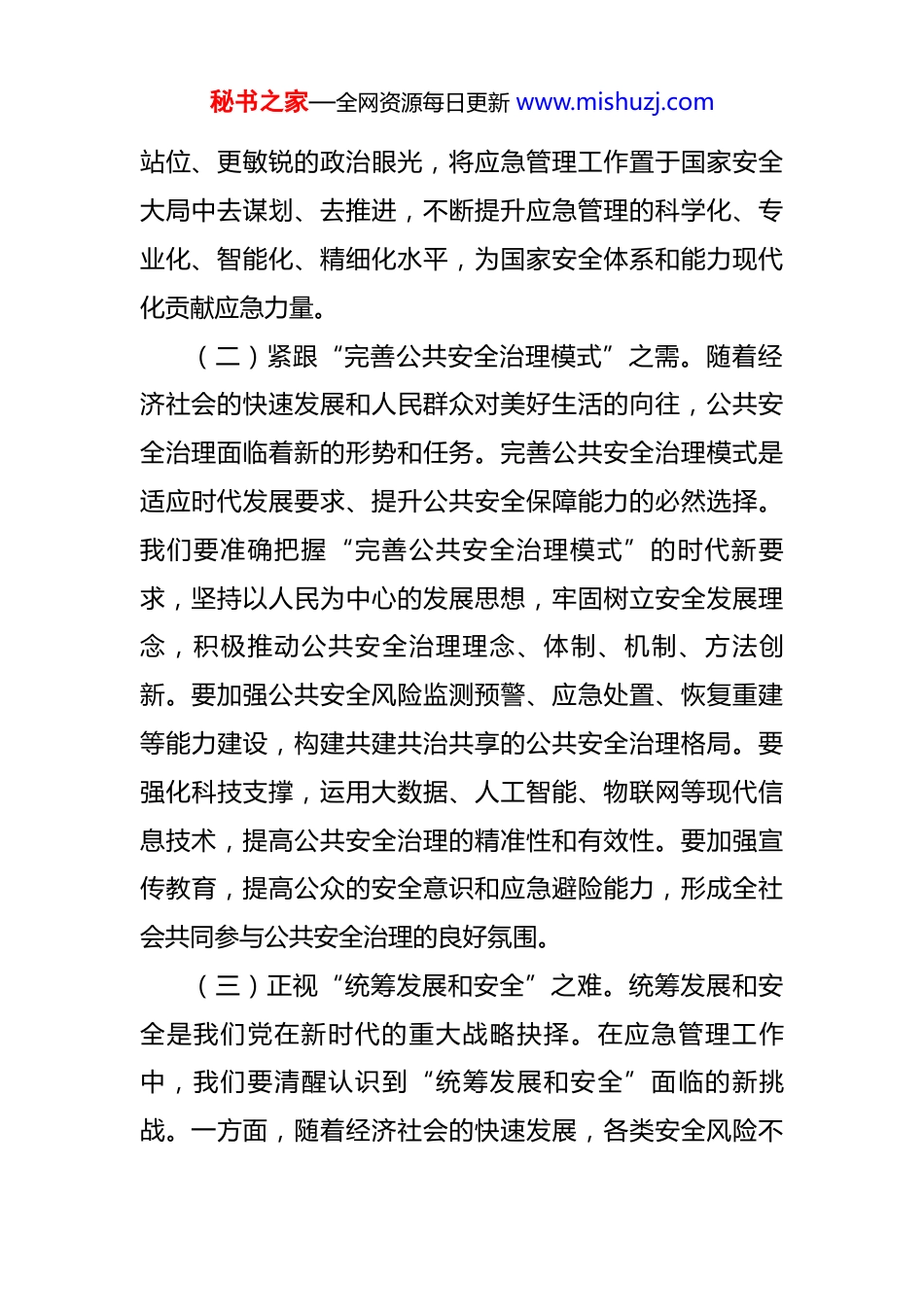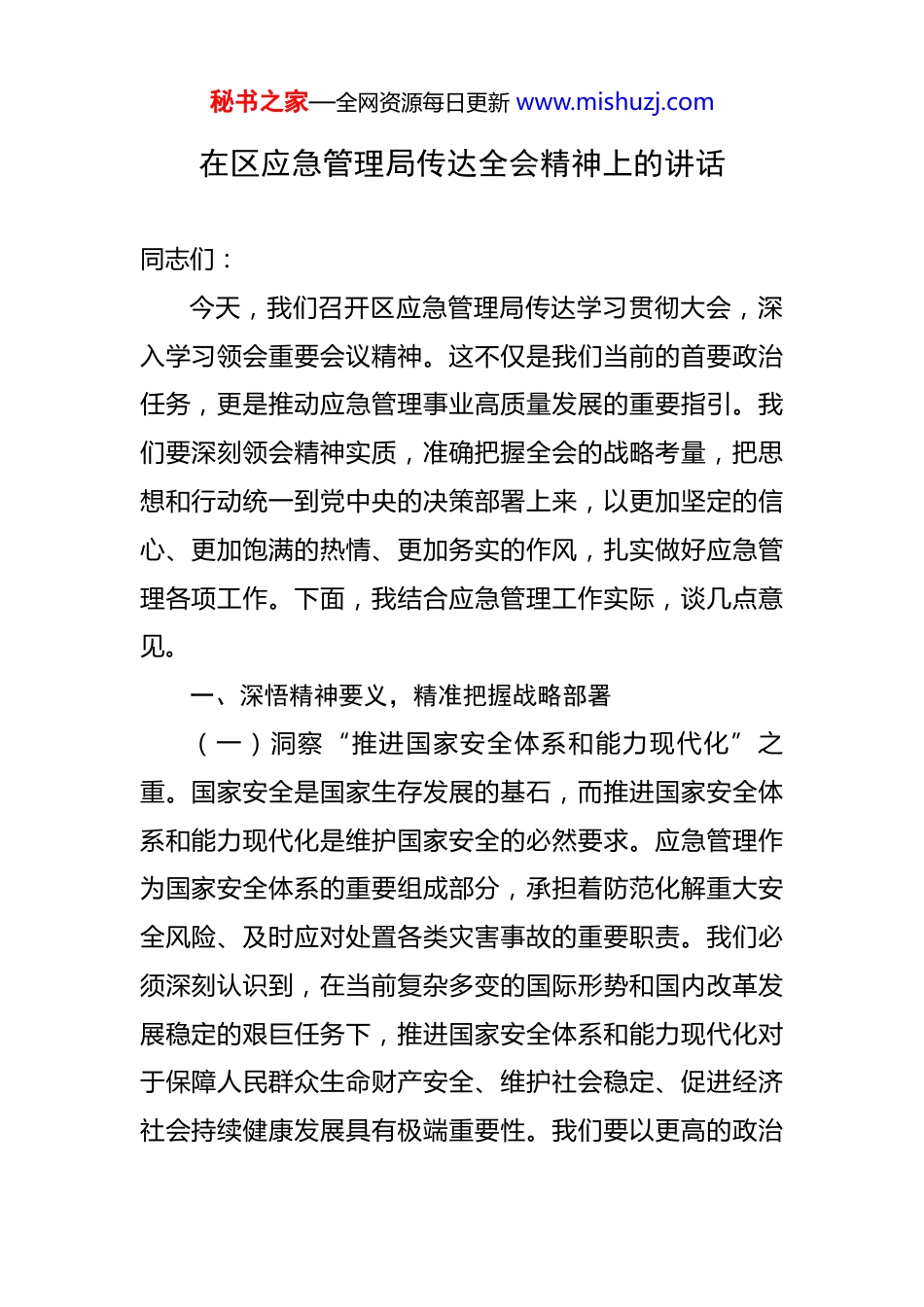 秘书之家—全网资源每日更新 www.mishuzj.com在区应急管理局传达全会精神上的讲话 同志们:今天,我们召开区应急管理局传达学习贯彻大会,深入学习领会重要会议精神。这不仅是我们当前的首要政治任务,更是推动应急管理事业高质量发展的重要指引。我们要深刻领会精神实质,准确把握全会的战略考量,把思想和行动统一到党中央的决策部署上来,以更加坚定的信心、更加饱满的热情、更加务实的作风,扎实做好应急管理各项工作。下面,我结合应急管理工作实际,谈几点意见。一、深悟精神要义,精准把握战略部署(一)洞察“推进国家安全体系和能力现代化”之重。国家安全是国家生存发展的基石,而推进国家安全体系和能力现代化是维护国家安全的必然要求。应急管理作为国家安全体系的重要组成部分,承担着防范化解重大安全风险、及时应对处置各类灾害事故的重要职责。我们必须深刻认识到,在当前复杂多变的国际形势和国内改革发展稳定的艰巨任务下,推进国家安全体系和能力现代化对于保障人民群众生命财产安全、维护社会稳定、促进经济社会持续健康发展具有极端重要性。我们要以更高的政治秘书之家—全网资源每日更新 www.mishuzj.com站位、更敏锐的政治眼光,将应急管理工作置于国家安全大局中去谋划、去推进,不断提升应急管理的科学化、专业化、智能化、精细化水平,为国家安全体系和能力现代化贡献应急力量。(二)紧跟“完善公共安全治理模式”之需。随着经济社会的快速发展和人民群众对美好生活的向往,公共安全治理面临着新的形势和任务。完善公共安全治理模式是适应时代发展要求、提升公共安全保障能力的必然选择。我们要准确把握“完善公共安全治理模式”的时代新要求,坚持以人民为中心的发展思想,牢固树立安全发展理念,积极推动公共安全治理理念、体制、机制、方法创新。要加强公共安全风险监测预警、应急处置、恢复重建等能力建设,构建共建共治共享的公共安全治理格局。要强化科技支撑,运用大数据、人工智能、物联网等现代信息技术,提高公共安全治理的精准性和有效性。要加强宣传教育,提高公众的安全意识和应急避险能力,形成全社会共同参与公共安全治理的良好氛围。(三)正视“统筹发展和安全”之难。统筹发展和安全是我们党在新时代的重大战略抉择。在应急管理工作中,我们要清醒认识到“统筹发展和安全”面临的新挑战。一方面,随着经济社会的快速发展,各类安全风险不秘书之家—全网资源每日更新 www.mishuzj.com断积累,安全生产、自然灾害、公共卫生等领域的突发事件时有发生,给人民群众生命财产安全和经济社会发展带来了严重威胁。另一方面,应急管理工作还存在一些短板和不足,如应急管理体系不够完善、应急救援能力有待提高、应急物资储备不足等。我们要正确处理好发展和安全的关系,坚持发展和安全并重,既要通过发展提升安全保障能力,又要通过安全保障为发展创造良好环境。要加强对各类安全风险的分析研判,提前谋划、主动应对,做到未雨绸缪、防患于未然。要加强应急管理能力建设,提高应对突发事件的能力和水平,确保在关键时刻能够拉得出、冲得上、打得赢。二、夯实安全根基,提升应急管理能力(一)聚焦体系建设,推动应急管理系统集成。体系化建设是应急管理工作的核心。当前,应急管理工作存在着条块分割、资源分散等问题,影响了应急管理的整体效能。我们要以体系化建设为核心,推动应急管理从“条块分割”向“系统集成”转变。要加强应急管理体制机制建设,建立健全统一指挥、专常兼备、反应灵敏、上下联动的应急管理体制。要加强应急管理部门与其他部门之间的协同配合,打破部门壁垒,实现资源共享、信息互通、协同作战。要加强应急预案体系建设,完善各类应急预案,秘书之家—全网资源每日更新 www.mishuzj.com提高应急预案的科学性、实用性和可操作性。要加强应急物资储备体系建设,优化物资储备布局,提高物资储备保障能力。(二)强化科技赋能,驱动应急管理智慧升级。科技是第一生产力,也是应急管理工作的重要支撑。我们要以科技化赋能为引擎,推动应急管理从“经验主导”向“智慧驱动”转变。要加大科技投入,加强应急管理科技创新...