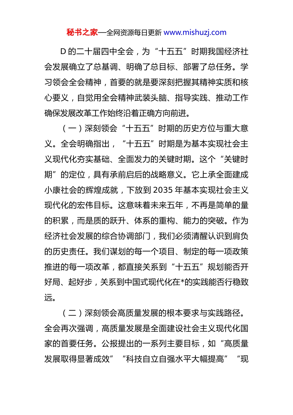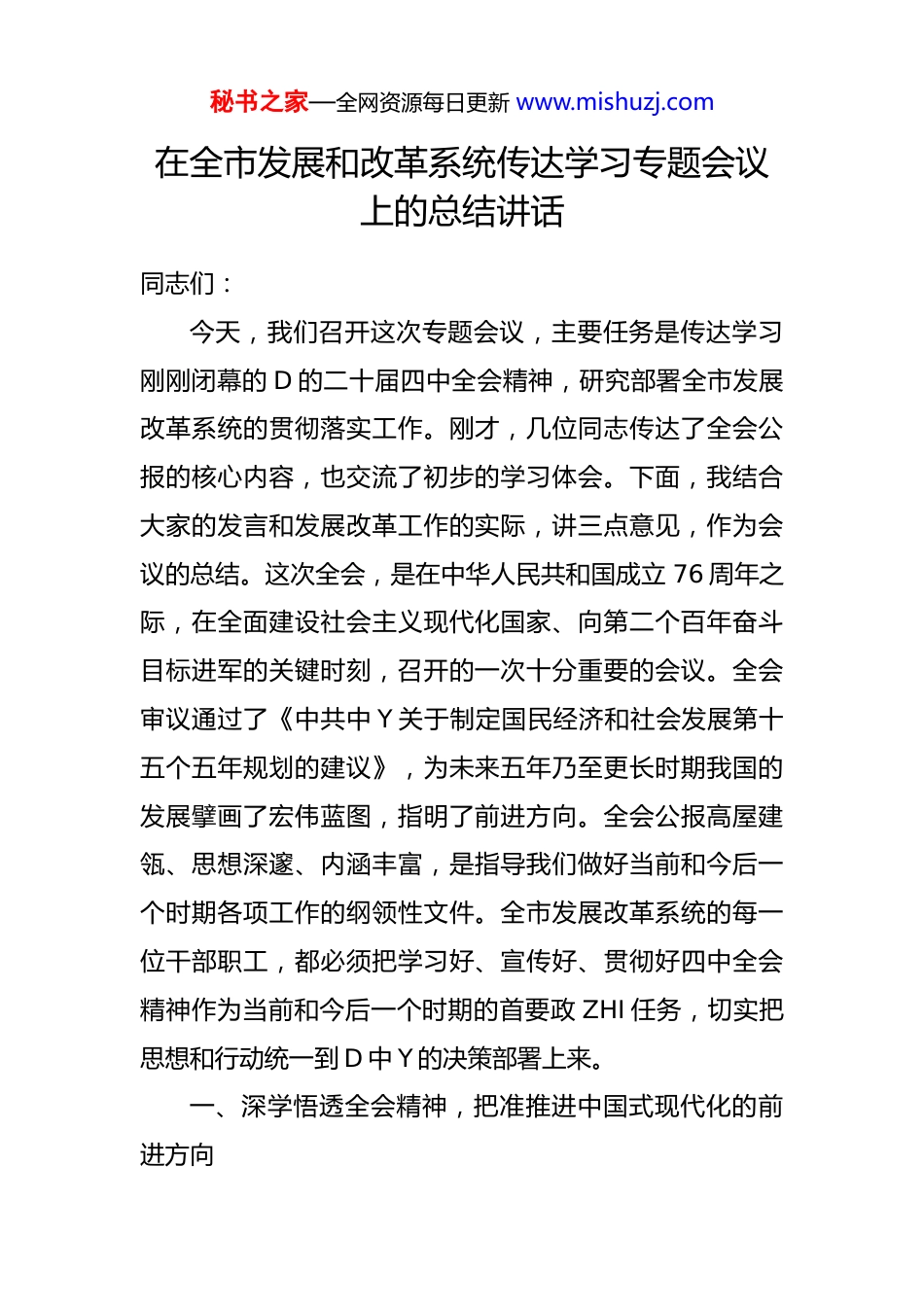 秘书之家—全网资源每日更新 www.mishuzj.com在全市发展和改革系统传达学习专题会议上的总结讲话同志们:今天,我们召开这次专题会议,主要任务是传达学习刚刚闭幕的 D 的二十届四中全会精神,研究部署全市发展改革系统的贯彻落实工作。刚才,几位同志传达了全会公报的核心内容,也交流了初步的学习体会。下面,我结合大家的发言和发展改革工作的实际,讲三点意见,作为会议的总结。这次全会,是在中华人民共和国成立 76 周年之际,在全面建设社会主义现代化国家、向第二个百年奋斗目标进军的关键时刻,召开的一次十分重要的会议。全会审议通过了《中共中 Y 关于制定国民经济和社会发展第十五个五年规划的建议》,为未来五年乃至更长时期我国的发展擘画了宏伟蓝图,指明了前进方向。全会公报高屋建瓴、思想深邃、内涵丰富,是指导我们做好当前和今后一个时期各项工作的纲领性文件。全市发展改革系统的每一位干部职工,都必须把学习好、宣传好、贯彻好四中全会精神作为当前和今后一个时期的首要政 ZHI 任务,切实把思想和行动统一到 D 中 Y 的决策部署上来。一、深学悟透全会精神,把准推进中国式现代化的前进方向秘书之家—全网资源每日更新 www.mishuzj.comD 的二十届四中全会,为“十五五”时期我国经济社会发展确立了总基调、明确了总目标、部署了总任务。学习领会全会精神,首要的就是要深刻把握其精神实质和核心要义,自觉用全会精神武装头脑、指导实践、推动工作确保发展改革工作始终沿着正确方向前进。(一)深刻领会“十五五”时期的历史方位与重大意义。全会明确指出,“十五五”时期是为基本实现社会主义现代化夯实基础、全面发力的关键时期。这个“关键时期”的定位,具有承前启后的战略意义。它上承全面建成小康社会的辉煌成就,下放到 2035 年基本实现社会主义现代化的宏伟目标。这意味着未来五年,不再是简单的量的积累,而是质的跃升、体系的重构、能力的突破。作为经济社会发展的综合协调部门,我们必须清醒认识到肩负的历史责任。我们谋划的每一个项目、制定的每一项政策推进的每一项改革,都直接关系到“十五五”规划能否开好局、起好步,关系到中国式现代化在*的实践能否行稳致远。(二)深刻领会高质量发展的根本要求与实践路径。全会再次强调,高质量发展是全面建设社会主义现代化国家的首要任务。公报提出的一系列主要目标,如“高质量发展取得显著成效”“科技自立自强水平大幅提高”“现秘书之家—全网资源每日更新 www.mishuzj.com代化产业体系建设取得重大进展”,都清晰地指向了发展的质量和效益。这要求我们必须彻底摆脱速度情结和路径依赖,完整、准确、全面贯彻新发展理念。发展改革工作必须从过去习惯于铺摊子、上项目,转向更加注重提质增效、创新驱动和绿色转型。要将高质量发展的要求贯穿于经济分析、规划制定、项目审批、政策研究的全过程,建立健全能够体现高质量发展要求的指标体系、政策体系和考核体系,引导全市形成崇尚创新、注重质量、追求卓越的发展导向。(三)深刻领会全面深化改革的强大动力与核心任务。全会强调,要坚持全面深化改革,构建高水平社会主义市场经济体制。这是应对内外环境深刻变化、破解发展深层次矛盾、激发全社会发展活力的关键一招。全会提出要坚持有效市场和有为政府相结合,这为我们处理好政府与市场的关系提供了根本遵循。作为改革的牵头部门,发展改革系统必须勇当改革的“促进派”和“实干家”。要聚焦经济社会发展的堵点、痛点、难点,聚焦市场主体和人民群众的“急难愁盼”,在要素市场化配置、优化营商环境投融资体制改革、城乡融合发展等重点领域,谋划推出一批牵一发而动全身的重大改革举措,以改革的持续深化为高质量发展注入源源不断的动力。秘书之家—全网资源每日更新 www.mishuzj.com二、紧密结合发展实际,找准推动高质量发展的着力点学习贯彻全会精神,关键在结合,落点在实干。必须将全会提出的新思想、新论断、新要求,与*市的发展阶段、发展特征、发展任务紧密结合起来,找准工作的切入点和发力点,将宏伟蓝图细化为施工图,转化为实景画。近年来,在市委、市政府的坚强领...