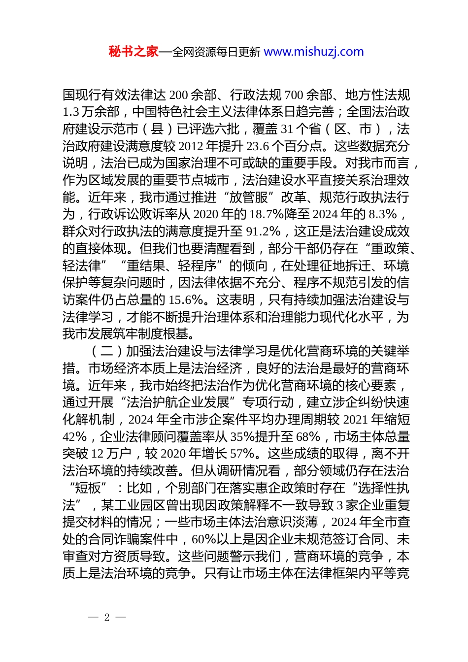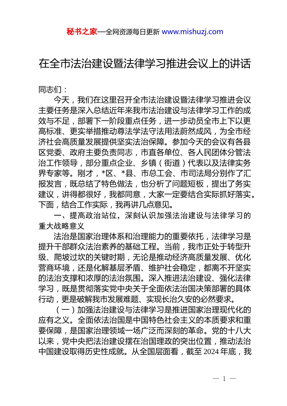 秘书之家—全网资源每日更新 www.mishuzj.com在全市法治建设暨法律学习推进会议上的讲话同志们:今天,我们在这里召开全市法治建设暨法律学习推进会议主要任务是深入总结近年来我市法治建设与法律学习工作的成效与不足,部署下一阶段重点任务,进一步动员全市上下以更高标准、更实举措推动尊法学法守法用法蔚然成风,为全市经济社会高质量发展提供坚实法治保障。参加今天的会议有各县区党委、政府主要负责同志,市直各单位、各人民团体分管法治工作领导,部分重点企业、乡镇(街道)代表以及法律实务界专家等。刚才,*区、*县、市总工会、市司法局分别作了汇报发言,既总结了特色做法,也分析了问题短板,提出了务实建议,讲得都很好,我都同意,大家一定要结合实际抓好落实。下面,结合工作实际,我再讲几点意见。一、提高政治站位,深刻认识加强法治建设与法律学习的重大战略意义法治是国家治理体系和治理能力的重要依托,法律学习是提升干部群众法治素养的基础工程。当前,我市正处于转型升级、爬坡过坎的关键时期,无论是推动经济高质量发展、优化营商环境,还是化解基层矛盾、维护社会稳定,都离不开坚实的法治支撑和浓厚的法治氛围。深入推进法治建设、强化法律学习,既是贯彻落实党中央关于全面依法治国决策部署的具体行动,更是破解我市发展难题、实现长治久安的必然要求。(一)加强法治建设与法律学习是推进国家治理现代化的应有之义。全面依法治国是中国特色社会主义的本质要求和重要保障,是国家治理领域一场广泛而深刻的革命。党的十八大以来,党中央把法治建设摆在治国理政的突出位置,推动法治中国建设取得历史性成就。从全国层面看,截至 2024 年底,我— 1 —秘书之家—全网资源每日更新 www.mishuzj.com国现行有效法律达 200 余部、行政法规 700 余部、地方性法规1.3 万余部,中国特色社会主义法律体系日趋完善;全国法治政府建设示范市(县)已评选六批,覆盖 31 个省(区、市),法治政府建设满意度较 2012 年提升 23.6 个百分点。这些数据充分说明,法治已成为国家治理不可或缺的重要手段。对我市而言,作为区域发展的重要节点城市,法治建设水平直接关系治理效能。近年来,我市通过推进“放管服”改革、规范行政执法行为,行政诉讼败诉率从 2020 年的 18.7%降至 2024 年的 8.3%,群众对行政执法的满意度提升至 91.2%,这正是法治建设成效的直接体现。但我们也要清醒看到,部分干部仍存在“重政策、轻法律”“重结果、轻程序”的倾向,在处理征地拆迁、环境保护等复杂问题时,因法律依据不充分、程序不规范引发的信访案件仍占总量的 15.6%。这表明,只有持续加强法治建设与法律学习,才能不断提升治理体系和治理能力现代化水平,为我市发展筑牢制度根基。(二)加强法治建设与法律学习是优化营商环境的关键举措。市场经济本质上是法治经济,良好的法治是最好的营商环境。近年来,我市始终把法治作为优化营商环境的核心要素,通过开展“法治护航企业发展”专项行动,建立涉企纠纷快速化解机制,2024 年全市涉企案件平均办理周期较 2021 年缩短42%,企业法律顾问覆盖率从 35%提升至 68%,市场主体总量突破 12 万户,较 2020 年增长 57%。这些成绩的取得,离不开法治环境的持续改善。但从调研情况看,部分领域仍存在法治“短板”:比如,个别部门在落实惠企政策时存在“选择性执法”,某工业园区曾出现因政策解释不一致导致 3 家企业重复提交材料的情况;一些市场主体法治意识淡薄,2024 年全市查处的合同诈骗案件中,60%以上是因企业未规范签订合同、未审查对方资质导致。这些问题警示我们,营商环境的竞争,本质上是法治环境的竞争。只有让市场主体在法律框架内平等竞— 2 —秘书之家—全网资源每日更新 www.mishuzj.com争、公平交易,才能吸引更多投资、激发更大活力。而实现这一目标,既需要完善制度供给,更需要推动干部懂法、企业守法、社会用法,让法治成为我市营商环境的“核心竞争力”。(三)加强法治建设与法律学习是维护社会稳定的根本保障。基层稳则全局稳,法治强则基层安。我市作为人口超百万的城市,...