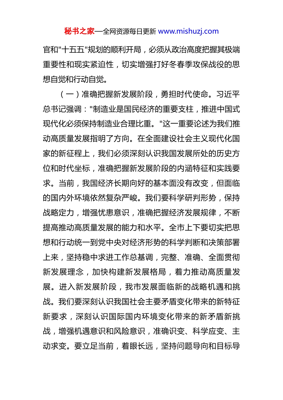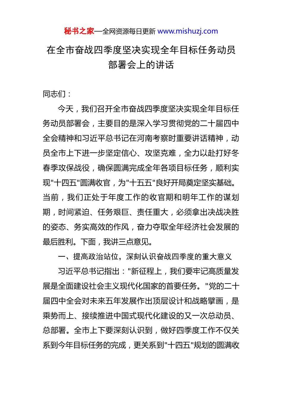 秘书之家—全网资源每日更新 www.mishuzj.com在全市奋战四季度坚决实现全年目标任务动员部署会上的讲话 同志们:今天,我们召开全市奋战四季度坚决实现全年目标任务动员部署会,主要目的是深入学习贯彻党的二十届四中全会精神和习近平总书记在河南考察时重要讲话精神,动员全市上下进一步坚定信心、攻坚克难,全力以赴打好冬春季攻保战役,确保圆满完成全年各项目标任务,顺利实现"十四五"圆满收官,为"十五五"良好开局奠定坚实基础。当前,我们正处于年度工作的收官期和明年工作的谋划期,时间紧迫、任务艰巨、责任重大,必须拿出决战决胜的姿态、务实高效的作风,奋力夺取全年经济社会发展的最后胜利。下面,我讲三点意见。一、提高政治站位,深刻认识奋战四季度的重大意义习近平总书记指出:"新征程上,我们要牢记高质量发展是全面建设社会主义现代化国家的首要任务。"党的二十届四中全会对未来五年发展作出顶层设计和战略擘画,是乘势而上、接续推进中国式现代化建设的又一次总动员、总部署。全市上下要深刻认识到,做好四季度工作不仅关系到今年目标任务的完成,更关系到"十四五"规划的圆满收秘书之家—全网资源每日更新 www.mishuzj.com官和"十五五"规划的顺利开局,必须从政治高度把握其极端重要性和现实紧迫性,切实增强打好冬春季攻保战役的思想自觉和行动自觉。(一)准确把握新发展阶段,勇担时代使命。习近平总书记强调:"制造业是国民经济的重要支柱,推进中国式现代化必须保持制造业合理比重。"这一重要论述为我们推动高质量发展指明了方向。在全面建设社会主义现代化国家的新征程上,我们必须深刻认识我国发展所处的历史方位和时代坐标,准确把握新发展阶段的内涵特征和实践要求。当前,我国经济长期向好的基本面没有改变,但面临的国内外环境依然复杂严峻。我们要科学研判形势,保持战略定力,增强忧患意识,准确把握经济发展规律,不断提高推动高质量发展的能力和水平。全市上下要切实把思想和行动统一到党中央对经济形势的科学判断和决策部署上来,坚持稳中求进工作总基调,完整、准确、全面贯彻新发展理念,加快构建新发展格局,着力推动高质量发展。进入新发展阶段,我市发展面临新的战略机遇和挑战。我们要深刻认识我国社会主要矛盾变化带来的新特征新要求,深刻认识国际国内环境变化带来的新矛盾新挑战,增强机遇意识和风险意识,准确识变、科学应变、主动求变。要立足当前,着眼长远,坚持问题导向和目标导秘书之家—全网资源每日更新 www.mishuzj.com向相结合,着力破解发展难题,增强发展动力,厚植发展优势。要把贯彻落实党的二十届四中全会精神与做好当前工作紧密结合起来,以更高的政治站位、更强的责任担当、更实的工作举措,全力以赴抓好四季度各项工作,确保党中央决策部署在我市落地生根、开花结果。面对新形势新任务,我们要始终保持清醒头脑,既要看到我市经济发展取得的显著成就,也要清醒认识到存在的短板和不足。当前,我市经济保持了稳中有进、稳中提质的良好态势,但稳中承压,困难挑战不容回避。我们要坚定信心,迎难而上,牢牢把握经济工作主动权。要坚持以人民为中心的发展思想,把增进民生福祉作为发展的根本目的,让改革发展成果更多更公平惠及全体人民。要统筹发展和安全,有效防范化解各种风险挑战,为高质量发展创造安全稳定的环境。(二)深入贯彻新发展理念,引领高质量发展。习近平总书记指出:"要持之以恒加强重点流域生态保护治理,深化污染防治攻坚,筑牢生态安全屏障。"这一重要论述深刻阐明了生态文明建设的极端重要性。新发展理念是一个系统的理论体系,回答了关于发展的目的、动力、方式、路径等一系列理论和实践问题,阐明了我们党关于发展的政治立场、价值导向、发展模式、发展道路等重大政治问秘书之家—全网资源每日更新 www.mishuzj.com题。全市上下必须完整、准确、全面贯彻新发展理念,将其贯穿经济社会发展全过程和各领域。坚持创新发展,要把科技创新摆在发展全局的核心位置,以科技创新引领产业创新,加快培育新动能、新优势。要加大研发投入,完善创新体系,优化创新生态,促进科技与经济深度融合。要聚...