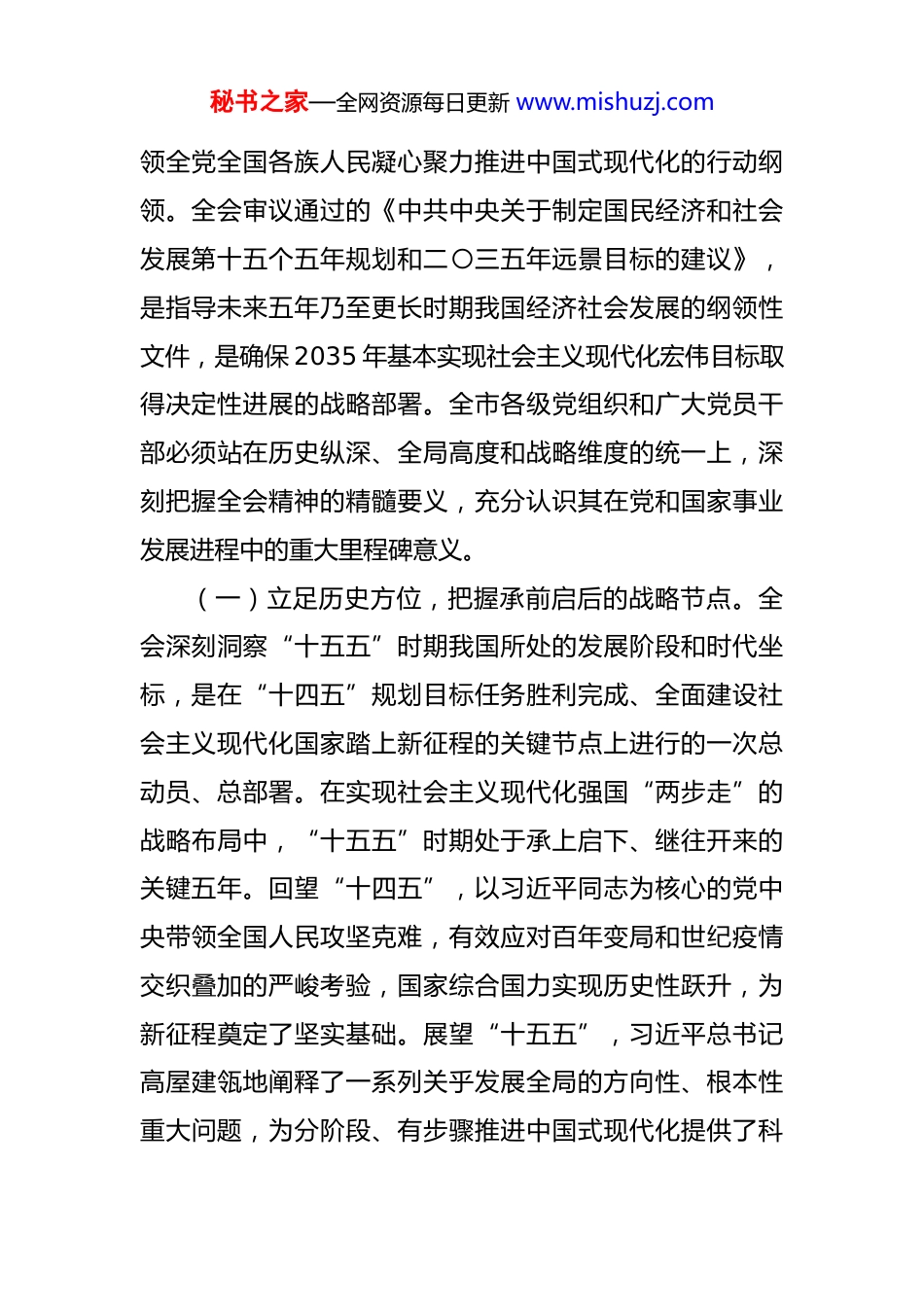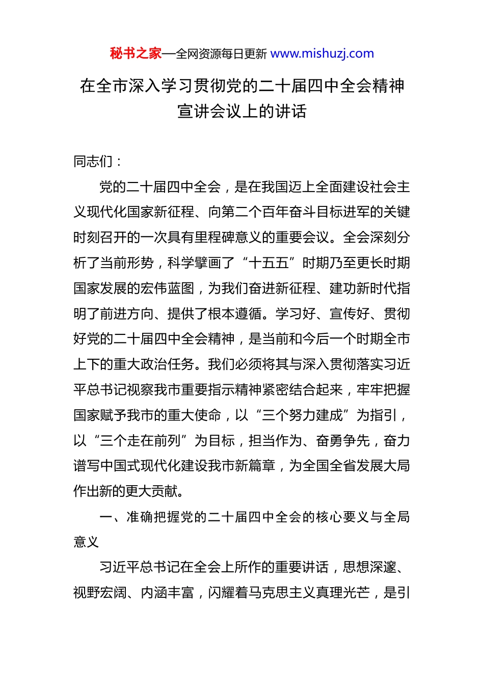 秘书之家—全网资源每日更新 www.mishuzj.com在全市深入学习贯彻党的二十届四中全会精神宣讲会议上的讲话 同志们:党的二十届四中全会,是在我国迈上全面建设社会主义现代化国家新征程、向第二个百年奋斗目标进军的关键时刻召开的一次具有里程碑意义的重要会议。全会深刻分析了当前形势,科学擘画了“十五五”时期乃至更长时期国家发展的宏伟蓝图,为我们奋进新征程、建功新时代指明了前进方向、提供了根本遵循。学习好、宣传好、贯彻好党的二十届四中全会精神,是当前和今后一个时期全市上下的重大政治任务。我们必须将其与深入贯彻落实习近平总书记视察我市重要指示精神紧密结合起来,牢牢把握国家赋予我市的重大使命,以“三个努力建成”为指引,以“三个走在前列”为目标,担当作为、奋勇争先,奋力谱写中国式现代化建设我市新篇章,为全国全省发展大局作出新的更大贡献。一、准确把握党的二十届四中全会的核心要义与全局意义习近平总书记在全会上所作的重要讲话,思想深邃、视野宏阔、内涵丰富,闪耀着马克思主义真理光芒,是引秘书之家—全网资源每日更新 www.mishuzj.com领全党全国各族人民凝心聚力推进中国式现代化的行动纲领。全会审议通过的《中共中央关于制定国民经济和社会发展第十五个五年规划和二〇三五年远景目标的建议》,是指导未来五年乃至更长时期我国经济社会发展的纲领性文件,是确保 2035 年基本实现社会主义现代化宏伟目标取得决定性进展的战略部署。全市各级党组织和广大党员干部必须站在历史纵深、全局高度和战略维度的统一上,深刻把握全会精神的精髓要义,充分认识其在党和国家事业发展进程中的重大里程碑意义。(一)立足历史方位,把握承前启后的战略节点。全会深刻洞察“十五五”时期我国所处的发展阶段和时代坐标,是在“十四五”规划目标任务胜利完成、全面建设社会主义现代化国家踏上新征程的关键节点上进行的一次总动员、总部署。在实现社会主义现代化强国“两步走”的战略布局中,“十五五”时期处于承上启下、继往开来的关键五年。回望“十四五”,以习近平同志为核心的党中央带领全国人民攻坚克难,有效应对百年变局和世纪疫情交织叠加的严峻考验,国家综合国力实现历史性跃升,为新征程奠定了坚实基础。展望“十五五”,习近平总书记高屋建瓴地阐释了一系列关乎发展全局的方向性、根本性重大问题,为分阶段、有步骤推进中国式现代化提供了科秘书之家—全网资源每日更新 www.mishuzj.com学指引。对我市而言,“十五五”时期是巩固提升“三个努力建成”成果、加速迈向高质量发展新阶段、开启基本现代化新征程的攻坚突破期。我们必须抢抓这一至关重要的时间窗口,凝聚全市智慧和力量,奋发有为,努力在推进中国式现代化场景中走在前列、作出表率。(二)洞察形势变化,强化识变应变的辩证思维。全会科学研判“十五五”时期我国发展环境面临的深刻复杂变化,明确指出“我国发展面临战略机遇和风险挑战并存、不确定难预料因素增多的时期”。这要求我们务必运用辩证唯物主义和历史唯物主义的世界观方法论,深刻把握危与机、变与不变的辩证关系,增强忧患意识,树立底线思维,以更加积极主动的姿态应对挑战、化解风险、推动发展。一方面,要坚定信心、迎难而上,在危机中育新机、于变局中开新局。我市作为资源型重工业城市和对外开放的重要窗口,产业结构调整、绿色低碳转型、外部需求波动带来的挑战更为直接,维护产业链供应链安全、防范化解各类风险的任务更为艰巨。我们必须发扬“特别能战斗”的精神,敢于斗争、善于斗争,在应对风高浪急甚至惊涛骇浪的重大考验中,保持战略定力,牢牢掌握发展主动权。另一方面,要立足禀赋、发挥优势,集中力量办好自己的事。要充分发挥我市独特的区位交通优势、雄厚秘书之家—全网资源每日更新 www.mishuzj.com的产业基础优势、丰富的资源要素优势以及区域协同发展的战略叠加优势,以自身工作的确定性有效对冲外部环境的不确定性,不断塑造发展新动能新优势。(三)聚焦宏伟蓝图,锚定续写辉煌的实践路径。全会精准锚定“十五五”时期的历史方位和阶段性特征,统筹国内国际两个大局,兼顾当前长远发展...