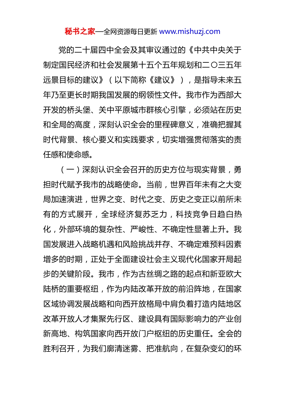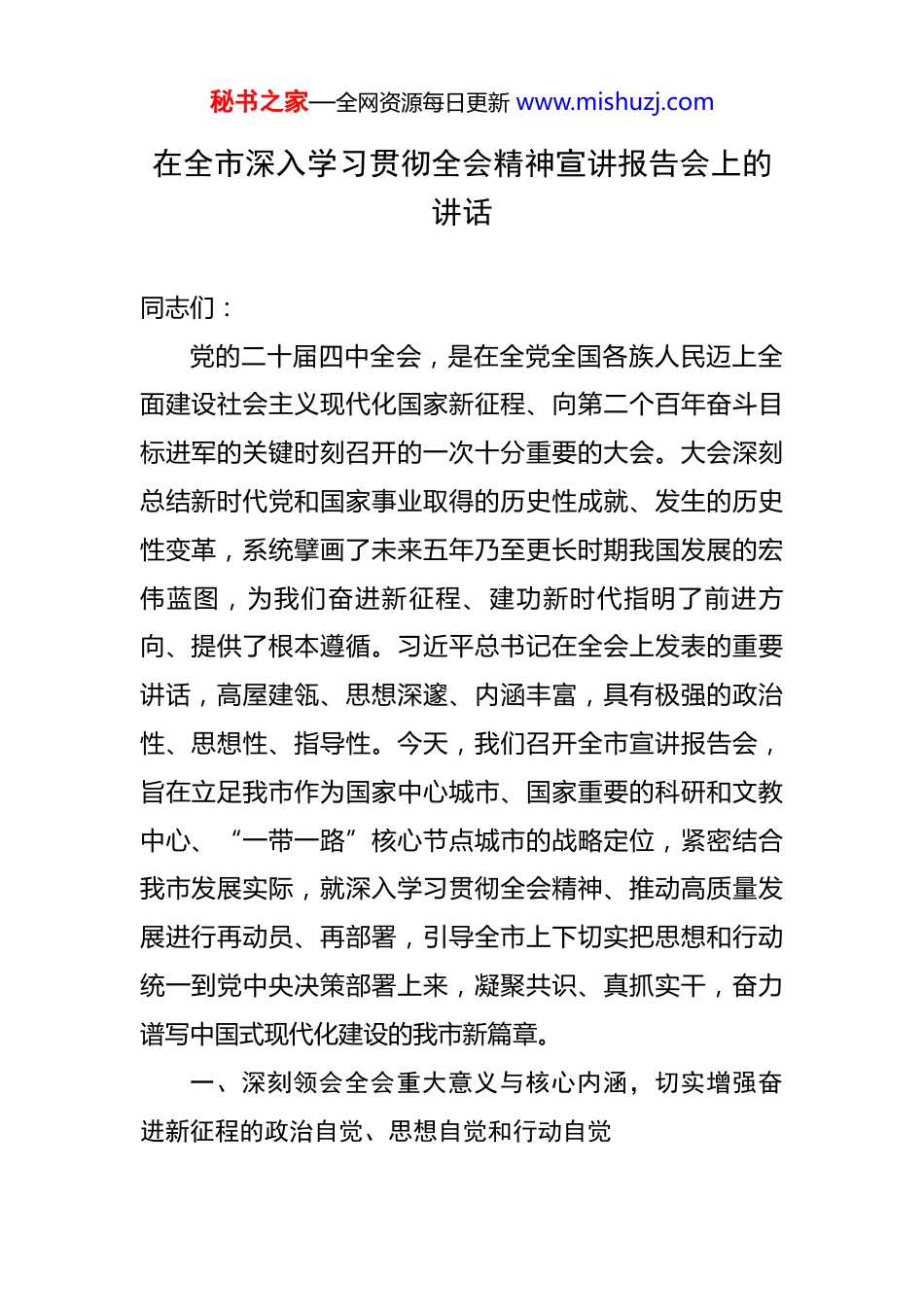 秘书之家—全网资源每日更新 www.mishuzj.com在全市深入学习贯彻全会精神宣讲报告会上的讲话 同志们:党的二十届四中全会,是在全党全国各族人民迈上全面建设社会主义现代化国家新征程、向第二个百年奋斗目标进军的关键时刻召开的一次十分重要的大会。大会深刻总结新时代党和国家事业取得的历史性成就、发生的历史性变革,系统擘画了未来五年乃至更长时期我国发展的宏伟蓝图,为我们奋进新征程、建功新时代指明了前进方向、提供了根本遵循。习近平总书记在全会上发表的重要讲话,高屋建瓴、思想深邃、内涵丰富,具有极强的政治性、思想性、指导性。今天,我们召开全市宣讲报告会,旨在立足我市作为国家中心城市、国家重要的科研和文教中心、“一带一路”核心节点城市的战略定位,紧密结合我市发展实际,就深入学习贯彻全会精神、推动高质量发展进行再动员、再部署,引导全市上下切实把思想和行动统一到党中央决策部署上来,凝聚共识、真抓实干,奋力谱写中国式现代化建设的我市新篇章。一、深刻领会全会重大意义与核心内涵,切实增强奋进新征程的政治自觉、思想自觉和行动自觉秘书之家—全网资源每日更新 www.mishuzj.com党的二十届四中全会及其审议通过的《中共中央关于制定国民经济和社会发展第十五个五年规划和二〇三五年远景目标的建议》(以下简称《建议》),是指导未来五年乃至更长时期我国发展的纲领性文件。我市作为西部大开发的桥头堡、关中平原城市群核心引擎,必须站在历史和全局的高度,深刻认识全会的里程碑意义,准确把握其时代背景、核心要义和实践要求,切实增强贯彻落实的责任感和使命感。(一)深刻认识全会召开的历史方位与现实背景,勇担时代赋予我市的战略使命。当前,世界百年未有之大变局加速演进,世界之变、时代之变、历史之变正以前所未有的方式展开,全球经济复苏乏力,科技竞争日趋白热化,外部环境的复杂性、严峻性、不确定性显著上升。我国发展进入战略机遇和风险挑战并存、不确定难预料因素增多的时期,正处于全面建设社会主义现代化国家开局起步的关键阶段。我市,作为古丝绸之路的起点和新亚欧大陆桥的重要枢纽,作为内陆改革开放的前沿阵地,在国家区域协调发展战略和向西开放格局中肩负着打造内陆地区改革开放人才集聚先行区、建设具有国际影响力的产业创新高地、构筑国家向西开放门户枢纽的历史重任。全会的胜利召开,为我们廓清迷雾、把准航向,在复杂变幻的环秘书之家—全网资源每日更新 www.mishuzj.com境中找准定位、在激烈的区域竞争中抢占先机提供了强大的战略指引和行动指南,对于凝聚全市上下磅礴力量,加快建设国家中心城市、奋力推进中国式现代化我市实践具有极其重大而深远的现实意义和历史意义。(二)深刻感悟中国特色社会主义制度伟力,坚定谱写我市新篇的强大信心与决心。“十四五”以来,我市在国家战略指引下,在习近平新时代中国特色社会主义思想科学指引下,克服诸多困难挑战,经济社会发展取得了令人瞩目的成就:实现了经济总量突破万亿、常住人口超千万的历史性跨越,城市能级显著提升;获批建设综合性国家科学中心,科技创新策源功能不断增强;中欧班列开行量、货运量、重箱率等核心指标连续多年保持全国领先,“钢铁驼队”成为服务国家开放大局的亮丽名片;成功创建国家生态文明建设示范市,绿水青山画卷徐徐展开;历史文化名城保护与现代城市发展相得益彰,“长安夜”等文旅品牌享誉全国。这些成绩的取得,最根本在于习近平总书记的亲切关怀和党中央的坚强领导,是省委省政府正确领导的结果,是全市人民团结奋斗的结果,更是中国特色社会主义制度巨大优越性在西部欠发达地区生动实践的充分印证。《建议》对“十四五”辉煌成就的系统总结,使我们更加深刻认识到“两个确立”的决定性意义,更加秘书之家—全网资源每日更新 www.mishuzj.com坚定了我们沿着习近平总书记指引的方向奋勇前进、以高质量发展开创我市现代化建设新局面的必胜信念和坚强决心。(三)深刻把握《建议》赋予我市的战略机遇与清晰路径,明确未来发展的主攻方向。《建议》立足全局、着眼长远,提出了一系列事关长远发展的重大战略部署:“深入...