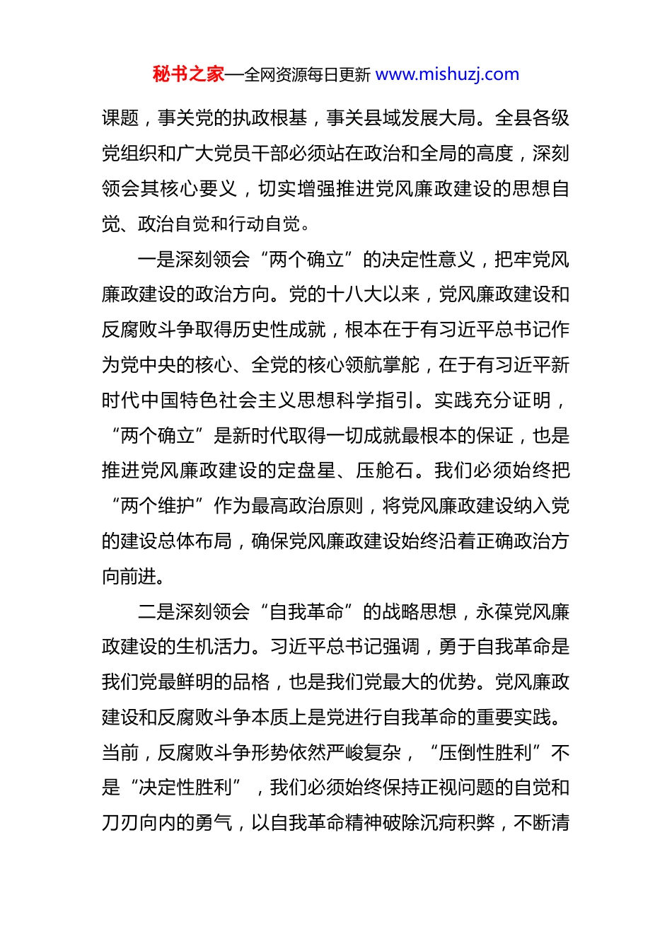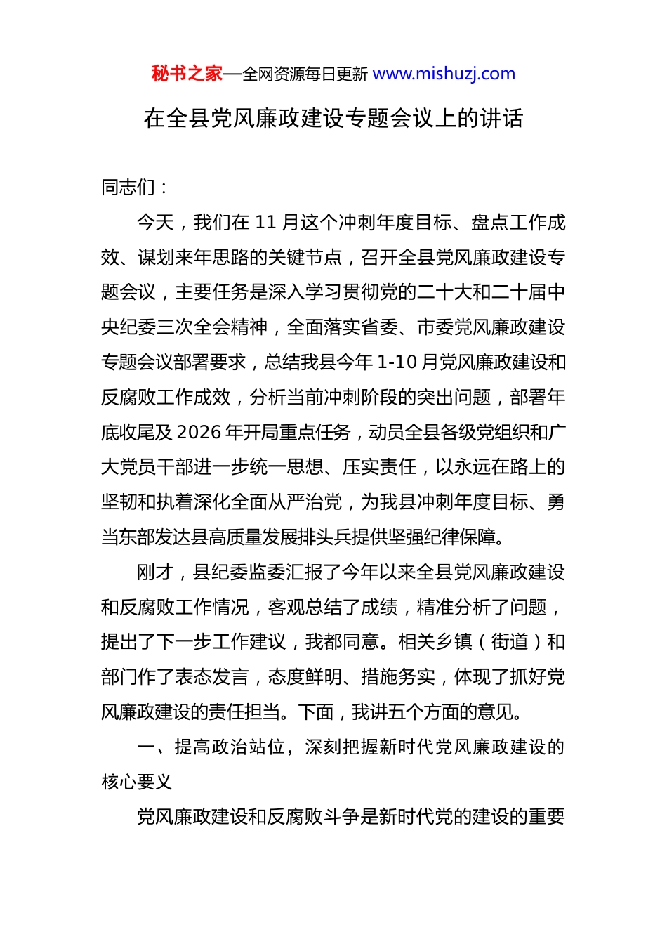 秘书之家—全网资源每日更新 www.mishuzj.com在全县党风廉政建设专题会议上的讲话 同志们:今天,我们在 11 月这个冲刺年度目标、盘点工作成效、谋划来年思路的关键节点,召开全县党风廉政建设专题会议,主要任务是深入学习贯彻党的二十大和二十届中央纪委三次全会精神,全面落实省委、市委党风廉政建设专题会议部署要求,总结我县今年 1-10 月党风廉政建设和反腐败工作成效,分析当前冲刺阶段的突出问题,部署年底收尾及 2026 年开局重点任务,动员全县各级党组织和广大党员干部进一步统一思想、压实责任,以永远在路上的坚韧和执着深化全面从严治党,为我县冲刺年度目标、勇当东部发达县高质量发展排头兵提供坚强纪律保障。刚才,县纪委监委汇报了今年以来全县党风廉政建设和反腐败工作情况,客观总结了成绩,精准分析了问题,提出了下一步工作建议,我都同意。相关乡镇(街道)和部门作了表态发言,态度鲜明、措施务实,体现了抓好党风廉政建设的责任担当。下面,我讲五个方面的意见。一、提高政治站位,深刻把握新时代党风廉政建设的核心要义党风廉政建设和反腐败斗争是新时代党的建设的重要秘书之家—全网资源每日更新 www.mishuzj.com课题,事关党的执政根基,事关县域发展大局。全县各级党组织和广大党员干部必须站在政治和全局的高度,深刻领会其核心要义,切实增强推进党风廉政建设的思想自觉、政治自觉和行动自觉。一是深刻领会“两个确立”的决定性意义,把牢党风廉政建设的政治方向。党的十八大以来,党风廉政建设和反腐败斗争取得历史性成就,根本在于有习近平总书记作为党中央的核心、全党的核心领航掌舵,在于有习近平新时代中国特色社会主义思想科学指引。实践充分证明,“两个确立”是新时代取得一切成就最根本的保证,也是推进党风廉政建设的定盘星、压舱石。我们必须始终把“两个维护”作为最高政治原则,将党风廉政建设纳入党的建设总体布局,确保党风廉政建设始终沿着正确政治方向前进。二是深刻领会“自我革命”的战略思想,永葆党风廉政建设的生机活力。习近平总书记强调,勇于自我革命是我们党最鲜明的品格,也是我们党最大的优势。党风廉政建设和反腐败斗争本质上是党进行自我革命的重要实践。当前,反腐败斗争形势依然严峻复杂,“压倒性胜利”不是“决定性胜利”,我们必须始终保持正视问题的自觉和刀刃向内的勇气,以自我革命精神破除沉疴积弊,不断清秘书之家—全网资源每日更新 www.mishuzj.com除一切损害党的先进性和纯洁性的因素,确保党永葆生机活力。三是深刻领会“服务大局”的鲜明导向,彰显党风廉政建设的实践价值。党风廉政建设从来不是孤立的工作,而是服务中心、保障大局的重要支撑。对我县而言,当前已进入 11 月关键期,既要全力冲刺 GDP、项目建设等年度核心指标,又要科学谋划“十五五”开局思路,越是任务繁重、时间紧迫,越需要坚强的纪律保障护航。我们必须把党风廉政建设与年度目标冲刺、民生实事收尾、安全稳定保障等当前重点工作同部署、同推进、同落实,以风清气正的政治生态凝聚冲刺合力,确保全年工作收好官、来年工作开好局。四是深刻领会“人民至上”的根本立场,夯实党风廉政建设的群众根基。党风廉政建设的成效,最终要以群众满意度为检验标准。群众身边的不正之风和腐败问题,直接损害群众切身利益,侵蚀党的执政根基。我们必须始终坚持以人民为中心的发展思想,把整治群众身边腐败和作风问题作为重中之重,切实解决好群众急难愁盼问题,让群众在全面从严治党中感受到公平正义,不断增强获得感、幸福感、安全感。二、聚焦重点任务,精准把握今年以来党风廉政建设秘书之家—全网资源每日更新 www.mishuzj.com的成效亮点今年 1-10 月,全县各级党组织和纪检监察机关深入贯彻全面从严治党战略方针,牢固树立“抓好党建是最大政绩”的理念,以党风廉政建设责任制为抓手,扎实推进党风廉政建设和反腐败各项工作,为前期发展提供了有力保障,呈现出“五个持续”的良好态势。一是政治建设持续加强,政治引领作用更加凸显。始终把党的政治建设摆在首位,坚持以习近平新时代中国特色社会主义思想凝心铸魂,1-10...