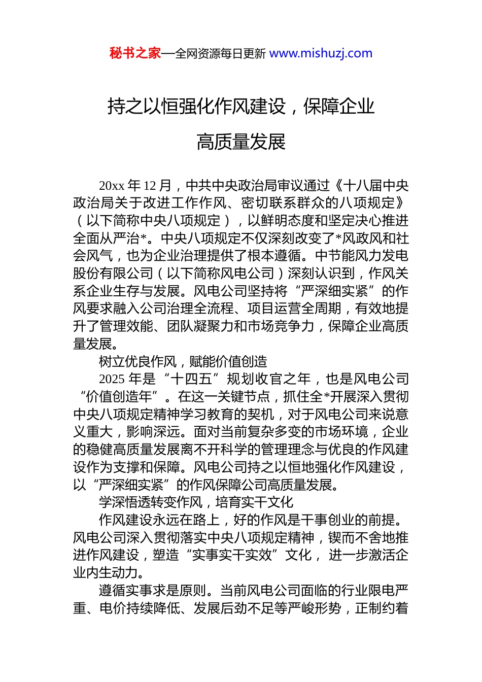 秘书之家—全网资源每日更新 www.mishuzj.com持之以恒强化作风建设,保障企业高质量发展20xx 年 12 月,中共中央政治局审议通过《十八届中央政治局关于改进工作作风、密切联系群众的八项规定》(以下简称中央八项规定),以鲜明态度和坚定决心推进全面从严治*。中央八项规定不仅深刻改变了*风政风和社会风气,也为企业治理提供了根本遵循。中节能风力发电股份有限公司(以下简称风电公司)深刻认识到,作风关系企业生存与发展。风电公司坚持将“严深细实紧”的作风要求融入公司治理全流程、项目运营全周期,有效地提升了管理效能、团队凝聚力和市场竞争力,保障企业高质量发展。树立优良作风,赋能价值创造2025 年是“十四五”规划收官之年,也是风电公司“价值创造年”。在这一关键节点,抓住全*开展深入贯彻中央八项规定精神学习教育的契机,对于风电公司来说意义重大,影响深远。面对当前复杂多变的市场环境,企业的稳健高质量发展离不开科学的管理理念与优良的作风建设作为支撑和保障。风电公司持之以恒地强化作风建设,以“严深细实紧”的作风保障公司高质量发展。学深悟透转变作风,培育实干文化作风建设永远在路上,好的作风是干事创业的前提。风电公司深入贯彻落实中央八项规定精神,锲而不舍地推进作风建设,塑造“实事实干实效”文化, 进一步激活企业内生动力。遵循实事求是原则。当前风电公司面临的行业限电严重、电价持续降低、发展后劲不足等严峻形势,正制约着秘书之家—全网资源每日更新 www.mishuzj.com其高效稳健的发展。必须坚持实事求是, 积极从行业周期上汲取经验,从行业变革上寻找机遇,从国家政策上抢抓先机, 从自身管理上促进提升。要深刻把握新能源产业、战略性新兴产业未来的广阔市场空间,对外精准识别当前市场竞争态势下自身的短板,对内清晰梳理自身具备的核心能力,秉持实事求是的实干精神,才能在重重挑战中稳健前行,在激烈竞争中实现可持续且高质量的发展。锻造实干担当品质。实干是连通“知”与“行”的桥梁,一“实”当先胜过百“巧”谎辩。企业发展的一切难题只有在实干中才能破解,市场浪潮的一切机遇只有在实干中才能把握,美好未来的一切愿景只有在实干中才能实现。实干意味着面对任务不推诿、不拖延,主动请缨、积极担当。项目建设中,扎根一线,日夜奋战,用汗水与智慧攻克技术难题,让项目得以按时并网市场拓展中,不惧奔波,深入各地,凭借扎实的专业知识与真诚态度获取项目。激活干事创业动力。要建立健全薪酬、绩效、选拔等激励机制,压缩晋升层级,让真想干的人有机会、有舞台让“躺平”混日子的人没市场、靠边站, 在制定政策和分配资源时,要向实干者倾斜,让“实干担当”真正融入日常、成为文化,让实干成为*员干部身上最鲜明的特征。要加强全系统“跨岗位、跨部门、跨专业”轮岗锻炼,提高干部职工的政策水平、业务能力和综合素质, 培养更多高素质复合型人才,切切实实以转作风、锻本领、挑担子、干实事, 为风电公司增加人才储备,为项目解难题,为发展添动力。深化作风建设,提升管理质效风电公司深化作风建设,着重提升发展质效,提升价值创造能力和核心竞争能力,向管理要效率、要效益。加快数字赋能秘书之家—全网资源每日更新 www.mishuzj.com一是要持续提升经营管理数智化水平,完善四合一智慧运维云平台、智慧场站综合解决方案、区域集控系统和场站 cms 系统成果应用,通过构建统一的数据分析平台,实现全链路数据打通,实现信息的实时共享和快速传递。二是要聚焦场景应用,开发 ai 电力交易辅助决策系统,构建大数据智能分析平台,打造风电运维智能助手,集成电价预测算法,打造出契合业务流程的场景式操作, 促进业务建设向模块化、标准化和规范化方向发展,持续深度挖潜、优化整合现有系统使用功能,不断提高信息系统集约化使用效率。三是要面向赋能主业和相关多元发展继续开展重点研发项目布局,在风电场智能化运维,生产管理数字化、智能化建设,大数据与人工智能等方面立项一批关键核心技术攻关项目。推进项目全流程运作坚决打破部门业务壁垒,树立一切围着项目转的鲜明导向,围绕整体目标...