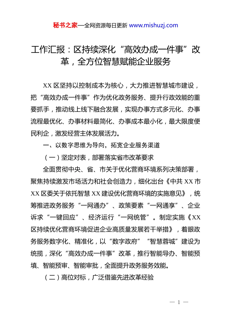 秘书之家—全网资源每日更新 www.mishuzj.com工作汇报:区持续深化“高效办成一件事”改革,全方位智慧赋能企业服务XX 区坚持以控制成本为核心,大力推进智慧城市建设,把“高效办成一件事”作为优化政务服务、提升行政效能的重要抓手,推动线上线下融合发展,实现办事方式多元化、办事流程最优化、办事材料最简化、办事成本最小化,最大限度便民利企,激发经营主体发展活力。一、以数字思维为导向,拓宽企业服务渠道(一)坚定对表,部署落实省市改革要求全面贯彻中央、省、市关于优化营商环境系列决策部署,聚焦持续激发市场活力和社会创造力,细化出台《中共 XX 市XX 区委关于依托智慧 XX 建设优化营商环境的实施意见》,统筹推进政务服务“一网通办”、政策要素“一网通享”、企业诉求“一键回应”、经济运行“一网统管”。制定实施《XX区持续优化营商环境促进企业高质量发展若干举措》,着眼政务服务数字化、精准化,以“数字政府”“智慧蓉城”建设为统揽,深化“高效办成一件事”改革,推行智能导办、智能预填、智能预审、智能审批,全面提升政务服务效能。(二)高位对标,广泛借鉴先进改革经验— 1 —秘书之家—全网资源每日更新 www.mishuzj.com借鉴上海、浙江等地推进政务数字化转型以及运用人工智能技术赋能政务服务的先进经验,聚焦“高效”“办成”,强化数字赋能,推广电子亮证、在线核验、证照下载等便利化应用,启动政务服务云端智库、智能审批辅助、经营地址核验助手等“互联网+政务服务”创新应用建设,拓展“信易+”信用服务应用场景,推动“一网通办”向“智慧好办”升级。围绕企业群众办事过程中遇到看不懂政策、不会办等方面问题,试点打造政务服务客服人工智能应用场景,推出 50 项高频事项线上专业帮办服务,推进通过人工智能辅助,实现办事过程“少填少交智能审”,为企业群众提供智能预填、智能预审、智能生成材料等服务。二、以数字连通为核心,推动企业服务增效(一)系统梳理服务事项,彻底厘清政务服务底数以“数据关系”替代“行权事项”作为业务梳理单元,按照“事项-情形-材料-字段-数源”对政务服务事项进行最小颗粒度拆解,完成全区 1278 个行政审批和政务服务事项梳理,推进行政许可事项“一单一图一表”审批,优化高频事项办理流程。优化“一件事一次办”运行管理机制,完成“一件事一次办”系统配置 134 个,推动政务服务从“以部门为中心”向“以事项为中心”转变,材料一次性提交,事务一次性办结,— 2 —秘书之家—全网资源每日更新 www.mishuzj.com办理环节可压缩 60%以上,审批时间可压缩 50%以上,审批材料可减少 50%左右。(二)聚类重塑服务内容,编制涉企服务事项清单全面重塑政务服务职能,运用数字化手段,推动政务服务优化再造,针对部门职能交叉、事项类型不准等问题,分类施策,大力强化政务数据共享,设定证照共享、文件协同、信息核验等多种数据归集和共享途径,实现 722 项行政审批事项容缺候补办理、100 个简单事项“秒批秒办”、50 项高频事项线上专业帮办服务。(三)整合多方服务资源,实现政策“一站式”优享完善涉企政策一站式发布机制,依托“蓉易享”平台,围绕企业全生命周期和产业全链条,全面收集梳理惠企政策,累计发布 21 项惠企政策,配置上线 47 项服务内容。建立“一企一档”,依托政务大数据提升政策、企业“双画像”水平,分析圈定政策适用对象,定制精准推送政策内容,促进政策申报便捷易达,提高政策精准找企业能力。建立 12345 亲清在线政策直播制度,对接区级各部门,为企业群众提供通俗易懂、喜闻乐见的政策宣传解读及问答互动。2024 年上半年,全区兑付惠企资金 XX 万元,惠及企业 319 家。三、以数字赋能为手段,深化服务模式创新— 3 —秘书之家—全网资源每日更新 www.mishuzj.com(一)打造服务平台,深化“一网通办”水平围绕“底座+应用+门户”攻坚方向,搭建“小郫在线”政务服务实时互动平台,利用 3D 引擎打造全区“数字政务地图”,实现一图网罗政务网点,一键检索服务信息,已纳入预约办理、排号查询等事项服务 104 项,提...