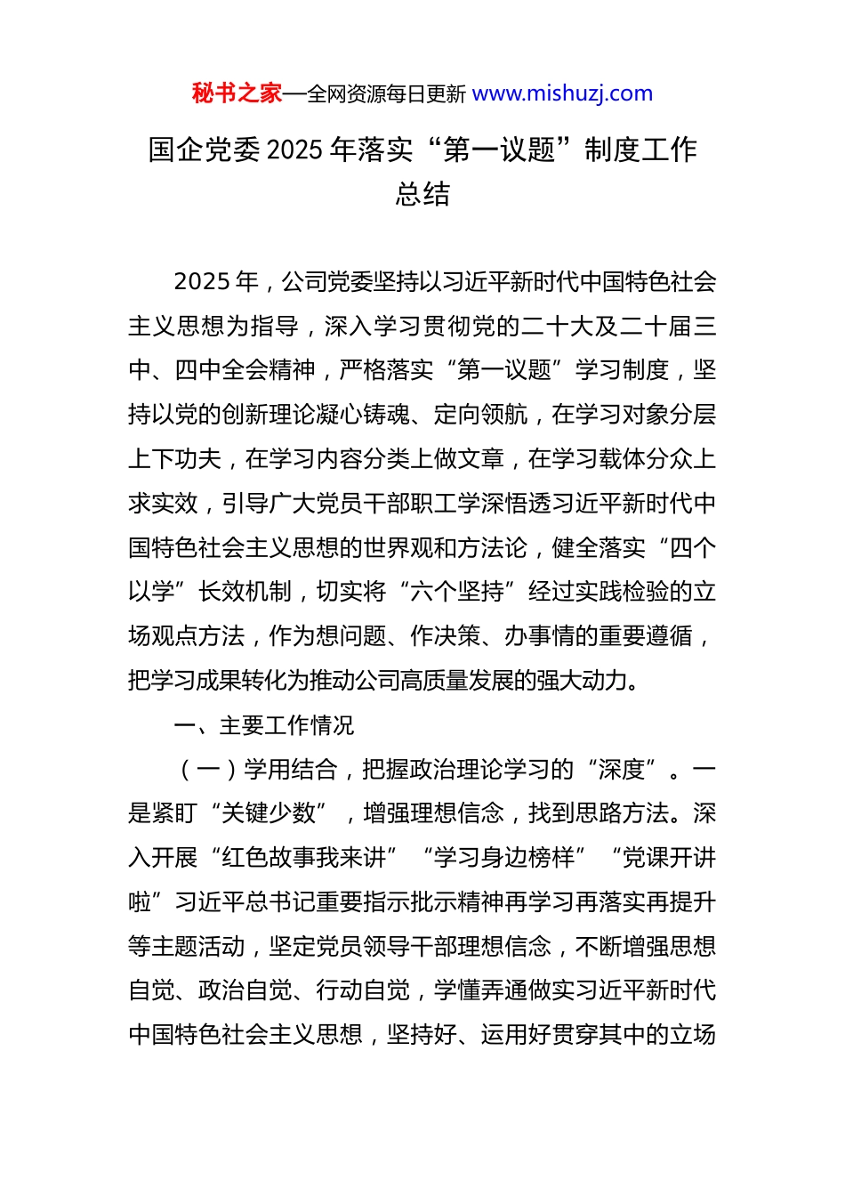秘书之家—全网资源每日更新 www.mishuzj.com国企党委 2025 年落实“第一议题”制度工作总结 2025 年,公司党委坚持以习近平新时代中国特色社会主义思想为指导,深入学习贯彻党的二十大及二十届三中、四中全会精神,严格落实“第一议题”学习制度,坚持以党的创新理论凝心铸魂、定向领航,在学习对象分层上下功夫,在学习内容分类上做文章,在学习载体分众上求实效,引导广大党员干部职工学深悟透习近平新时代中国特色社会主义思想的世界观和方法论,健全落实“四个以学”长效机制,切实将“六个坚持”经过实践检验的立场观点方法,作为想问题、作决策、办事情的重要遵循,把学习成果转化为推动公司高质量发展的强大动力。一、主要工作情况(一)学用结合,把握政治理论学习的“深度”。一是紧盯“关键少数”,增强理想信念,找到思路方法。深入开展“红色故事我来讲”“学习身边榜样”“党课开讲啦”习近平总书记重要指示批示精神再学习再落实再提升等主题活动,坚定党员领导干部理想信念,不断增强思想自觉、政治自觉、行动自觉,学懂弄通做实习近平新时代中国特色社会主义思想,坚持好、运用好贯穿其中的立场秘书之家—全网资源每日更新 www.mishuzj.com观点方法,发挥“领头雁”领航定向作用。二是突出“先锋模范”,增强党性修养,强化示范引领。着力通过“不忘初心、牢记使命”“党史学习教育”“学习贯彻习近平新时代中国特色社会主义思想主题教育”“党纪学习教育”“深入贯彻中央八项规定精神学习教育”等面向全体党员的党内教育,重点做好党的基本路线、方针政策的学习、贯彻和执行,夯实信仰之基,锤炼政治品格,聚焦解决基层党员群众普遍关心的热点、重点、疑点、难点问题上,提高干事创业能力与水平充分发挥“先锋队”示范引领作用。三是聚焦“绝大多数”,增强情感认同,凝聚发展合力。利用班组会开展“班前十分钟活动”,采取理论骨干领讲,全员轮流领读的模式,规范引领“集中学”。深入开展“职工大讲堂”活动,鼓励职工群众把职责摆进去、把工作摆进去,以演讲或微课等形式进行专题发言,引导大家学理论、谈收获,增强政治学习促进职工群众理想信念、价值理念、道德观念紧密团结的作用,充分发挥“细胞群”赋能添力作用。(二)精准施策,把握政治理论学习的“精度”。一是层次分明有侧重,避免“上下一般粗”。坚持印发年度理论学习计划,定期下发党委中心组和党支部“三会一课”学习内容参考,依据学习主体特点与需求,避免理论秘书之家—全网资源每日更新 www.mishuzj.com学习“层层加码”的现象,紧密结合业务职能分解学习,差异化定制不同学习内容的“书包”。精选有关学习内容,分篇章、分阶段、有重点地安排学习计划,采用“个人自学+集体研讨”相结合的方式,提高党员对于党的基本路线方针政策的理解和掌握。二是系统深入有聚焦,防止“左右一个样”。聚焦把大本子讲薄、把大道理学透,对内容精选,由“蜻蜓点水”泛读深化到“入木三分”精读。在全面学习领会的基础上,重点梳理党的十八大以来习近平总书记关于党的建设、生态文明、能源绿色低碳发展、科技创新、发展国有经济等系列重要论述及相关权威辅导资料,形成学习资料库,为不同类型、不同专业党组织量身定制理论学习“套餐”,推动由泛读向精读深化。三是精细加工有深浅,拒绝“一个方子吃药”。精准把握分众主体需求,聚焦党委领导、党支部、班组“三个层面”,构建“党委一党支部一班组”三级联动学习机制,突出学习主体分众化、学习形式多样化、学习内容差异化、学习要求精准化,进行有针对性的政治理论教育,推动理论武装从党委向党支部、班组延伸,从“关键少数”向党员干部、职工群众拓展。(三)用活机制,增强政治理论学习的“广度”。一是坚持“规范化”干部学习制度。严格落实党委会“第一秘书之家—全网资源每日更新 www.mishuzj.com议题”和党委理论学习中心组制度,举办专题读书班,邀请专家授课辅导,扎实开展研讨交流和理论宣讲,深入基层一线开展调查研究,认真撰写学习心得、调研报告或理论文章,坚持学以致用、用以促学,熟练掌握党的理论创新成果,不断提高解决改革...