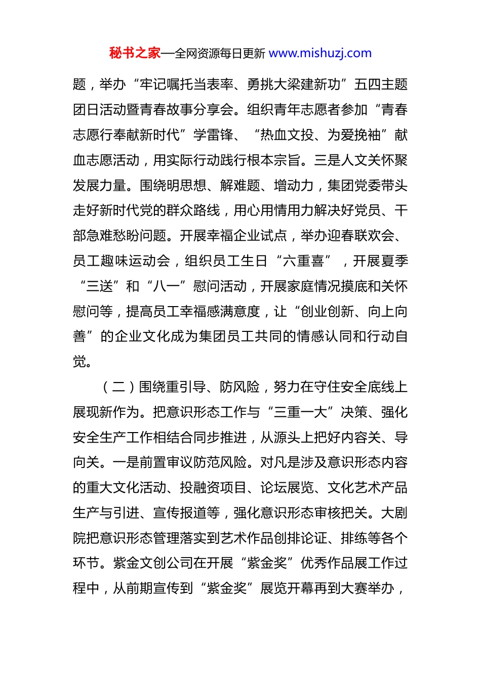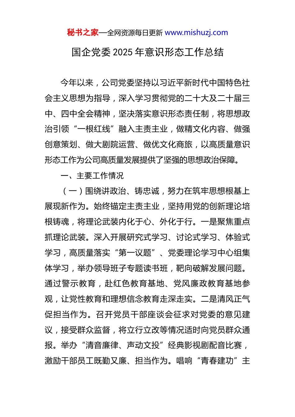 秘书之家—全网资源每日更新 www.mishuzj.com国企党委 2025 年意识形态工作总结 今年以来,公司党委坚持以习近平新时代中国特色社会主义思想为指导,深入学习贯彻党的二十大及二十届三中、四中全会精神,坚决落实意识形态责任制,将思想政治引领“一根红线”融入主责主业,做精文化内容、做强创意策划、做大剧院运营、做优文化商旅,以高质量意识形态工作为公司高质量发展提供了坚强的思想政治保障。一、主要工作情况(一)围绕讲政治、铸忠诚,努力在筑牢思想根基上展现新作为。始终锚定主责主业,坚持用党的创新理论培根铸魂,将理论武装内化于心、外化于行。一是聚焦重点抓理论武装。深入开展研究式学习、讨论式学习、体验式学习,高质量落实“第一议题”、党委理论学习中心组集体学习,举办领导班子专题读书班,靶向破解发展问题。通过警示教育,赴红色教育基地、党风廉政教育基地参观,让党性教育和理想信念教育走深走实。二是清风正气促担当作为。召开党员干部座谈会征求对党委的意见建议,接受群众监督,将立行立改等情况适时向党员群众通报。举办“清音廉律、声动文投”经典影视剧配音比赛,激励干部员工既勤又廉、担当作为。唱响“青春建功”主秘书之家—全网资源每日更新 www.mishuzj.com题,举办“牢记嘱托当表率、勇挑大梁建新功”五四主题团日活动暨青春故事分享会。组织青年志愿者参加“青春志愿行奉献新时代”学雷锋、“热血文投、为爱挽袖”献血志愿活动,用实际行动践行根本宗旨。三是人文关怀聚发展力量。围绕明思想、解难题、增动力,集团党委带头走好新时代党的群众路线,用心用情用力解决好党员、干部急难愁盼问题。开展幸福企业试点,举办迎春联欢会、员工趣味运动会,组织员工生日“六重喜”,开展夏季“三送”和“八一”慰问活动,开展家庭情况摸底和关怀慰问等,提高员工幸福感满意度,让“创业创新、向上向善”的企业文化成为集团员工共同的情感认同和行动自觉。(二)围绕重引导、防风险,努力在守住安全底线上展现新作为。把意识形态工作与“三重一大”决策、强化安全生产工作相结合同步推进,从源头上把好内容关、导向关。一是前置审议防范风险。对凡是涉及意识形态内容的重大文化活动、投融资项目、论坛展览、文化艺术产品生产与引进、宣传报道等,强化意识形态审核把关。大剧院把意识形态管理落实到艺术作品创排论证、排练等各个环节。紫金文创公司在开展“紫金奖”优秀作品展工作过程中,从前期宣传到“紫金奖”展览开幕再到大赛举办,秘书之家—全网资源每日更新 www.mishuzj.com严把意识形态关,强化风险管控,签订保密承诺书,做到事前必审、实时追踪,提前做好预案,杜绝意识形态问题发生。文投资本公司和大运文旅公司持续关注所投电视剧《北上》热度,开展“跟着《北上》游运河”系列文旅推广活动,紧密跟进动态消息,规范平台发布流程,加强内容审核。二是加强管理筑牢防线。加强对企业文化活动、展览展示等线下阵地的管理,确保各项活动主题鲜明、内容健康向上。抓严抓实干部出入境管理,盯紧“关键人”,对剧院因公出国(境)人员及民族舞剧《红楼梦》巡演项目组出国(境)开展行前教育培训,严格管理。华文租赁公司共开展 30 余次“华文·思政讲堂”、50 余场“华文·悦读分享”,用学习成果指导具体实践。大运文旅公司通过成立无锡太湖音乐节项目党员突击队,对外开展协调工作,对内督导意识形态、廉洁自律等,全面加强音乐节项目意识形态工作。(三)围绕强责任、勇担当,努力在促进业务融合上展现新作为。紧密结合中心工作、围绕主责主业,教育引导党员、干部坚持干字当头、锐意进取,扎实推动思政工作与业务发展同频共振、深度融合,为高质量发展注入强劲动力。一是强化价值引领,以高尚追求打造艺术精品。将思政工作融入艺术创作各环节,坚持以正确的价值导向秘书之家—全网资源每日更新 www.mishuzj.com引领创作方向,以文化人、以艺通心。不断健全社会效益与经济效益相统一的剧目生产机制,探索精品艺术生产的有效路径和体制机制。策划出品《青衣》《拉贝日记》《朝天宫下》《野蜂飞舞》《因为爸爸》《红高粱家族》等十...