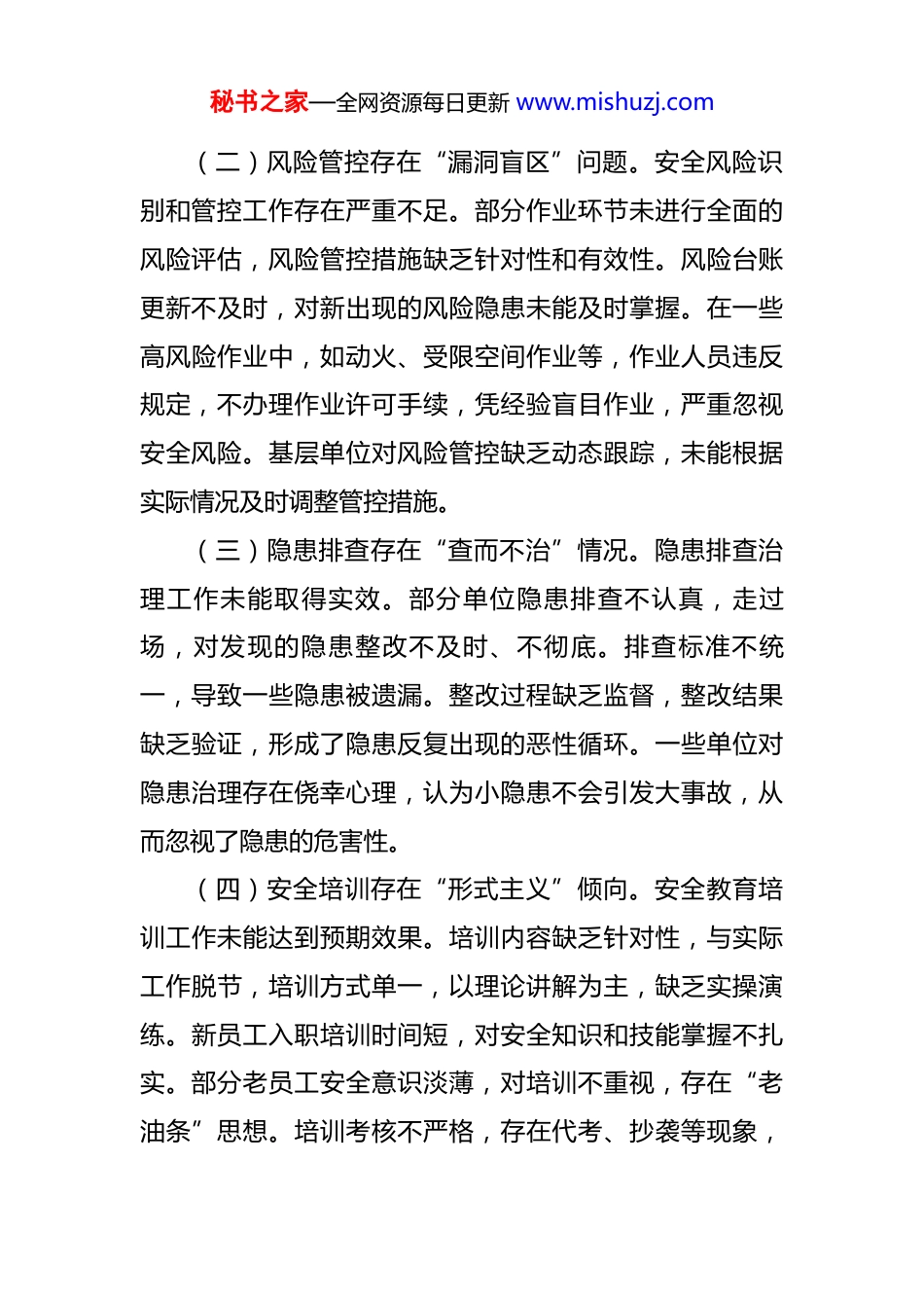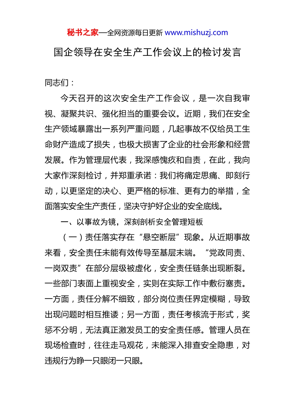 秘书之家—全网资源每日更新 www.mishuzj.com国企领导在安全生产工作会议上的检讨发言 同志们:今天召开的这次安全生产工作会议,是一次自我审视、凝聚共识、强化担当的重要会议。近期,我们在安全生产领域暴露出一系列严重问题,几起事故不仅给员工生命财产造成了损失,也极大损害了企业的社会形象和经营发展。作为管理层代表,我深感愧疚和自责,在此,我向大家作深刻检讨,并郑重承诺:我们将痛定思痛、即刻行动,以更坚定的决心、更严格的标准、更有力的举措,全面落实安全生产责任,坚决守护好企业的安全底线。一、以事故为镜,深刻剖析安全管理短板(一)责任落实存在“悬空断层”现象。从近期事故来看,安全责任未能有效传导至基层末端。“党政同责、一岗双责”在部分层级被虚化,安全责任链条出现断裂。一些部门表面上重视安全,实则在实际工作中敷衍塞责。一方面,责任分解不细致,部分岗位责任界定模糊,导致出现问题时相互推诿;另一方面,责任考核流于形式,奖惩不分明,无法真正激发员工的安全责任感。管理人员在现场检查时,往往走马观花,未能深入排查安全隐患,对违规行为睁一只眼闭一只眼。秘书之家—全网资源每日更新 www.mishuzj.com(二)风险管控存在“漏洞盲区”问题。安全风险识别和管控工作存在严重不足。部分作业环节未进行全面的风险评估,风险管控措施缺乏针对性和有效性。风险台账更新不及时,对新出现的风险隐患未能及时掌握。在一些高风险作业中,如动火、受限空间作业等,作业人员违反规定,不办理作业许可手续,凭经验盲目作业,严重忽视安全风险。基层单位对风险管控缺乏动态跟踪,未能根据实际情况及时调整管控措施。(三)隐患排查存在“查而不治”情况。隐患排查治理工作未能取得实效。部分单位隐患排查不认真,走过场,对发现的隐患整改不及时、不彻底。排查标准不统一,导致一些隐患被遗漏。整改过程缺乏监督,整改结果缺乏验证,形成了隐患反复出现的恶性循环。一些单位对隐患治理存在侥幸心理,认为小隐患不会引发大事故,从而忽视了隐患的危害性。(四)安全培训存在“形式主义”倾向。安全教育培训工作未能达到预期效果。培训内容缺乏针对性,与实际工作脱节,培训方式单一,以理论讲解为主,缺乏实操演练。新员工入职培训时间短,对安全知识和技能掌握不扎实。部分老员工安全意识淡薄,对培训不重视,存在“老油条”思想。培训考核不严格,存在代考、抄袭等现象,秘书之家—全网资源每日更新 www.mishuzj.com未能真正检验员工的安全知识水平。二、以整改为纲,全面压实安全生产责任(一)构建“无缝衔接、层层落实”的责任体系。我们将从制度层面入手,重新梳理安全生产责任清单,明确每个岗位的安全职责和工作标准。全面推行“一岗双责”制度,将安全责任纳入绩效考核的重要内容,加大安全考核权重。建立健全责任追究机制,对因失职、渎职导致事故发生的人员,依法依规严肃问责。加强管理人员的安全监管职责,要求他们深入基层,加强现场检查和指导,确保安全责任落实到每一个环节。(二)强化“源头防控、动态监管”的风险管控体系。全面推进“双重预防机制”建设,加强风险辨识和评估工作。各单位要定期开展风险排查,建立完善的风险台账和预警机制,对风险进行动态管理。对高风险作业实行严格的审批制度,加强作业过程中的安全监管。引入先进的风险监测技术,如物联网、大数据等,实现对风险的实时监控和预警。加强对重大风险的管控,实行领导包保责任制,确保重大风险可控可防。(三)完善“拉网排查、闭环治理”的隐患排查机制。按照“全覆盖、零容忍、严执法、重实效”的要求,全面开展安全隐患排查治理工作。建立定期排查和不定期秘书之家—全网资源每日更新 www.mishuzj.com抽查相结合的隐患排查制度,确保隐患排查无死角。对排查出的隐患,要按照“五落实”的要求进行整改,即落实整改责任人、整改措施、整改期限、整改资金和整改预案。建立隐患整改销号制度,对整改完成的隐患进行严格验收,确保整改到位。加强对隐患排查治理工作的监督检查,对工作不力的单位和个人进行严肃问责。(四)夯实“精准培训、全员覆盖”的...
