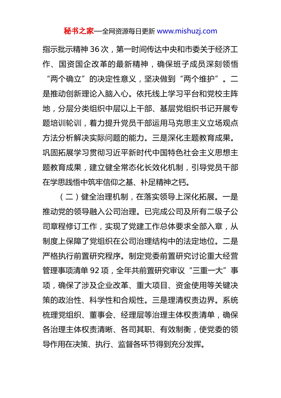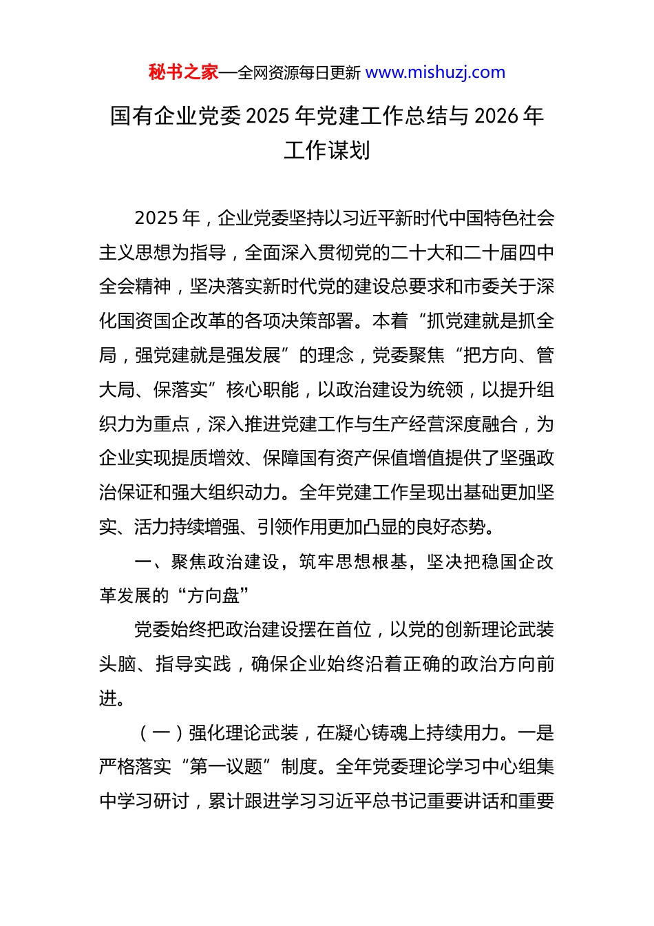 秘书之家—全网资源每日更新 www.mishuzj.com国有企业党委 2025 年党建工作总结与 2026 年工作谋划 2025 年,企业党委坚持以习近平新时代中国特色社会主义思想为指导,全面深入贯彻党的二十大和二十届四中全会精神,坚决落实新时代党的建设总要求和市委关于深化国资国企改革的各项决策部署。本着“抓党建就是抓全局,强党建就是强发展”的理念,党委聚焦“把方向、管大局、保落实”核心职能,以政治建设为统领,以提升组织力为重点,深入推进党建工作与生产经营深度融合,为企业实现提质增效、保障国有资产保值增值提供了坚强政治保证和强大组织动力。全年党建工作呈现出基础更加坚实、活力持续增强、引领作用更加凸显的良好态势。一、聚焦政治建设,筑牢思想根基,坚决把稳国企改革发展的“方向盘”党委始终把政治建设摆在首位,以党的创新理论武装头脑、指导实践,确保企业始终沿着正确的政治方向前进。(一)强化理论武装,在凝心铸魂上持续用力。一是严格落实“第一议题”制度。全年党委理论学习中心组集中学习研讨,累计跟进学习习近平总书记重要讲话和重要秘书之家—全网资源每日更新 www.mishuzj.com指示批示精神 36 次,第一时间传达中央和市委关于经济工作、国资国企改革的最新精神,确保班子成员深刻领悟“两个确立”的决定性意义,坚决做到“两个维护”。二是推动创新理论入脑入心。依托线上学习平台和党校主阵地,分层分类组织中层以上干部、基层党组织书记开展专题培训轮训,着力提升党员干部运用马克思主义立场观点方法分析解决实际问题的能力。三是深化主题教育成果。巩固拓展学习贯彻习近平新时代中国特色社会主义思想主题教育成果,建立健全常态化长效化机制,引导党员干部在学思践悟中筑牢信仰之基、补足精神之钙。(二)健全治理机制,在落实领导上深化拓展。一是推动党的领导融入公司治理。已完成公司及所有二级子公司章程修订工作,实现了党建工作总体要求全部入章,从制度上保障了党组织在公司治理结构中的法定地位。二是严格执行前置研究程序。制定党委前置研究讨论重大经营管理事项清单 92 项,全年共前置研究审议“三重一大”事项,确保了涉及企业改革、重大项目、资金使用等关键决策的政治性、科学性和合规性。三是理清权责边界。系统梳理党组织、董事会、经理层等治理主体权责清单,确保各治理主体权责清晰、各司其职、有效制衡,使党委的领导作用在决策、执行、监督各环节得到充分发挥。秘书之家—全网资源每日更新 www.mishuzj.com(三)严明政治纪律,在对标对表上抓实抓细。一是加强政治纪律教育。将严明政治纪律和政治规矩作为党员干部教育培训的重要内容,督促党员干部在贯彻执行党中央决策部署和市委工作要求上不打折扣、不搞变通。二是强化对重大部署的监督检查。聚焦国资国企改革重点任务、安全生产、环保督查等重点领域,全年开展政治纪律专项检查 4 次,对发现的问题严肃通报并督促整改,确保政令畅通、令行禁止。三是严格落实意识形态工作责任制。加强对企业各类宣传阵地的管理,定期分析研判思想动态和舆情风险,及时发声引导,弘扬企业发展主旋律。二、坚持融合发展,驱动提质增效,不断释放党建赋能高质量发展的“新动能”党委紧扣企业中心工作,把党建优势转化为创新优势、竞争优势和发展优势,实现了党建与生产经营的同频共振。(一)实施“红色引擎”工程,助力重大项目攻坚。一是构建党员攻关体系。在重点基础设施建设、技术研发、市场拓展等关键领域成立了“党员突击队”和“党员先锋岗”。例如,在某省级重点工程项目中,项目临时党支部设立“质量监督岗”和“安全保障岗”,由党员骨干担任,有效解决了复杂施工难题,项目提前完成节点目秘书之家—全网资源每日更新 www.mishuzj.com标。二是深化“双培养”机制。将优秀党员培养成业务骨干,将优秀业务骨干培养成党员,目前公司中层以上管理人员中,形成“重要岗位有党员、关键环节看党员”的良好局面。三是推动党建联建共建。与上下游产业链、重点协作单位开展党建联建活动,共同破解生产经营中的瓶颈问题,推动业务合作持续深化。(二)聚焦人才队伍建设,提供...