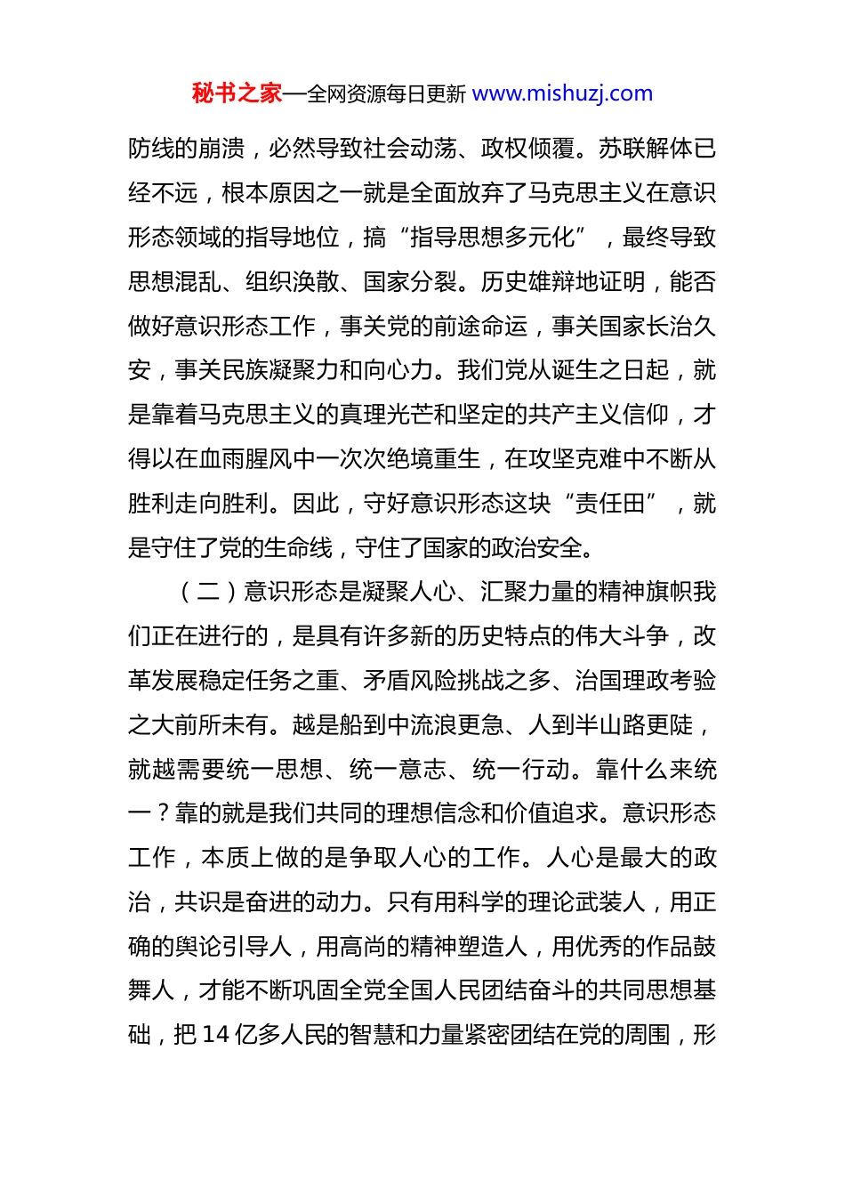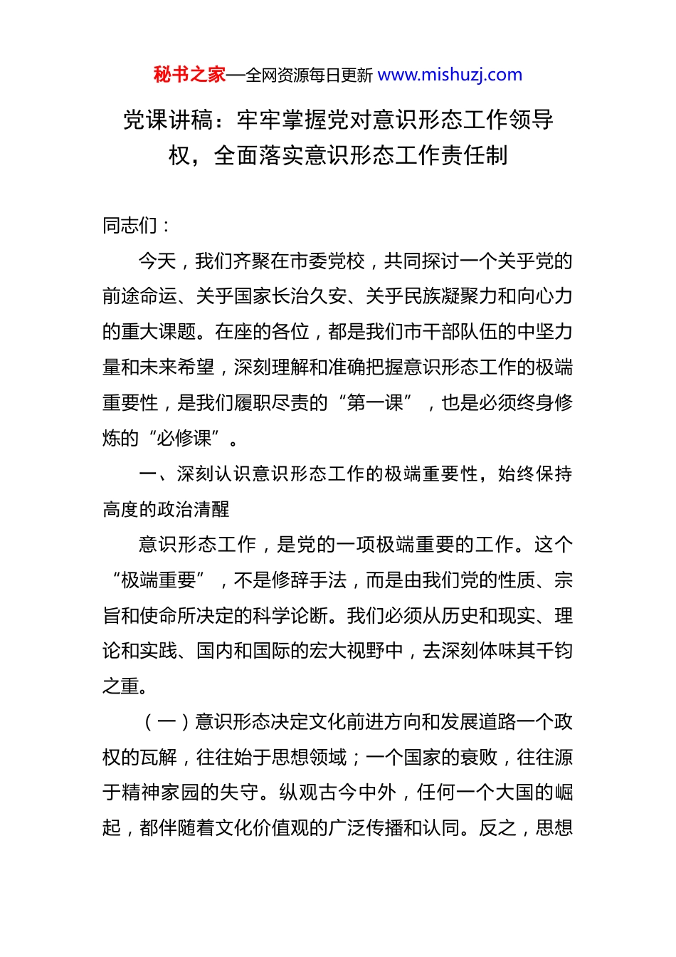 秘书之家—全网资源每日更新 www.mishuzj.com党课讲稿:牢牢掌握党对意识形态工作领导权,全面落实意识形态工作责任制 同志们:今天,我们齐聚在市委党校,共同探讨一个关乎党的前途命运、关乎国家长治久安、关乎民族凝聚力和向心力的重大课题。在座的各位,都是我们市干部队伍的中坚力量和未来希望,深刻理解和准确把握意识形态工作的极端重要性,是我们履职尽责的“第一课”,也是必须终身修炼的“必修课”。一、深刻认识意识形态工作的极端重要性,始终保持高度的政治清醒意识形态工作,是党的一项极端重要的工作。这个“极端重要”,不是修辞手法,而是由我们党的性质、宗旨和使命所决定的科学论断。我们必须从历史和现实、理论和实践、国内和国际的宏大视野中,去深刻体味其千钧之重。(一)意识形态决定文化前进方向和发展道路一个政权的瓦解,往往始于思想领域;一个国家的衰败,往往源于精神家园的失守。纵观古今中外,任何一个大国的崛起,都伴随着文化价值观的广泛传播和认同。反之,思想秘书之家—全网资源每日更新 www.mishuzj.com防线的崩溃,必然导致社会动荡、政权倾覆。苏联解体已经不远,根本原因之一就是全面放弃了马克思主义在意识形态领域的指导地位,搞“指导思想多元化”,最终导致思想混乱、组织涣散、国家分裂。历史雄辩地证明,能否做好意识形态工作,事关党的前途命运,事关国家长治久安,事关民族凝聚力和向心力。我们党从诞生之日起,就是靠着马克思主义的真理光芒和坚定的共产主义信仰,才得以在血雨腥风中一次次绝境重生,在攻坚克难中不断从胜利走向胜利。因此,守好意识形态这块“责任田”,就是守住了党的生命线,守住了国家的政治安全。(二)意识形态是凝聚人心、汇聚力量的精神旗帜我们正在进行的,是具有许多新的历史特点的伟大斗争,改革发展稳定任务之重、矛盾风险挑战之多、治国理政考验之大前所未有。越是船到中流浪更急、人到半山路更陡,就越需要统一思想、统一意志、统一行动。靠什么来统一?靠的就是我们共同的理想信念和价值追求。意识形态工作,本质上做的是争取人心的工作。人心是最大的政治,共识是奋进的动力。只有用科学的理论武装人,用正确的舆论引导人,用高尚的精神塑造人,用优秀的作品鼓舞人,才能不断巩固全党全国人民团结奋斗的共同思想基础,把 14 亿多人民的智慧和力量紧密团结在党的周围,形秘书之家—全网资源每日更新 www.mishuzj.com成无坚不摧的磅礴伟力,从容应对前进道路上的一切风险挑战。(三)意识形态领域是各类风险挑战交织叠加的前沿阵地当前,世界百年未有之大变局加速演进,国际环境日趋复杂,我国发展的外部压力持续增大。一些西方国家从未放弃对我国实施“西化”“分化”的战略图谋,把意识形态作为对我国进行渗透破坏的“突破口”。他们利用互联网等新兴媒介,大肆兜售所谓““普世价值””,恶意歪曲我们党的历史,抹黑攻击我们的领袖人物,唱衰中国经济,妄图搞乱我们的思想、颠覆我们的政权。可以说,意识形态领域的斗争,没有硝烟,却处处是战场;看不见刀光剑影,却时时面临着尖锐的较量。在这场输不起也决不能输的斗争面前,我们没有任何退路和妥协的余地,必须时刻保持箭在弦上的备战姿态,敢于斗争、善于斗争,坚决捍卫我们的政治安全和制度安全。二、深入学习领会习近平总书记关于意识形态工作的重要论述,牢牢把握正确政治方向党的十八大以来,习近平总书记站在时代发展和战略全局的高度,就意识形态工作发表了一系列重要讲话、作出了一系列重要指示,形成了系统完整、逻辑严密、内涵丰富的科学理论体系,深刻回答了事关意识形态工作长远秘书之家—全网资源每日更新 www.mishuzj.com发展的一系列方向性、根本性、战略性重大问题。党的二十大之后,总书记又多次对此作出新的深刻阐述,为我们做好新时代意识形态工作提供了强大思想武器和根本遵循。(一)必须毫不动摇地坚持党管意识形态的根本原则习近平总书记反复强调,“必须坚持党管宣传、党管意识形态、党管媒体”。这是我们党在长期实践中形成的优良传统和政治优势。党性原则是意识形态工作的灵魂。在坚持什么、反对什么这个...