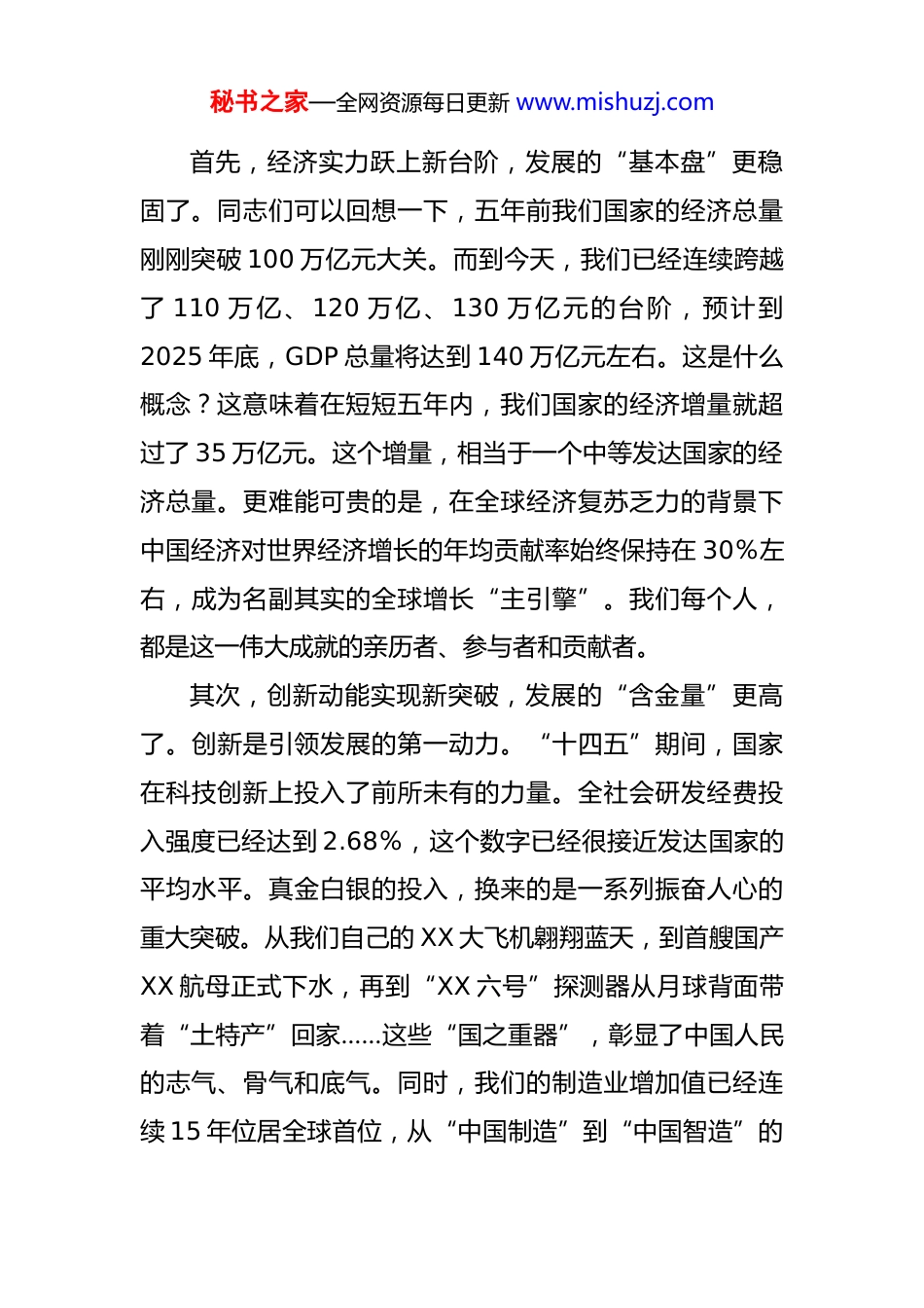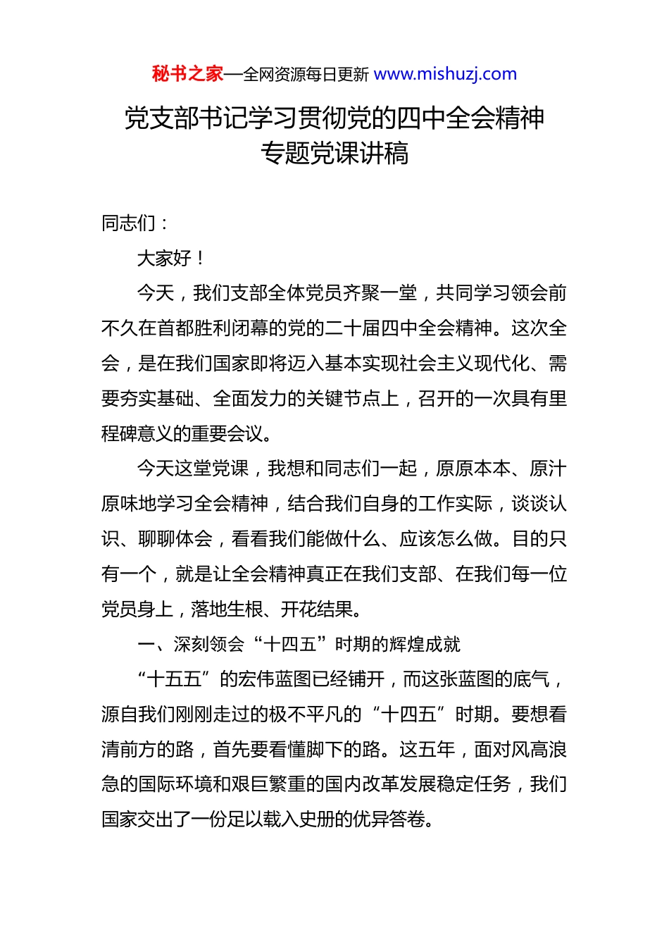 秘书之家—全网资源每日更新 www.mishuzj.com党支部书记学习贯彻党的四中全会精神专题党课讲稿同志们:大家好!今天,我们支部全体党员齐聚一堂,共同学习领会前不久在首都胜利闭幕的党的二十届四中全会精神。这次全会,是在我们国家即将迈入基本实现社会主义现代化、需要夯实基础、全面发力的关键节点上,召开的一次具有里程碑意义的重要会议。今天这堂党课,我想和同志们一起,原原本本、原汁原味地学习全会精神,结合我们自身的工作实际,谈谈认识、聊聊体会,看看我们能做什么、应该怎么做。目的只有一个,就是让全会精神真正在我们支部、在我们每一位党员身上,落地生根、开花结果。一、深刻领会“十四五”时期的辉煌成就“十五五”的宏伟蓝图已经铺开,而这张蓝图的底气,源自我们刚刚走过的极不平凡的“十四五”时期。要想看清前方的路,首先要看懂脚下的路。这五年,面对风高浪急的国际环境和艰巨繁重的国内改革发展稳定任务,我们国家交出了一份足以载入史册的优异答卷。秘书之家—全网资源每日更新 www.mishuzj.com首先,经济实力跃上新台阶,发展的“基本盘”更稳固了。同志们可以回想一下,五年前我们国家的经济总量刚刚突破 100 万亿元大关。而到今天,我们已经连续跨越了 110 万亿、120 万亿、130 万亿元的台阶,预计到2025 年底,GDP 总量将达到 140 万亿元左右。这是什么概念?这意味着在短短五年内,我们国家的经济增量就超过了 35 万亿元。这个增量,相当于一个中等发达国家的经济总量。更难能可贵的是,在全球经济复苏乏力的背景下中国经济对世界经济增长的年均贡献率始终保持在 30%左右,成为名副其实的全球增长“主引擎”。我们每个人,都是这一伟大成就的亲历者、参与者和贡献者。其次,创新动能实现新突破,发展的“含金量”更高了。创新是引领发展的第一动力。“十四五”期间,国家在科技创新上投入了前所未有的力量。全社会研发经费投入强度已经达到 2.68%,这个数字已经很接近发达国家的平均水平。真金白银的投入,换来的是一系列振奋人心的重大突破。从我们自己的 XX 大飞机翱翔蓝天,到首艘国产XX 航母正式下水,再到“XX 六号”探测器从月球背面带着“土特产”回家……这些“国之重器”,彰显了中国人民的志气、骨气和底气。同时,我们的制造业增加值已经连续 15 年位居全球首位,从“中国制造”到“中国智造”的秘书之家—全网资源每日更新 www.mishuzj.com转型步伐铿锵有力。再者,绿色转型绘就新画卷,发展的“底色”更亮丽了。“绿水青山就是金山银山”的理念,已经深深融入国家发展的血脉。这五年,是生态环境改善最显著的五年。单位 GDP 能耗下降了 11.6%,这意味着我们用更少的能源消耗支撑了更高质量的增长。全国的森林覆盖率已经超过 25%,我们的天更蓝了、山更绿了、水更清了。可再生能源装机总量占到了全球的三分之一,风电、光伏等清洁能源正在点亮千家万户。这种发展方式的深刻变革,不仅为我们自己赢得了永续发展的空间,也为全球应对气候变化作出了重要贡献。最后,民生福祉达到新高度,发展的“温度”更暖心了。发展的最终目的,是让人民过上好日子。“十四五”期间,这一点体现得淋漓尽致。全国城镇新增就业每年都超过 1200 万人,大家的“饭碗”端得更稳了。基本养老保险和医疗保险的参保率双双超过 95%,覆盖全民的社会保障网越织越密、越织越牢。人均预期寿命从“十三五”末的 77.93 岁提高到了 79 岁,健康中国的根基更加坚实。教育、医疗、住房、养老等方方面面,国家持续加大投入,人民群众的获得感、幸福感、安全感实实在在。这些成就,不是从天上掉下来的,也不是轻轻松松敲秘书之家—全网资源每日更新 www.mishuzj.com锣打鼓就能实现的,是全党全国各族人民在以习近平同志为核心的党中央坚强领导下,一道拼出来、干出来、奋斗出来的!这些辉煌成就,为我们开启“十五五”新征程奠定了坚实的物质基础,积累了宝贵的实践经验,更注入了强大的精神力量。二、准确把握中央对发展形势的科学判断二十届四中全会《建议》的字里行间,贯穿着一种清醒的战略洞察力,那就是对当前国内外形势...
