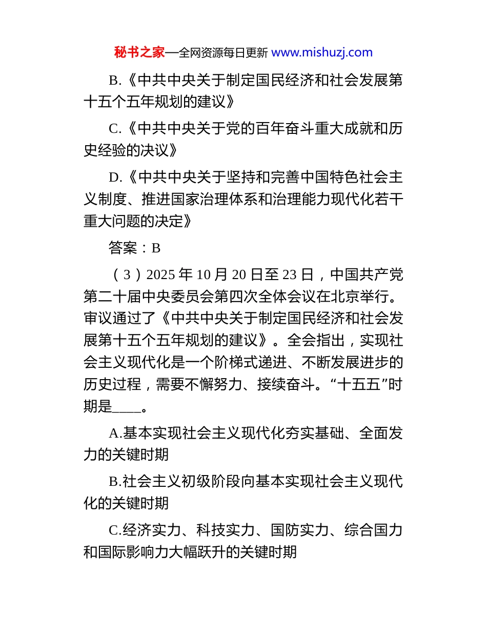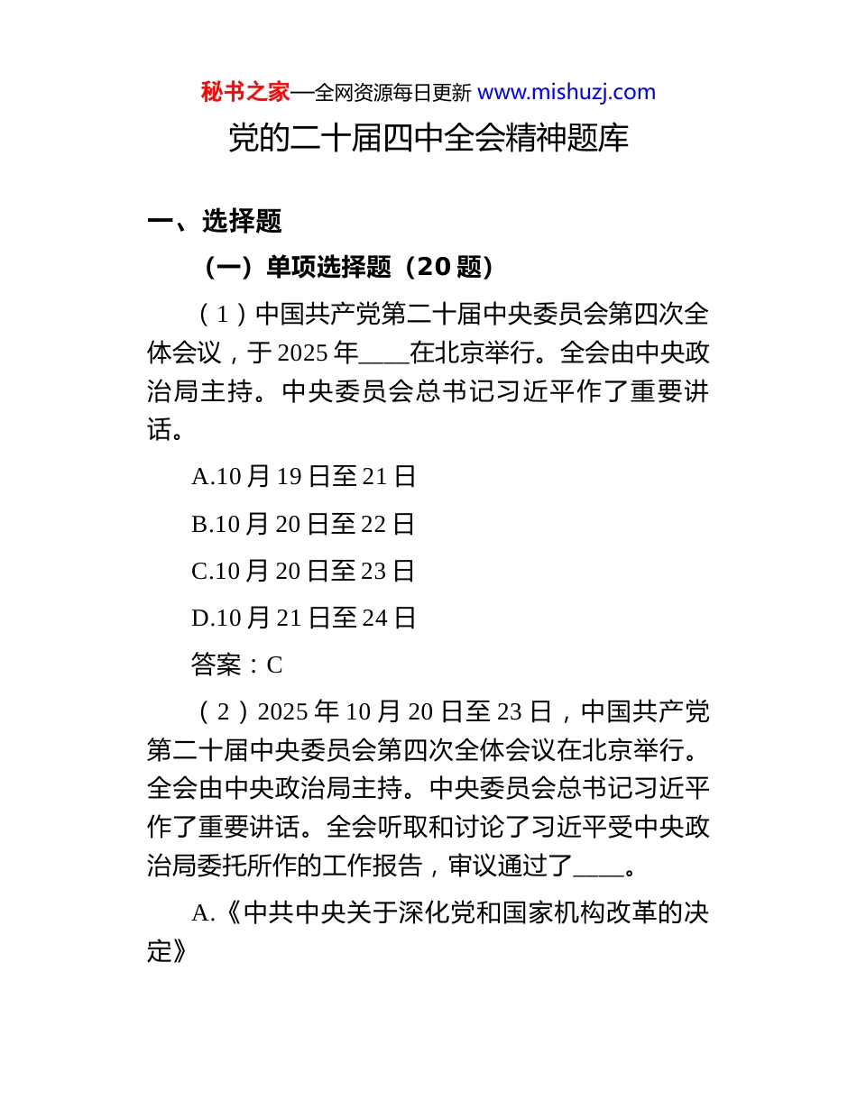 秘书之家—全网资源每日更新 www.mishuzj.com党的二十届四中全会精神题库一、选择题(一)单项选择题(20 题)(1)中国共产党第二十届中央委员会第四次全体会议,于 2025 年____在北京举行。全会由中央政治局主持。中央委员会总书记习近平作了重要讲话。A.10 月 19 日至 21 日B.10 月 20 日至 22 日C.10 月 20 日至 23 日D.10 月 21 日至 24 日答案:C(2)2025 年 10 月 20 日至 23 日,中国共产党第二十届中央委员会第四次全体会议在北京举行。全会由中央政治局主持。中央委员会总书记习近平作了重要讲话。全会听取和讨论了习近平受中央政治局委托所作的工作报告,审议通过了____。A.《中共中央关于深化党和国家机构改革的决定》秘书之家—全网资源每日更新 www.mishuzj.comB.《中共中央关于制定国民经济和社会发展第十五个五年规划的建议》C.《中共中央关于党的百年奋斗重大成就和历史经验的决议》D.《中共中央关于坚持和完善中国特色社会主义制度、推进国家治理体系和治理能力现代化若干重大问题的决定》答案:B(3)2025 年 10 月 20 日至 23 日,中国共产党第二十届中央委员会第四次全体会议在北京举行。审议通过了《中共中央关于制定国民经济和社会发展第十五个五年规划的建议》。全会指出,实现社会主义现代化是一个阶梯式递进、不断发展进步的“”历史过程,需要不懈努力、接续奋斗。 十五五 时期是____。A.基本实现社会主义现代化夯实基础、全面发力的关键时期B.社会主义初级阶段向基本实现社会主义现代化的关键时期C.经济实力、科技实力、国防实力、综合国力和国际影响力大幅跃升的关键时期秘书之家—全网资源每日更新 www.mishuzj.comD.人均国内生产总值达到中等发达国家水平,基本实现社会主义现代化的关键时期答案:A(4)2025 年 10 月 20 日至 23 日,党的二十届四中全会在京举行。全会提出,建设强大国内市场,加快构建新发展格局必须坚持的战略基点是____。A.以新需求引领新供给,以新供给创造新需求B.破除阻碍全国统一大市场建设卡点堵点C.扩大有效投资D.扩大内需答案:D(5)2025 年 10 月 20 日至 23 日,党的二十届“”四中全会在京举行。全会指出 十五五 时期经济社“”会发展必须遵循 六个坚持 的重要原则,其中经济社会发展的根本保证是____。A.坚持党的全面领导B.坚持人民至上C.坚持高质量发展D.坚持全面深化改革秘书之家—全网资源每日更新 www.mishuzj.com答案:A(6)2025 年 10 月 20 日至 23 日,党的二十届“”四中全会在京举行。全会指出 十五五 时期经济社“”会发展必须遵循 六个坚持 的重要原则,其中经济社会发展的根本动力是____。A.坚持高质量发展B.坚持全面深化改革C.坚持有效市场和有为政府相结合D.坚持统筹发展和安全答案:B(7)2025 年 10 月 20 日至 23 日,党的二十届四中全会在京举行。全会提出,建设现代化产业体系,巩固壮大实体经济根基。坚持把发展经济的着力点放在____。A.优化提升传统产业上B.培育壮大新兴产业和未来产业上C.发展实体经济上D.促进服务业优质高效发展,构建现代化基础设施体系上答案:C秘书之家—全网资源每日更新 www.mishuzj.com(8)二十届四中全会公报指出,全党全国各族人民团结起来为实现____而奋斗。A."十四五"规划B."十五五"规划C.社会主义现代化D.中华民族伟大复兴答案:B(9)二十届四中全会公报指出,坚持以____引领社会革命。A.党的自我革命B.全面从严治党C.改革开放D.科技创新答案:A(10)全会提出,加快形成新质生产力,要抓住新一轮____和____历史机遇,提升国家创新体系整体效能。A.科技革命;产业变革B.能源革命;贸易变革秘书之家—全网资源每日更新 www.mishuzj.comC.金融革命;消费变革D.土地革命;城乡变革答案:A(11)2025 年 10 月 20 日至 23 日,党的二十届“”四中全会在北京召开,研究制定 十五五 规划建“”议。科学谋划 十五五 要坚定不移办好自己的事,坚定不移扩大高水平对外开放,下列有关说法正确的有几项____。① 全面推动高质量发展② 多措并举稳就业、稳企业、稳市...