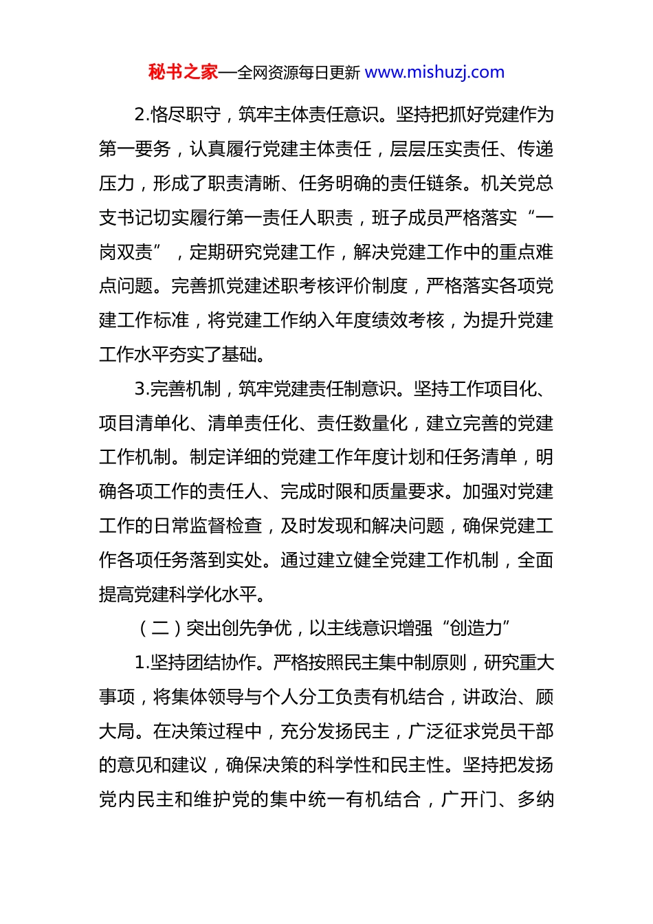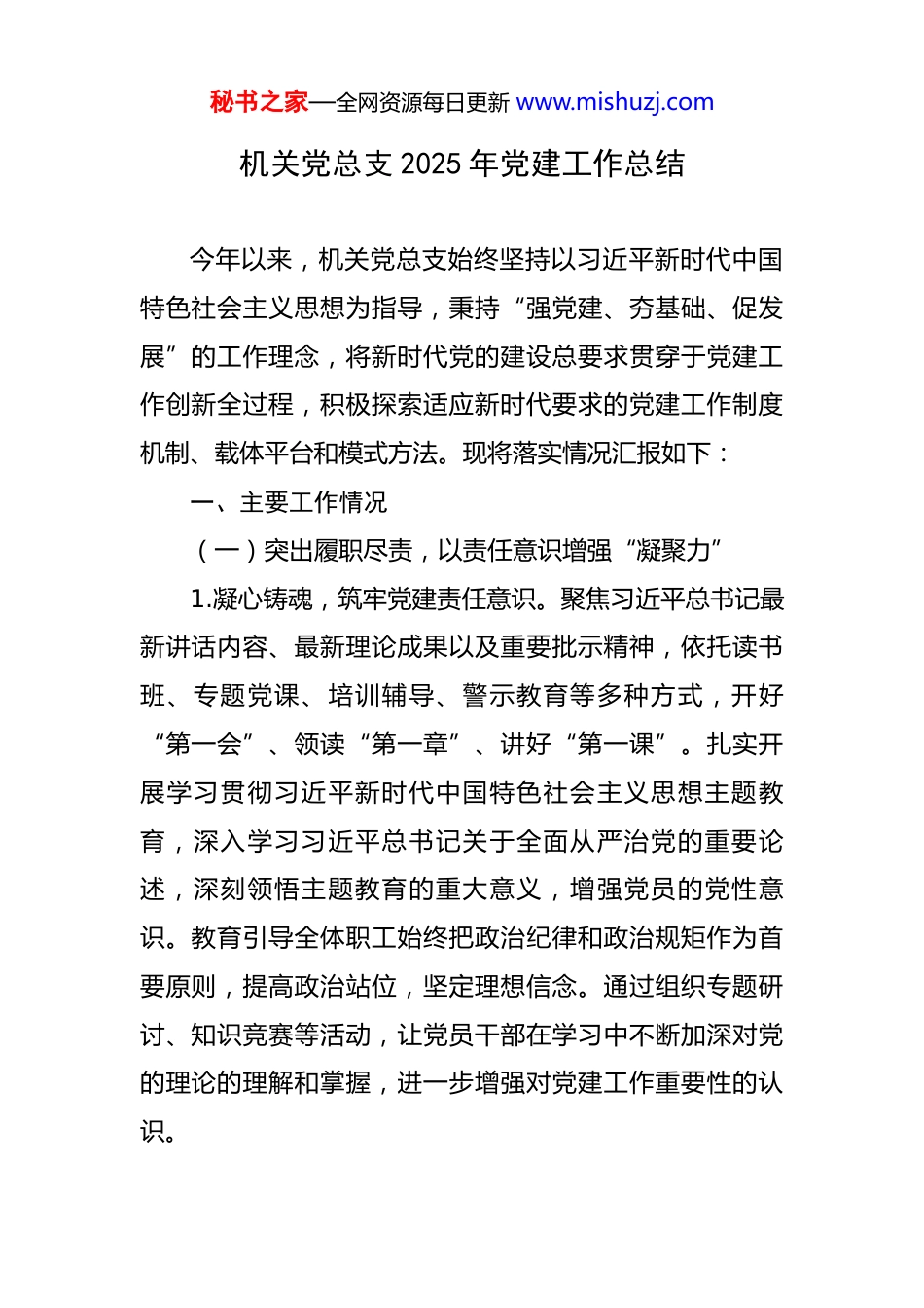 秘书之家—全网资源每日更新 www.mishuzj.com机关党总支 2025 年党建工作总结 今年以来,机关党总支始终坚持以习近平新时代中国特色社会主义思想为指导,秉持“强党建、夯基础、促发展”的工作理念,将新时代党的建设总要求贯穿于党建工作创新全过程,积极探索适应新时代要求的党建工作制度机制、载体平台和模式方法。现将落实情况汇报如下:一、主要工作情况(一)突出履职尽责,以责任意识增强“凝聚力”1.凝心铸魂,筑牢党建责任意识。聚焦习近平总书记最新讲话内容、最新理论成果以及重要批示精神,依托读书班、专题党课、培训辅导、警示教育等多种方式,开好“第一会”、领读“第一章”、讲好“第一课”。扎实开展学习贯彻习近平新时代中国特色社会主义思想主题教育,深入学习习近平总书记关于全面从严治党的重要论述,深刻领悟主题教育的重大意义,增强党员的党性意识。教育引导全体职工始终把政治纪律和政治规矩作为首要原则,提高政治站位,坚定理想信念。通过组织专题研讨、知识竞赛等活动,让党员干部在学习中不断加深对党的理论的理解和掌握,进一步增强对党建工作重要性的认识。秘书之家—全网资源每日更新 www.mishuzj.com2.恪尽职守,筑牢主体责任意识。坚持把抓好党建作为第一要务,认真履行党建主体责任,层层压实责任、传递压力,形成了职责清晰、任务明确的责任链条。机关党总支书记切实履行第一责任人职责,班子成员严格落实“一岗双责”,定期研究党建工作,解决党建工作中的重点难点问题。完善抓党建述职考核评价制度,严格落实各项党建工作标准,将党建工作纳入年度绩效考核,为提升党建工作水平夯实了基础。3.完善机制,筑牢党建责任制意识。坚持工作项目化、项目清单化、清单责任化、责任数量化,建立完善的党建工作机制。制定详细的党建工作年度计划和任务清单,明确各项工作的责任人、完成时限和质量要求。加强对党建工作的日常监督检查,及时发现和解决问题,确保党建工作各项任务落到实处。通过建立健全党建工作机制,全面提高党建科学化水平。(二)突出创先争优,以主线意识增强“创造力”1.坚持团结协作。严格按照民主集中制原则,研究重大事项,将集体领导与个人分工负责有机结合,讲政治、顾大局。在决策过程中,充分发扬民主,广泛征求党员干部的意见和建议,确保决策的科学性和民主性。坚持把发扬党内民主和维护党的集中统一有机结合,广开门、多纳秘书之家—全网资源每日更新 www.mishuzj.com谏,营造了团结和谐的工作氛围。通过加强团结协作,提高了机关党总支的凝聚力和战斗力。2.坚持问题导向。将影响党组织战斗力、凝聚力、创造力和解决机关工作中的突出问题相结合,把提高解决党建问题能力和提高中心工作能力相统一,在工作思路、制度机制等方面强化探索和突破。在重点项目推进、业务工作开展等重要工作中,着力锻造敢于担当、勇于奋进的先锋力量。健全多元激励评估机制,深入开展“攻坚小组”“突击小队”活动,引导职工立足本职做贡献。针对机关工作中存在的形式主义、官僚主义等问题,开展专项整治活动,切实改进工作作风,提高工作效率。3.坚持创新发展。坚持以创新的观念、创新的意识和创新的精神,把握时代需求,紧跟时代步伐,积极探索围绕中心抓党建的新方法、新途径。扎实推进科技攻坚、揭榜挂帅等活动,鼓励党员干部在工作中勇于创新、敢于突破。利用互联网、大数据等技术手段,创新党建工作载体和平台,开展线上线下相结合的党建活动,提高党建工作的吸引力和实效性。教育引导广大员工以饱满的精神状态、昂扬的工作斗志投入到创新创效、提质提效等活动中,全方位提升机关党建创新效能。(三)突出教育管理,以品牌意识增强“向心力”秘书之家—全网资源每日更新 www.mishuzj.com1.加强素质提升,营造成长成才的工作环境。坚持以建设高素质专业化干部队伍为目标,深入开展“强化素质提升”活动,广泛储备实用型人才。制定详细的干部培训计划,定期组织党员干部参加各类培训和学习交流活动,提高干部的政治素质、业务能力和综合素质。今年,通过严格考察,任用年轻职工 12 名,为机关干部队伍注入了新鲜血液。同时,建...