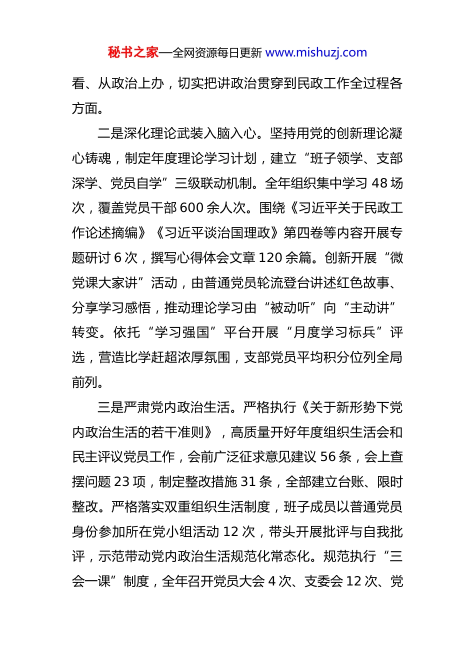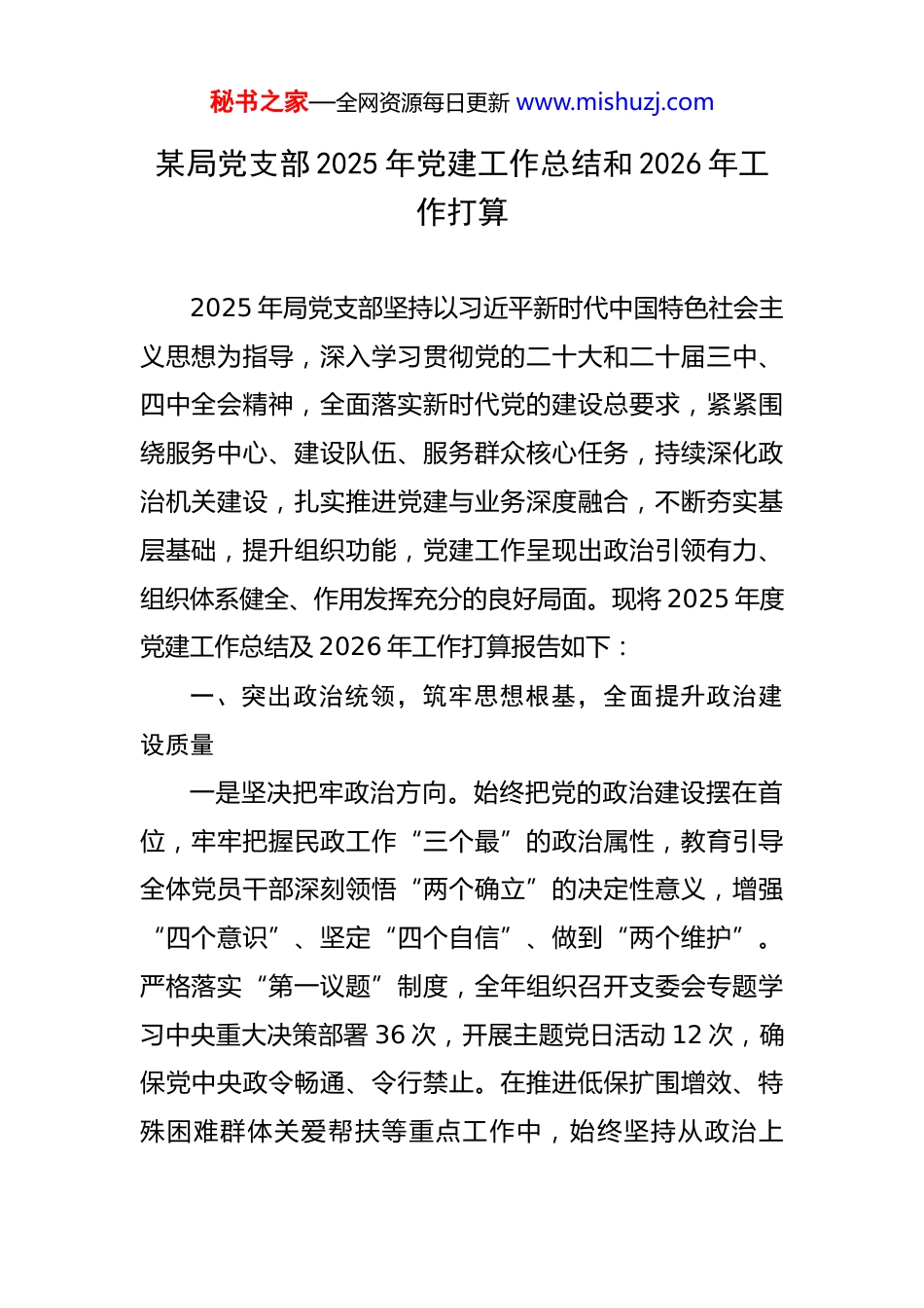 秘书之家—全网资源每日更新 www.mishuzj.com某局党支部 2025 年党建工作总结和 2026 年工作打算 2025 年局党支部坚持以习近平新时代中国特色社会主义思想为指导,深入学习贯彻党的二十大和二十届三中、四中全会精神,全面落实新时代党的建设总要求,紧紧围绕服务中心、建设队伍、服务群众核心任务,持续深化政治机关建设,扎实推进党建与业务深度融合,不断夯实基层基础,提升组织功能,党建工作呈现出政治引领有力、组织体系健全、作用发挥充分的良好局面。现将 2025 年度党建工作总结及 2026 年工作打算报告如下:一、突出政治统领,筑牢思想根基,全面提升政治建设质量一是坚决把牢政治方向。始终把党的政治建设摆在首位,牢牢把握民政工作“三个最”的政治属性,教育引导全体党员干部深刻领悟“两个确立”的决定性意义,增强“四个意识”、坚定“四个自信”、做到“两个维护”。严格落实“第一议题”制度,全年组织召开支委会专题学习中央重大决策部署 36 次,开展主题党日活动 12 次,确保党中央政令畅通、令行禁止。在推进低保扩围增效、特殊困难群体关爱帮扶等重点工作中,始终坚持从政治上秘书之家—全网资源每日更新 www.mishuzj.com看、从政治上办,切实把讲政治贯穿到民政工作全过程各方面。二是深化理论武装入脑入心。坚持用党的创新理论凝心铸魂,制定年度理论学习计划,建立“班子领学、支部深学、党员自学”三级联动机制。全年组织集中学习 48 场次,覆盖党员干部 600 余人次。围绕《习近平关于民政工作论述摘编》《习近平谈治国理政》第四卷等内容开展专题研讨 6 次,撰写心得体会文章 120 余篇。创新开展“微党课大家讲”活动,由普通党员轮流登台讲述红色故事、分享学习感悟,推动理论学习由“被动听”向“主动讲”转变。依托“学习强国”平台开展“月度学习标兵”评选,营造比学赶超浓厚氛围,支部党员平均积分位列全局前列。三是严肃党内政治生活。严格执行《关于新形势下党内政治生活的若干准则》,高质量开好年度组织生活会和民主评议党员工作,会前广泛征求意见建议 56 条,会上查摆问题 23 项,制定整改措施 31 条,全部建立台账、限时整改。严格落实双重组织生活制度,班子成员以普通党员身份参加所在党小组活动 12 次,带头开展批评与自我批评,示范带动党内政治生活规范化常态化。规范执行“三会一课”制度,全年召开党员大会 4 次、支委会 12 次、党秘书之家—全网资源每日更新 www.mishuzj.com小组会 24 次,讲授专题党课 4 次,党内政治生活的政治性、时代性、原则性、战斗性不断增强。二、强化组织建设,夯实基层基础,打造坚强战斗堡垒(一)持续推进党支部标准化规范化建设一是优化组织设置。根据机构调整和人员变动情况,及时完成支部换届选举工作,选优配强支部班子,新一届支委平均年龄下降 5.2 岁,本科及以上学历占比达 100%,整体结构更加合理、活力显著增强。按照“便于管理、利于活动”原则,科学划分 3 个党小组,明确小组长职责,压实末端责任,形成上下贯通、执行有力的组织体系。二是严格党员教育管理。严把发展党员政治关、程序关、质量关,全年接收预备党员 2 名,转正 3 名,培养入党积极分子 4 名。建立健全党员档案动态管理制度,实现一人一档、规范归集。加强流动党员管理,建立定期联系机制,确保组织关系不断线、思想教育不脱节。落实谈心谈话制度,支部书记与委员、委员与党员之间全年开展谈话 180 余人次,及时掌握思想动态,帮助解决实际困难。三是抓实党建阵地建设。投入专项资金改造升级党员活动室,配备多媒体设备、图书资料柜,悬挂党旗、入党誓词、党员权利义务等标识标牌,打造集学习教育、会议交流、文化展示于一体秘书之家—全网资源每日更新 www.mishuzj.com的综合性党建空间。设立“党员先锋岗”“党员责任区”,公开亮明身份、接受群众监督,在窗口服务、应急值守等岗位发挥示范引领作用。(二)推动党建与业务深度融合。一是实施“党建+民生服务”工程。聚焦群众急难愁盼问题,深入开展“我为群众办实事”实践活动。在社会救助领域,推行“党建+主...