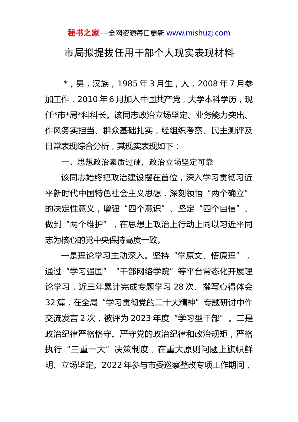 秘书之家—全网资源每日更新 www.mishuzj.com市局拟提拔任用干部个人现实表现材料 *,男,汉族,1985 年 3 月生,人,2008 年 7 月参加工作,2010 年 6 月加入中国共产党,大学本科学历,现任*市*局*科科长。该同志政治立场坚定、业务能力突出、作风务实担当、群众基础扎实,经组织考察、民主测评及日常表现综合分析,其现实表现如下:一、思想政治素质过硬,政治立场坚定可靠该同志始终把政治建设摆在首位,深入学习贯彻习近平新时代中国特色社会主义思想,深刻领悟“两个确立”的决定性意义,增强“四个意识”、坚定“四个自信”、做到“两个维护”,在思想上政治上行动上同以习近平同志为核心的党中央保持高度一致。一是理论学习主动深入。坚持“学原文、悟原理”,通过“学习强国”“干部网络学院”等平台常态化开展理论学习,近三年累计完成专题学习 28 次、撰写心得体会32 篇,在全局“学习贯彻党的二十大精神”专题研讨中作交流发言 2 次,被评为 2023 年度“学习型干部”。二是政治纪律严格恪守。严守党的政治纪律和政治规矩,严格执行“三重一大”决策制度,在重大原则问题上旗帜鲜明、立场坚定。2022 年参与市委巡察整改专项工作期间,秘书之家—全网资源每日更新 www.mishuzj.com主动认领问题 12 项,推动建立制度 3 项,以实际行动践行政治忠诚。三是大局意识强。始终将个人工作融入全局发展,2024 年牵头承办全省*系统现场会时,主动放弃休假,统筹协调 15 个部门完成会场布置、材料汇编等任务,会议获省厅主要领导“组织严密、亮点突出”的肯定性批示。二、业务能力扎实突出,工作实绩成效显著该同志立足岗位深耕细作,善于破解复杂问题,在*业务领域具备较强的专业素养和实践经验,是单位公认的“业务骨干”“行家里手”。(一)主责主业成效突出。任*科科长以来,牵头制定《*市*行业管理办法(2023 修订版)》等制度文件 7 项,推动解决历史遗留问题 11 个。2023 年主导开展“*领域专项整治行动”,排查企业 326 家,整改问题隐患 217 项,行业事故率同比下降 42%,相关经验被《*日报》专题报道。(二)攻坚任务担当有为。面对急难险重任务冲锋在前,2022 年*市遭遇特大暴雨灾害期间,作为应急抢险组组长,连续 72 小时驻守一线,协调转移群众 800 余人次,抢修受损设施 12 处,被市委市政府记“防汛救灾个人三等功”。2024 年牵头推进“*重点项目落地攻坚”,通秘书之家—全网资源每日更新 www.mishuzj.com过“一企一策”精准服务,推动项目提前 3 个月投产,年产值达 5.2 亿元,拉动就业 300 余人。(三)创新突破成果丰硕。坚持以创新促发展,牵头打造“*智慧监管平台”,整合数据资源 12 类,实现“实时监测—预警处置—闭环管理”全流程数字化,平台获评2023 年度“*市数字政府建设优秀案例”。2025 年提出“*行业绿色转型三年计划”,推动 23 家企业完成节能改造,年节约标煤 1.8 万吨,相关建议被纳入《*市“十四五”生态环境保护规划》。三、工作作风务实严谨,群众口碑形象良好该同志始终保持“严真细实快”的工作作风,坚持以人民为中心的发展思想,在服务群众、团结同事中展现良好形象。一是担当作为重实干。坚持“一线工作法”,近三年累计深入基层调研 120 余次,撰写调研报告 18 篇,其中《关于*县*产业发展的调研报告》获市委主要领导批示并转化为政策文件。2024 年针对群众反映的“*审批流程繁琐”问题,牵头优化审批环节 4 个,压缩时限 50%,企业满意度达 98.6%。二是团结协作善共事。注重团队建设,担任科长期间,通过“老带新”“业务擂台赛”等方式培养年轻干部 8秘书之家—全网资源每日更新 www.mishuzj.com名,其中 3 人成长为科室骨干。在 2023 年度科室考核中,所在科室获评“优秀科室”,个人民主测评“优秀”率达 95%。三是服务群众有温度。始终把群众需求放在首位,建立“群众诉求台账”,累计解决群众急难愁盼问题 67件。2025 年春节前,针对农民工欠薪问题,联合人社部门开展“护薪行动”,帮助 320 名农民工追回欠薪 480 万元,被群众赠予“...