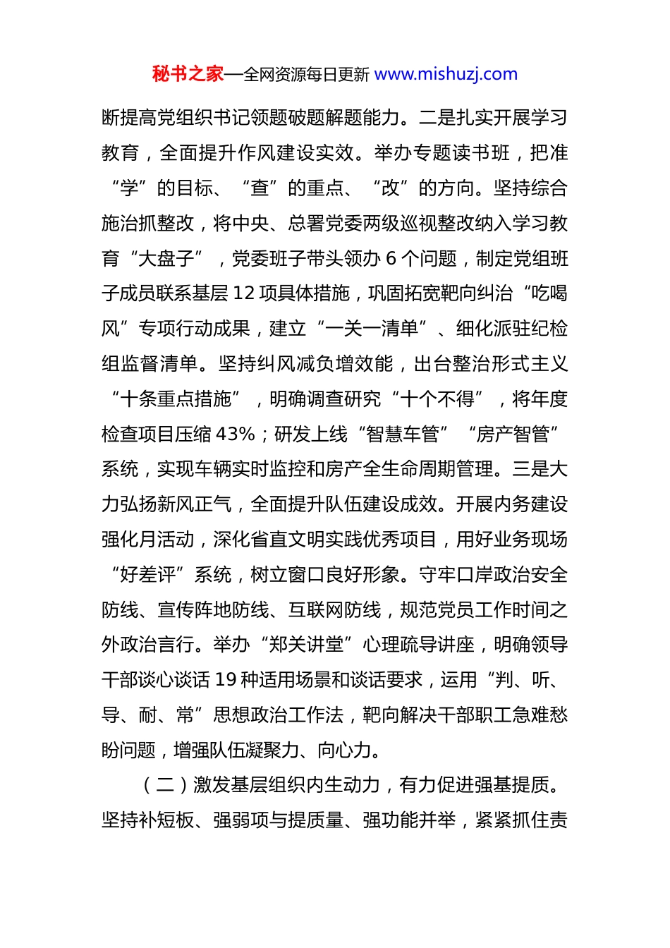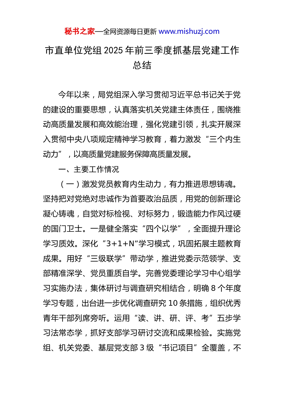 秘书之家—全网资源每日更新 www.mishuzj.com市直单位党组 2025 年前三季度抓基层党建工作总结 今年以来,局党组深入学习贯彻习近平总书记关于党的建设的重要思想,认真落实机关党建主体责任,围绕推动高质量发展和高效能治理,强化党建引领,扎实开展深入贯彻中央八项规定精神学习教育,着力激发“三个内生动力”,以高质量党建服务保障高质量发展。一、主要工作情况(一)激发党员教育内生动力,有力推进思想铸魂。坚持把对党绝对忠诚作为首要政治品质,用党的创新理论凝心铸魂,自觉对标检视、对标努力,锻造能力作风过硬的国门卫士。一是健全落实“四个以学”,全面提升理论学习质效。深化“3+1+N”学习模式,巩固拓展主题教育成果。用好“三级联学”带动学,推进党委示范领学、支部精准深学、党员重质自学。完善党委理论学习中心组学习实施办法,集体研讨与调查研究相结合,明确 8 个年度学习专题,出台进一步优化调查研究 10 条措施,组织优秀青年干部列席旁听。运用“读、讲、研、评、考”五步学习法常态学,抓好支部学习研讨交流和成果检验。实施党组、机关党委、基层党支部 3 级“书记项目”全覆盖,不秘书之家—全网资源每日更新 www.mishuzj.com断提高党组织书记领题破题解题能力。二是扎实开展学习教育,全面提升作风建设实效。举办专题读书班,把准“学”的目标、“查”的重点、“改”的方向。坚持综合施治抓整改,将中央、总署党委两级巡视整改纳入学习教育“大盘子”,党委班子带头领办 6 个问题,制定党组班子成员联系基层 12 项具体措施,巩固拓宽靶向纠治“吃喝风”专项行动成果,建立“一关一清单”、细化派驻纪检组监督清单。坚持纠风减负增效能,出台整治形式主义“十条重点措施”,明确调查研究“十个不得”,将年度检查项目压缩 43%;研发上线“智慧车管”“房产智管”系统,实现车辆实时监控和房产全生命周期管理。三是大力弘扬新风正气,全面提升队伍建设成效。开展内务建设强化月活动,深化省直文明实践优秀项目,用好业务现场“好差评”系统,树立窗口良好形象。守牢口岸政治安全防线、宣传阵地防线、互联网防线,规范党员工作时间之外政治言行。举办“郑关讲堂”心理疏导讲座,明确领导干部谈心谈话 19 种适用场景和谈话要求,运用“判、听、导、耐、常”思想政治工作法,靶向解决干部职工急难愁盼问题,增强队伍凝聚力、向心力。(二)激发基层组织内生动力,有力促进强基提质。坚持补短板、强弱项与提质量、强功能并举,紧紧抓住责秘书之家—全网资源每日更新 www.mishuzj.com任制这个“牛鼻子”,深化“强基提质工程”,种好党建“责任田”。一是坚持清单明责,构建党建工作闭环。贯彻落实机关党建主体责任意见,围绕“抓学习、抓书记、抓统筹、抓机关、抓分类、抓检查、抓考责、抓培训、抓制度”,发挥好机关党委专责作用,在关区全面推行《党支部书记及支部委员抓党员教育管理责任清单》,通过“支部管到人头”强化“管政治、管思想、管学习、管履职、管作风、管生活”6 个方面责任,实现党员管理“人人有责任、事事有落实”,在关区形成党委负总责、政治部统筹协调、机关党委组织推动、各基层党组织具体实施的工作格局。二是坚持系统推进,提高规范管理水平。着力构建“合格支部—‘四强’党支部—品牌党组织”逐级争创矩阵,新创建“四强”党支部 10 个,关区“四强”党支部占比将近 50%,评定关区党建示范培育品牌 17 个,获评党建示范培育品牌 7 个。组织严肃党内政治生活专项行动“回头看”,发挥 3 名系统“党务之星”专业优势,开展专兼职党务干部交叉互学,推广运用 3 个省直党内组织生活优秀案例。三是坚持典型引领,激发创先争优活力。发挥好 2 个省直机关党建示范点等标兵先进单位示范带动作用,组织全关观摩学习、交流经验。运用好全省机关党建创新成果特等案例,持续推进基层党建实训示范点建秘书之家—全网资源每日更新 www.mishuzj.com设,构建“1+5+N”培训体系,创新打造“NPC 实景体验”“传承弘扬实践推演”等课程,拓展助力乡村全面振兴特色内容,探索形成党建联建、外贸联促、项目联动...