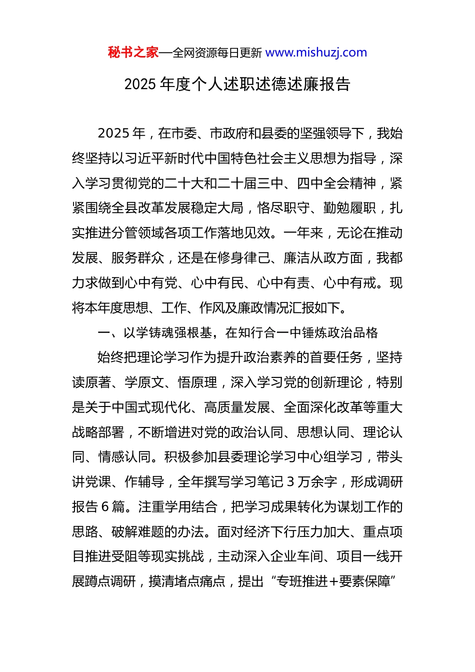 秘书之家—全网资源每日更新 www.mishuzj.com2025 年度个人述职述德述廉报告 2025 年,在市委、市政府和县委的坚强领导下,我始终坚持以习近平新时代中国特色社会主义思想为指导,深入学习贯彻党的二十大和二十届三中、四中全会精神,紧紧围绕全县改革发展稳定大局,恪尽职守、勤勉履职,扎实推进分管领域各项工作落地见效。一年来,无论在推动发展、服务群众,还是在修身律己、廉洁从政方面,我都力求做到心中有党、心中有民、心中有责、心中有戒。现将本年度思想、工作、作风及廉政情况汇报如下。一、以学铸魂强根基,在知行合一中锤炼政治品格始终把理论学习作为提升政治素养的首要任务,坚持读原著、学原文、悟原理,深入学习党的创新理论,特别是关于中国式现代化、高质量发展、全面深化改革等重大战略部署,不断增进对党的政治认同、思想认同、理论认同、情感认同。积极参加县委理论学习中心组学习,带头讲党课、作辅导,全年撰写学习笔记 3 万余字,形成调研报告 6 篇。注重学用结合,把学习成果转化为谋划工作的思路、破解难题的办法。面对经济下行压力加大、重点项目推进受阻等现实挑战,主动深入企业车间、项目一线开展蹲点调研,摸清堵点痛点,提出“专班推进+要素保障”秘书之家—全网资源每日更新 www.mishuzj.com联动机制,推动 3 个停滞项目重启建设,以实际行动践行“两个维护”的政治自觉。二、以干促行勇担当,在服务大局中展现实干作为始终坚持围绕中心、服务大局,聚焦高质量发展首要任务,全力抓好分管领域重点工作。一是聚力产业转型升级。牵头推进县域特色产业提质工程,组织编制《现代产业集群发展规划》,推动传统产业智能化改造,全年实施技改项目 18 个,新增高新技术企业 12 家。协调建立“政银企”对接长效机制,帮助中小微企业融资超 5 亿元,有效缓解资金压力。二是深耕乡村振兴沃土。深入践行“千万工程”经验,统筹推进农村人居环境整治与产业发展,完成村庄绿化美化工程 42 个,新改建农村公路 130 公里,建成农产品冷链物流中心 2 个,带动特色农产品外销增长 27%。推动“党支部+合作社+农户”模式全覆盖,村均集体经济收入突破 50 万元,真正让农民腰包鼓起来。三是用心办好民生实事。坚持把群众满意度作为检验工作的第一标准,牵头落实年度民生实事项目 9 项。针对群众反映强烈的“上学难”“看病远”问题,推动新建乡镇寄宿制学校 3 所、标准化卫生院 4 个,实现县域医共体全覆盖,县域内就诊率达 92%以上。特别是在应对汛期洪涝灾害过程中,连续值守一线 12 天,组织转移群众 1800 余秘书之家—全网资源每日更新 www.mishuzj.com人,确保无一人伤亡,用实际行动守护群众生命财产安全。三、以德润心守底线,在立身修德中涵养清风正气始终牢记“国无德不兴,人无德不立”的古训,把加强道德修养作为人生必修课。一是坚定理想信念。自觉践行社会主义核心价值观,带头弘扬社会公德、职业道德、家庭美德,始终保持健康的生活情趣和高尚的精神追求。在工作中坚持实事求是,不搞“形象工程”、不报“虚假政绩”,坚决抵制形式主义、官僚主义。二是注重家风建设。严格约束亲属和身边工作人员,教育家人遵纪守法、勤俭持家,不插手工程项目、不干预人事安排,筑牢家庭廉洁防线。每逢节假日都召开家庭会议,重温入党誓词、共读红色家书,传承良好家风。三是强化宗旨意识。始终把群众当亲人,定期走访困难户、老党员、退役军人,倾听诉求、解决实际困难。全年累计接待来访群众 86 人次,协调解决住房、医疗、就业等问题 63 件,群众满意度持续提升。在一次走访中,得知独居老人王奶奶因腿脚不便多年未出村,立即协调民政、交通部门开通“爱心专车”,每月接送她到镇上体检购药,老人握着我的手说:“共产党没有忘记我们老百姓。”这句话深深触动了我,也更加坚定了为民服务的初心。秘书之家—全网资源每日更新 www.mishuzj.com四、以廉正身严自律,在慎独慎微中永葆清廉本色始终绷紧廉洁自律这根弦,认真履行党风廉政建设“一岗双责”,做到心有所畏、言有所戒、行有所止。一是严守纪律规矩。严格执行纪律...