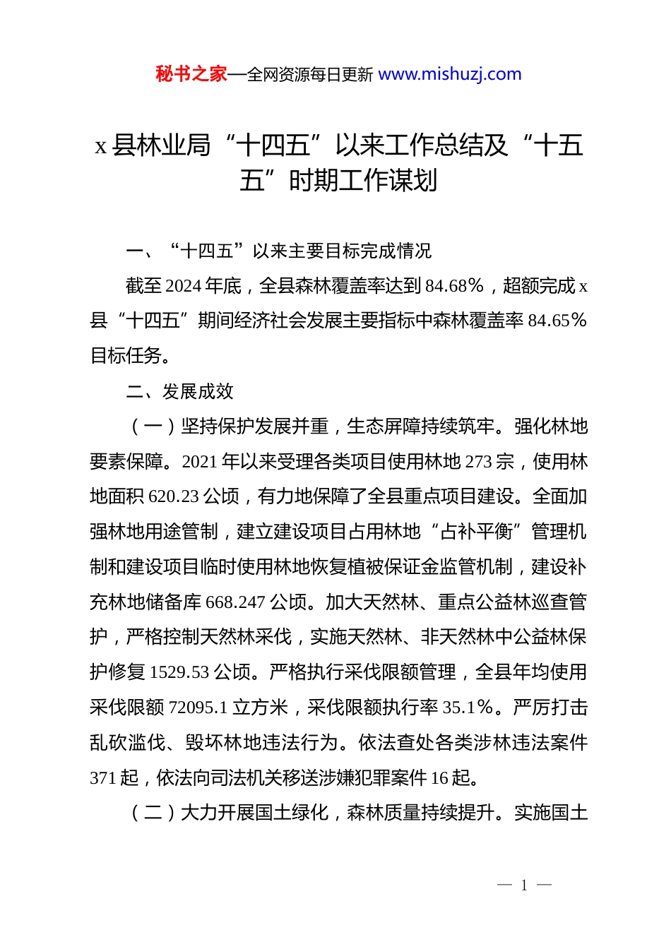 秘书之家—全网资源每日更新 www.mishuzj.comx 县林业局“十四五”以来工作总结及“十五五”时期工作谋划一、“十四五”以来主要目标完成情况截至 2024 年底,全县森林覆盖率达到 84.68%,超额完成 x县“十四五”期间经济社会发展主要指标中森林覆盖率 84.65%目标任务。二、发展成效(一)坚持保护发展并重,生态屏障持续筑牢。强化林地要素保障。2021 年以来受理各类项目使用林地 273 宗,使用林地面积 620.23 公顷,有力地保障了全县重点项目建设。全面加强林地用途管制,建立建设项目占用林地“占补平衡”管理机制和建设项目临时使用林地恢复植被保证金监管机制,建设补充林地储备库 668.247 公顷。加大天然林、重点公益林巡查管护,严格控制天然林采伐,实施天然林、非天然林中公益林保护修复 1529.53 公顷。严格执行采伐限额管理,全县年均使用采伐限额 72095.1 立方米,采伐限额执行率 35.1%。严厉打击乱砍滥伐、毁坏林地违法行为。依法查处各类涉林违法案件371 起,依法向司法机关移送涉嫌犯罪案件 16 起。(二)大力开展国土绿化,森林质量持续提升。实施国土— 1 —秘书之家—全网资源每日更新 www.mishuzj.com绿化试点示范项目、黄山水土保持与生态修复项目、“绿满江淮”行动等林业重点项目,共完成人工造林 7930 亩,封山育林8.2 万亩,森林抚育 41.412 万亩,退化林修复 11 万亩,创建省级森林城镇 3 个、省级森林村庄 29 个,创建绿美村庄 2 个、绿美乡镇 1 个。退耕还林保存率 90%以上。修复一级古树 36 株,二级古树 27 株,三级古树 23 株,1392 株古树全部挂牌保护。(三)创新推动科技赋能,监管水平持续提高。深入开展涉林突出问题大排查大整治百日攻坚行动,完成省环保湿地专项督察问题整改。推进自然保护地优化整合,完成《x 溶洞群省级风景名胜区总体规划》编制。加强秋浦河源国家湿地公园监管,建成全省首个湿地无人机智能巡护系统,增设无人机场9 座、监控电子眼 20 个,构筑了空地一体化“防火墙”。建成国有林场自然科普教育基地和生物多样性展示厅。(四)深化体权制度改革,林业活力持续彰显。全面完成农村集体林权清查工作,核实集体林权 2473 片,面积 29.24 万亩,清查完成率达 100%,完成 302 片办证发证工作。创新“林场+”模式,国有林场与 x 镇 x 村合作造林 1000 亩。推进林业产业发展,加快推进国家储备林项目建设,兴野智林育苗中心项目投入运营。大力发展林下经济,巩固西洋参、香榧、黄精等种植规模 2.6 万亩,林业总产值实现 55 亿元。— 2 —秘书之家—全网资源每日更新 www.mishuzj.com(五)夯实防火防虫基础,生态安全有效保障。推深做实林长制改革,压实“县、乡、村”三级林长责任,强化 1042 名生态护林员管理。全力加强森林防灭火工作,全县森林火灾继续保持“零”发生。加强林业有害生物防治,累计完成集中除治期 29 个疫情小班,18522 亩次松材线虫病疫情除治,完成枯死松树清理 12766 株。三、“十五五”时期工作谋划(一)发展思路“十四五”林业发展实现了从“保绿量”向“提绿质”的转型,未来五年,我们将坚持以***生态文明思想为指导,践行“绿水青山就是金山银山”理念,按照“三绿”并举、“四库”联动,更加注重“提质”“兴业”“利民”的要求,紧紧围绕县委、县政府“中国原生态最美山乡”“高质量发展特色县”建设目标,深入贯彻落实“生态立县、旅游兴县、产业强县”三大发展战略,统筹全域旅游发展目标,以推深做实林长制为总抓手,以培育和保护森林资源为中心,全力打通“绿水青山”与“金山银山”双向转化通道,为全省林业高质量发展贡献 x 经验。(二)主要目标1.森林覆盖率达到 84.7%,林木绿化率达到 91%。(意味— 3 —秘书之家—全网资源每日更新 www.mishuzj.com着要新增超过 3 万亩森林,“十四五”x 县新增 2.25 万亩)2.活立木蓄积量突破 695 万立方米(2024 年资源年报为692.56 万立方米)。3.加强全县森林资源保护管理机构及基础设施建设,切实保护森林和湿地资源。森林防火监控覆盖率...