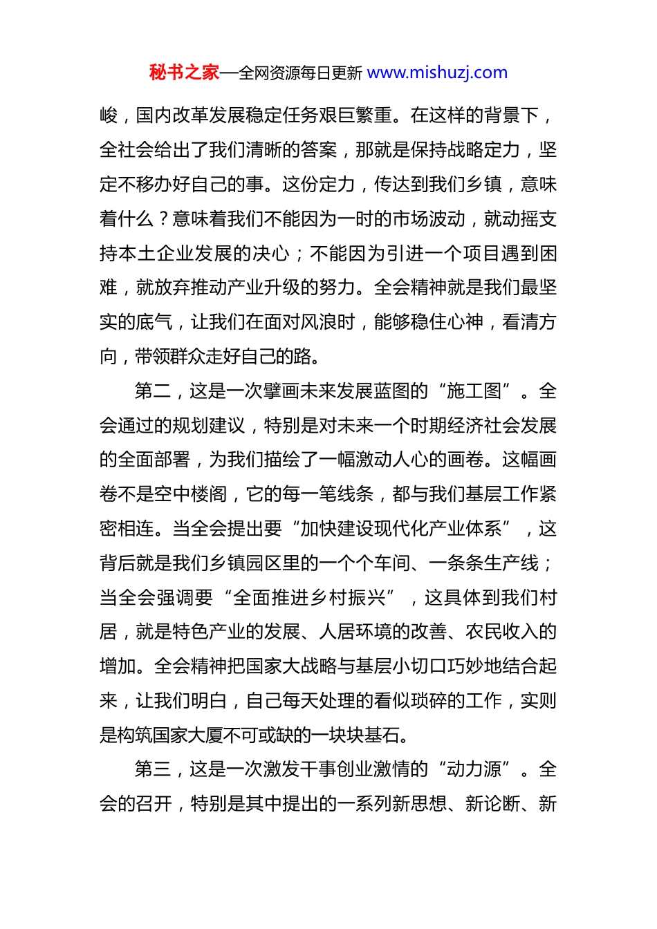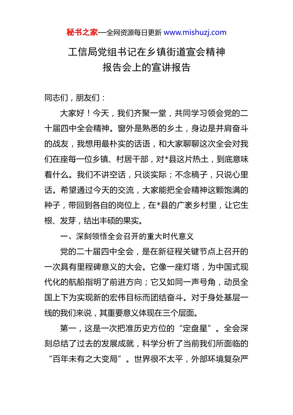 秘书之家—全网资源每日更新 www.mishuzj.com工信局党组书记在乡镇街道宣会精神报告会上的宣讲报告 同志们,朋友们:大家好!今天,我们齐聚一堂,共同学习领会党的二十届四中全会精神。窗外是熟悉的乡土,身边是并肩奋斗的战友,我想用最朴实的话语,和大家聊聊这次全会对我们在座每一位乡镇、村居干部,对*县这片热土,到底意味着什么。我们不讲空话,只谈实际;不念稿子,只说心里话。希望通过今天的交流,大家能把全会精神这颗饱满的种子,带回到各自的岗位上,在*县的广袤乡村里,让它生根、发芽,结出丰硕的果实。一、深刻领悟全会召开的重大时代意义党的二十届四中全会,是在新征程关键节点上召开的一次具有里程碑意义的大会。它像一座灯塔,为中国式现代化的航船指明了前进方向;它又如同一声号角,动员全国上下为实现新的宏伟目标而团结奋斗。对于身处基层一线的我们来说,其重要意义体现在三个层面。第一,这是一次把准历史方位的“定盘星”。全会深刻总结了过去的发展成就,科学分析了当前我们所面临的“百年未有之大变局”。世界很不太平,外部环境复杂严秘书之家—全网资源每日更新 www.mishuzj.com峻,国内改革发展稳定任务艰巨繁重。在这样的背景下,全社会给出了我们清晰的答案,那就是保持战略定力,坚定不移办好自己的事。这份定力,传达到我们乡镇,意味着什么?意味着我们不能因为一时的市场波动,就动摇支持本土企业发展的决心;不能因为引进一个项目遇到困难,就放弃推动产业升级的努力。全会精神就是我们最坚实的底气,让我们在面对风浪时,能够稳住心神,看清方向,带领群众走好自己的路。第二,这是一次擘画未来发展蓝图的“施工图”。全会通过的规划建议,特别是对未来一个时期经济社会发展的全面部署,为我们描绘了一幅激动人心的画卷。这幅画卷不是空中楼阁,它的每一笔线条,都与我们基层工作紧密相连。当全会提出要“加快建设现代化产业体系”,这背后就是我们乡镇园区里的一个个车间、一条条生产线;当全会强调要“全面推进乡村振兴”,这具体到我们村居,就是特色产业的发展、人居环境的改善、农民收入的增加。全会精神把国家大战略与基层小切口巧妙地结合起来,让我们明白,自己每天处理的看似琐碎的工作,实则是构筑国家大厦不可或缺的一块块基石。第三,这是一次激发干事创业激情的“动力源”。全会的召开,特别是其中提出的一系列新思想、新论断、新秘书之家—全网资源每日更新 www.mishuzj.com要求,为我们注入了强大的精神动力。它告诉我们,奋斗的时代没有终点,强国的梦想需要一代代人接力奔跑。对于我们基层干部而言,这种动力体现在“时时放心不下”的责任感,体现在“事不避难、义不逃责”的担当精神。正如前段时间,市工信局组织专题学习时,*教授在辅导课上所讲的,这次全会是一次“新征程的战略总动员”。这种动员,不能只停留在会议室,必须转化为我们走村入户、田间地头的具体行动。看到群众因为我们的努力而生活得更好,看到企业因为我们的服务而发展壮大,这就是对我们工作最好的肯定,也是全会精神在基层最生动地体现。二、精准把握全会精神所蕴含的工作要点党的二十届四中全会精神内涵丰富,包罗万象。今天,我们聚焦一个与*县发展、与在座各位工作密切相关的领域,那就是工业和信息化工作,也就是我们常说的“工信”工作。全会精神如何指导我们抓好乡镇层面的工信工作?我认为要牢牢把握住以下几个关键词。第一个关键词是“新质生产力”。这个词现在很热,但绝不是一个空洞的概念。它本质上是指依靠技术创新、模式创新、管理创新,摆脱传统增长方式,实现高质量发展的先进生产力。对*县而言,发展新质生产力,绝不是要秘书之家—全网资源每日更新 www.mishuzj.com放弃我们现有的产业基础,另起炉灶,而是要做好“老树发新芽”和“小苗成大树”两篇文章。比如,我们有的乡镇有传统的农产品加工业,过去可能停留在粗加工阶段。现在,我们就可以引导企业引进新的生产线,开发预制菜、健康食品等高附加值产品,这就是用新技术改造提升传统产业。再比如,我们一些村子有丰富的竹木资源,过去就是卖原材料。现在,我们能不能...