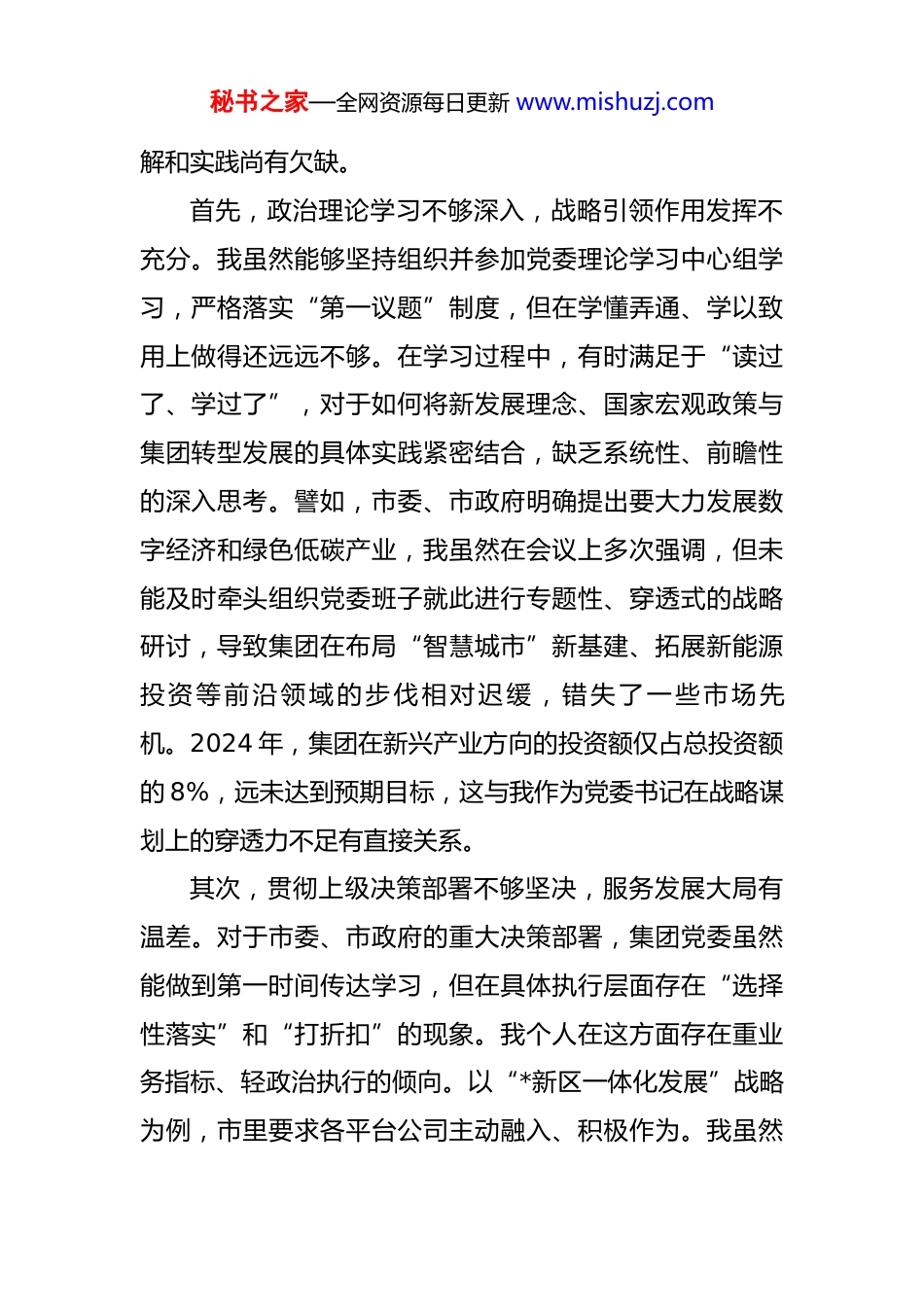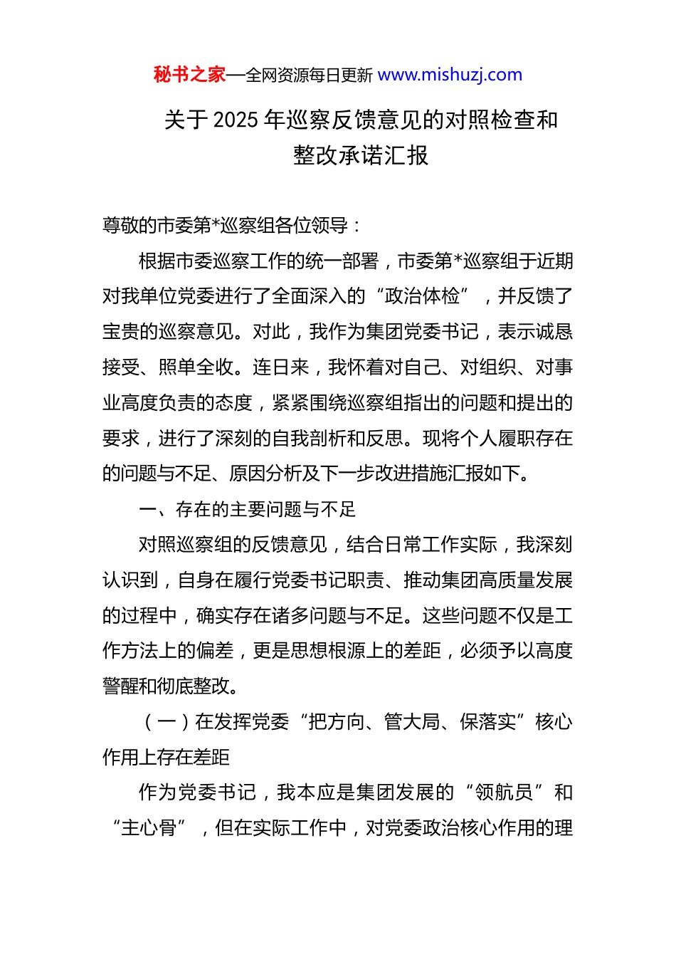 秘书之家—全网资源每日更新 www.mishuzj.com关于 2025 年巡察反馈意见的对照检查和整改承诺汇报 尊敬的市委第*巡察组各位领导:根据市委巡察工作的统一部署,市委第*巡察组于近期对我单位党委进行了全面深入的“政治体检”,并反馈了宝贵的巡察意见。对此,我作为集团党委书记,表示诚恳接受、照单全收。连日来,我怀着对自己、对组织、对事业高度负责的态度,紧紧围绕巡察组指出的问题和提出的要求,进行了深刻的自我剖析和反思。现将个人履职存在的问题与不足、原因分析及下一步改进措施汇报如下。一、存在的主要问题与不足对照巡察组的反馈意见,结合日常工作实际,我深刻认识到,自身在履行党委书记职责、推动集团高质量发展的过程中,确实存在诸多问题与不足。这些问题不仅是工作方法上的偏差,更是思想根源上的差距,必须予以高度警醒和彻底整改。(一)在发挥党委“把方向、管大局、保落实”核心作用上存在差距作为党委书记,我本应是集团发展的“领航员”和“主心骨”,但在实际工作中,对党委政治核心作用的理秘书之家—全网资源每日更新 www.mishuzj.com解和实践尚有欠缺。首先,政治理论学习不够深入,战略引领作用发挥不充分。我虽然能够坚持组织并参加党委理论学习中心组学习,严格落实“第一议题”制度,但在学懂弄通、学以致用上做得还远远不够。在学习过程中,有时满足于“读过了、学过了”,对于如何将新发展理念、国家宏观政策与集团转型发展的具体实践紧密结合,缺乏系统性、前瞻性的深入思考。譬如,市委、市政府明确提出要大力发展数字经济和绿色低碳产业,我虽然在会议上多次强调,但未能及时牵头组织党委班子就此进行专题性、穿透式的战略研讨,导致集团在布局“智慧城市”新基建、拓展新能源投资等前沿领域的步伐相对迟缓,错失了一些市场先机。2024 年,集团在新兴产业方向的投资额仅占总投资额的 8%,远未达到预期目标,这与我作为党委书记在战略谋划上的穿透力不足有直接关系。其次,贯彻上级决策部署不够坚决,服务发展大局有温差。对于市委、市政府的重大决策部署,集团党委虽然能做到第一时间传达学习,但在具体执行层面存在“选择性落实”和“打折扣”的现象。我个人在这方面存在重业务指标、轻政治执行的倾向。以“*新区一体化发展”战略为例,市里要求各平台公司主动融入、积极作为。我虽然秘书之家—全网资源每日更新 www.mishuzj.com也组织了班子成员到新区进行过调研,但后续未能下定决心,调动集团核心资源向新区项目倾斜,总担心新区的项目投资周期长、回报不确定,会影响集团当期的营收和利润数据。这种求稳怕乱、患得患失的心态,导致集团在新区建设中的角色从“主力军”降格为“参与者”,未能充分彰显市属国企在重大战略中的担当和作为。再者,“三重一大”决策制度执行不够严格,党委前置研究讨论程序有时虚化。我深刻反思,在工作中确实存在为了追求所谓的“效率”而简化决策流程的情况。尤其是在一些时间紧、任务重的项目上,我有时会先入为主形成意见,习惯于在董事长办公会或总经理办公会上与行政班子成员商议并形成初步方案,再提交党委会审议。这使得党委的前置研究讨论在客观上变成了对既定方案的“背书”环节,未能充分发挥党委在重大决策中的前置把关和集体决策作用。比如,在 2025 年初的“*片区综合开发项目”二期融资方案决策中,由于时间紧迫,我直接召集财务和投融资部门开会敲定了高达 15 亿元的融资方案,提交党委会时,留给各位委员研究思考的时间不足,讨论不够充分,导致后续在执行中发现方案对利率波动的风险预估不足,增加了集团的财务成本。(二)在履行全面从严治党“两个责任”上存在短板秘书之家—全网资源每日更新 www.mishuzj.com作为管党治党的第一责任人,我深感自己肩上的担子之重,但对照巡察要求,深查细照,仍发现存在明显差距。第一,落实主体责任不够到位,压力传导层层递减。我对全面从严治党工作的复杂性和长期性认识不足,存在一定的“重业务、轻党建”思想。虽然每年都按要求主持召开党风廉政建设专题会议、签订责任书,但往往是“以会议落实会议、以文件落实文件”,对责任书的...