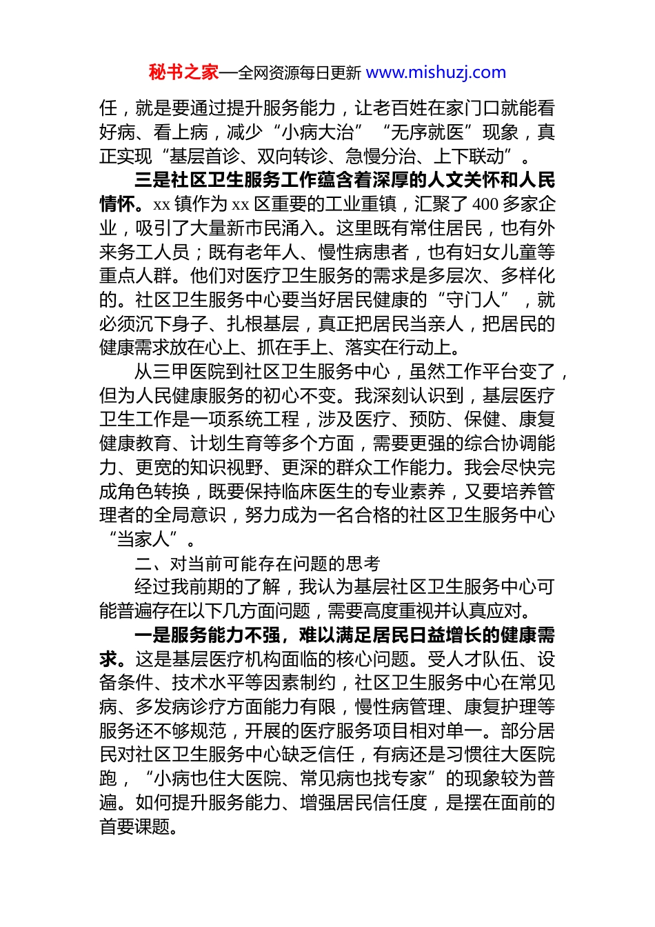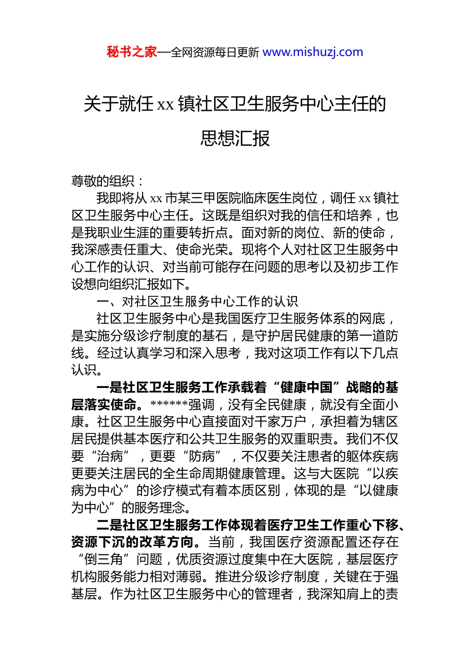 秘书之家—全网资源每日更新 www.mishuzj.com关于就任 xx 镇社区卫生服务中心主任的思想汇报尊敬的组织:我即将从 xx 市某三甲医院临床医生岗位,调任 xx 镇社区卫生服务中心主任。这既是组织对我的信任和培养,也是我职业生涯的重要转折点。面对新的岗位、新的使命,我深感责任重大、使命光荣。现将个人对社区卫生服务中心工作的认识、对当前可能存在问题的思考以及初步工作设想向组织汇报如下。一、对社区卫生服务中心工作的认识社区卫生服务中心是我国医疗卫生服务体系的网底,是实施分级诊疗制度的基石,是守护居民健康的第一道防线。经过认真学习和深入思考,我对这项工作有以下几点认识。一是社区卫生服务工作承载着“健康中国”战略的基层落实使命。******强调,没有全民健康,就没有全面小康。社区卫生服务中心直接面对千家万户,承担着为辖区居民提供基本医疗和公共卫生服务的双重职责。我们不仅要“治病”,更要“防病”,不仅要关注患者的躯体疾病更要关注居民的全生命周期健康管理。这与大医院“以疾病为中心”的诊疗模式有着本质区别,体现的是“以健康为中心”的服务理念。二是社区卫生服务工作体现着医疗卫生工作重心下移、资源下沉的改革方向。当前,我国医疗资源配置还存在“倒三角”问题,优质资源过度集中在大医院,基层医疗机构服务能力相对薄弱。推进分级诊疗制度,关键在于强基层。作为社区卫生服务中心的管理者,我深知肩上的责秘书之家—全网资源每日更新 www.mishuzj.com任,就是要通过提升服务能力,让老百姓在家门口就能看好病、看上病,减少“小病大治”“无序就医”现象,真正实现“基层首诊、双向转诊、急慢分治、上下联动”。三是社区卫生服务工作蕴含着深厚的人文关怀和人民情怀。xx 镇作为 xx 区重要的工业重镇,汇聚了 400 多家企业,吸引了大量新市民涌入。这里既有常住居民,也有外来务工人员;既有老年人、慢性病患者,也有妇女儿童等重点人群。他们对医疗卫生服务的需求是多层次、多样化的。社区卫生服务中心要当好居民健康的“守门人”,就必须沉下身子、扎根基层,真正把居民当亲人,把居民的健康需求放在心上、抓在手上、落实在行动上。从三甲医院到社区卫生服务中心,虽然工作平台变了,但为人民健康服务的初心不变。我深刻认识到,基层医疗卫生工作是一项系统工程,涉及医疗、预防、保健、康复健康教育、计划生育等多个方面,需要更强的综合协调能力、更宽的知识视野、更深的群众工作能力。我会尽快完成角色转换,既要保持临床医生的专业素养,又要培养管理者的全局意识,努力成为一名合格的社区卫生服务中心“当家人”。二、对当前可能存在问题的思考经过我前期的了解,我认为基层社区卫生服务中心可能普遍存在以下几方面问题,需要高度重视并认真应对。一是服务能力不强,难以满足居民日益增长的健康需求。这是基层医疗机构面临的核心问题。受人才队伍、设备条件、技术水平等因素制约,社区卫生服务中心在常见病、多发病诊疗方面能力有限,慢性病管理、康复护理等服务还不够规范,开展的医疗服务项目相对单一。部分居民对社区卫生服务中心缺乏信任,有病还是习惯往大医院跑,“小病也住大医院、常见病也找专家”的现象较为普遍。如何提升服务能力、增强居民信任度,是摆在面前的首要课题。秘书之家—全网资源每日更新 www.mishuzj.com二是人才队伍建设滞后,成为制约发展的瓶颈。人才是第一资源,这在基层体现得尤为明显。目前基层医疗机构普遍面临“招人难、留人难、用人难”三难问题。一方面,受编制、待遇、发展空间等因素影响,优秀医学毕业生不愿意到基层工作;另一方面,现有人员学历层次不高知识结构老化、继续教育机会少,专业技术能力提升缓慢全科医生短缺问题尤为突出,部分医务人员还停留在专科思维,缺乏全科理念和综合服务能力。此外,护理、公卫康复等专业人才也普遍不足,影响了服务的全面性和连续性。三是公共卫生服务流于形式,精细化管理有待加强。基本公共卫生服务是国家的惠民工程,但在实际执行中,部分项目存在“重建档轻服务、重数量轻质量”的问题。健康档案建了不少,但真正发挥作用的不多,...