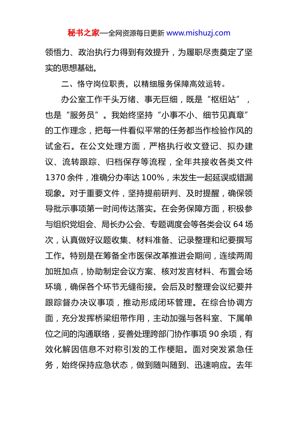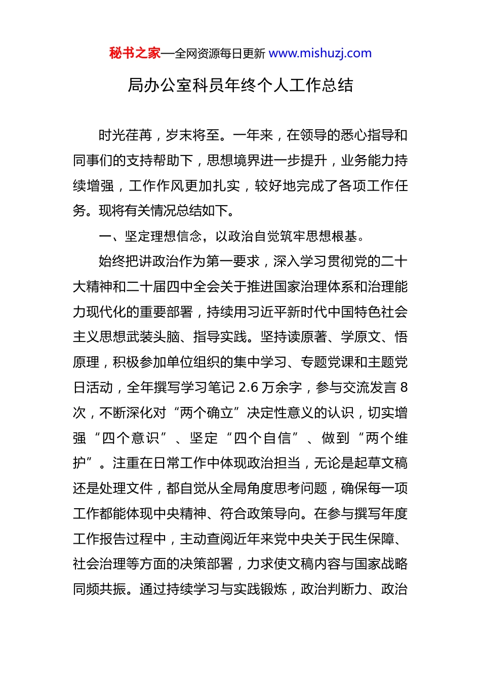 秘书之家—全网资源每日更新 www.mishuzj.com局办公室科员年终个人工作总结 时光荏苒,岁末将至。一年来,在领导的悉心指导和同事们的支持帮助下,思想境界进一步提升,业务能力持续增强,工作作风更加扎实,较好地完成了各项工作任务。现将有关情况总结如下。一、坚定理想信念,以政治自觉筑牢思想根基。始终把讲政治作为第一要求,深入学习贯彻党的二十大精神和二十届四中全会关于推进国家治理体系和治理能力现代化的重要部署,持续用习近平新时代中国特色社会主义思想武装头脑、指导实践。坚持读原著、学原文、悟原理,积极参加单位组织的集中学习、专题党课和主题党日活动,全年撰写学习笔记 2.6 万余字,参与交流发言 8次,不断深化对“两个确立”决定性意义的认识,切实增强“四个意识”、坚定“四个自信”、做到“两个维护”。注重在日常工作中体现政治担当,无论是起草文稿还是处理文件,都自觉从全局角度思考问题,确保每一项工作都能体现中央精神、符合政策导向。在参与撰写年度工作报告过程中,主动查阅近年来党中央关于民生保障、社会治理等方面的决策部署,力求使文稿内容与国家战略同频共振。通过持续学习与实践锻炼,政治判断力、政治秘书之家—全网资源每日更新 www.mishuzj.com领悟力、政治执行力得到有效提升,为履职尽责奠定了坚实的思想基础。二、恪守岗位职责,以精细服务保障高效运转。办公室工作千头万绪、事无巨细,既是“枢纽站”,也是“服务员”。我始终坚持“小事不小、细节见真章”的工作理念,把每一件看似平常的任务都当作检验作风的试金石。在公文处理方面,严格执行收文登记、拟办建议、流转跟踪、归档保存等流程,全年共接收各类文件1370 余件,准确分办率达 100%,未发生一起延误或错漏现象。对于重要文件,坚持提前研判、及时提醒,确保领导批示事项第一时间传达落实。在会务保障方面,积极参与组织党组会、局长办公会、专题调度会等各类会议 64 场次,认真做好议题收集、材料准备、记录整理和纪要撰写工作。特别是在筹备全市医保改革推进会期间,连续两周加班加点,协助制定会议方案、核对发言材料、布置会场环境,确保各个环节无缝衔接。会后及时整理会议纪要并跟踪督办决议事项,推动形成闭环管理。在综合协调方面,充分发挥桥梁纽带作用,主动加强与各科室、下属单位之间的沟通联络,妥善处理跨部门协作事项 90 余项,有效化解因信息不对称引发的工作梗阻。面对突发紧急任务,始终保持应急状态,做到随叫随到、迅速响应。去年秘书之家—全网资源每日更新 www.mishuzj.com汛期某区医保信息系统出现故障,接到通知后连夜协助技术团队调阅历史运维档案,为快速恢复系统运行提供了关键数据支持。三、厚植为民情怀,以真情实感回应群众期盼。虽然身处后台岗位,但始终牢记“群众利益无小事”的宗旨,努力把服务群众的理念融入每一项具体工作中。在信访接待方面,协助建立来访登记台账,实行首接负责制,全年参与接待群众来访 120 余人次,耐心倾听诉求、细致解释政策,对能够当场答复的问题及时回应,对需要研究解决的事项及时转交相关科室并跟进反馈进度,群众满意度达 96%以上。曾有一位退休职工因异地就医报销比例计算存在疑问前来咨询,虽不属于直接经办岗位,仍主动帮助其调取历年报销记录,逐笔核算费用明细,并联系业务科室核实政策适用情况,最终给出清晰解答,老人临走时连声道谢:“没想到你们这么上心!”在政策宣传方面,积极参与“医保服务进社区”活动,三次深入街道开展志愿服务,发放通俗易懂的宣传折页 800 余份,现场解答居民关心的参保缴费、门诊共济等问题百余条。针对老年人阅读不便的实际,参与制作“一图读懂”系列图解材料,用简洁语言和直观图表解读政策要点,被广泛转发使用。此外,还主动关注干部职工切身需求,协助工会完成秘书之家—全网资源每日更新 www.mishuzj.com节日慰问品发放、健康体检预约等工作,为异地交流干部协调临时周转住房,点滴之间传递组织温暖。四、强化自我修炼,以勤学善思提升综合素养。我深知办公室岗位对综合素质要求较高,唯有不断学习才能适应新形势新任务。一方面...