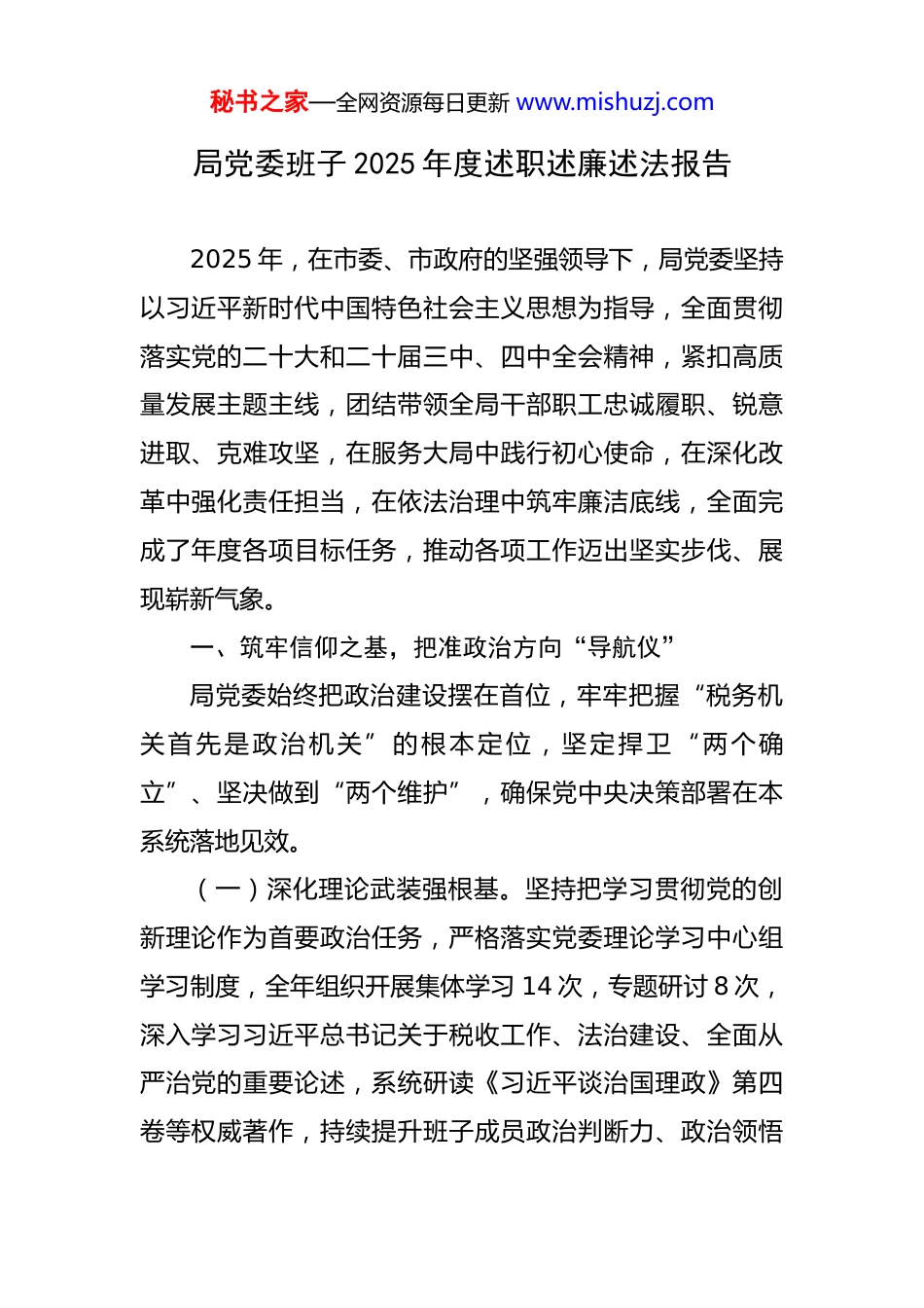秘书之家—全网资源每日更新 www.mishuzj.com局党委班子 2025 年度述职述廉述法报告 2025 年,在市委、市政府的坚强领导下,局党委坚持以习近平新时代中国特色社会主义思想为指导,全面贯彻落实党的二十大和二十届三中、四中全会精神,紧扣高质量发展主题主线,团结带领全局干部职工忠诚履职、锐意进取、克难攻坚,在服务大局中践行初心使命,在深化改革中强化责任担当,在依法治理中筑牢廉洁底线,全面完成了年度各项目标任务,推动各项工作迈出坚实步伐、展现崭新气象。一、筑牢信仰之基,把准政治方向“导航仪”局党委始终把政治建设摆在首位,牢牢把握“税务机关首先是政治机关”的根本定位,坚定捍卫“两个确立”、坚决做到“两个维护”,确保党中央决策部署在本系统落地见效。(一)深化理论武装强根基。坚持把学习贯彻党的创新理论作为首要政治任务,严格落实党委理论学习中心组学习制度,全年组织开展集体学习 14 次,专题研讨 8 次,深入学习习近平总书记关于税收工作、法治建设、全面从严治党的重要论述,系统研读《习近平谈治国理政》第四卷等权威著作,持续提升班子成员政治判断力、政治领悟秘书之家—全网资源每日更新 www.mishuzj.com力、政治执行力。结合常态化开展主题教育成果巩固,组织开展“学思想、强党性、重实践、建新功”主题读书班,通过原原本本学、联系实际悟、带着问题思,推动党的创新理论入脑入心、见行见效。(二)压实政治责任强担当。严格落实意识形态工作责任制,定期分析研判意识形态领域风险隐患,加强对税务网站、政务新媒体、宣传栏等阵地管理,坚决守好政治安全底线。党委书记认真履行“第一责任人”职责,带头研究部署、推动落实重大事项;班子成员严格落实“一岗双责”,将分管领域业务工作与党风廉政建设同部署、同检查、同考核,形成齐抓共管、协同推进的工作格局。全年召开党委会专题研究党建工作 6 次,听取党建、纪检、法治等工作汇报 12 次,推动全面从严治党向纵深发展。(三)健全制度机制强规范。修订完善党委议事规则、“三重一大”事项决策程序等制度,确保决策科学民主、依法合规。严格执行请示报告制度,重要工作部署、重大事项进展、重大突发事件均按规定及时向上级党组织请示报告。持续加强领导班子自身建设,严肃党内政治生活,高质量开好民主生活会,深入开展批评与自我批评,增强班子凝聚力和战斗力。二、紧扣发展之要,锻造服务大局“硬支撑”秘书之家—全网资源每日更新 www.mishuzj.com局党委始终胸怀“国之大者”,坚持依法治税、服务为民,充分发挥税收职能作用,在服务经济社会高质量发展中彰显税务担当。(一)组织收入稳中有进。坚持依法依规组织税费收入,既确保应收尽收,又坚决杜绝收取“过头税费”。科学研判经济税源形势,强化重点行业、重点企业税源监控,推动税费收入实现平稳增长。2025 年,全年完成各项税费收入***亿元,同比增长*.*%,为地方财政稳定运行提供了坚实保障。深入开展税收经济分析,形成《重点产业发展税收贡献分析》《小微企业税收优惠政策效应评估》等专题报告 12 篇,为市委、市政府科学决策提供有力参考。(二)政策落实精准有力。不折不扣落实党中央、国务院出台的各项结构性减税降费政策,特别是支持科技创新、绿色发展、中小微企业发展的税收优惠措施,做到政策红利“应享尽享、直达快享”。全年累计为纳税人缴费人减税降费**亿元,惠及市场主体超*万户。创新开展“政策找人”服务模式,通过大数据比对精准识别可享受政策企业,主动推送政策清单和操作指引,确保企业“知政策、懂流程、会申报”。(三)营商环境持续优化。深入推进“便民办税春风秘书之家—全网资源每日更新 www.mishuzj.com行动”,推出“一窗通办”“跨区域通办”“掌上办税”等便民举措 36 项,压缩办税时限 40%以上。建成智慧办税服务厅 8 个,配备智能导税机器人、自助办税终端等设备,实现高频事项“全程自助、即时办结”。建立领导班子成员联系重点企业机制,全年走访企业 280 户次,现场解决涉税诉求 67 件,纳税人满意度测评位居全省前列。三、恪守为民之心,织密便民利企...