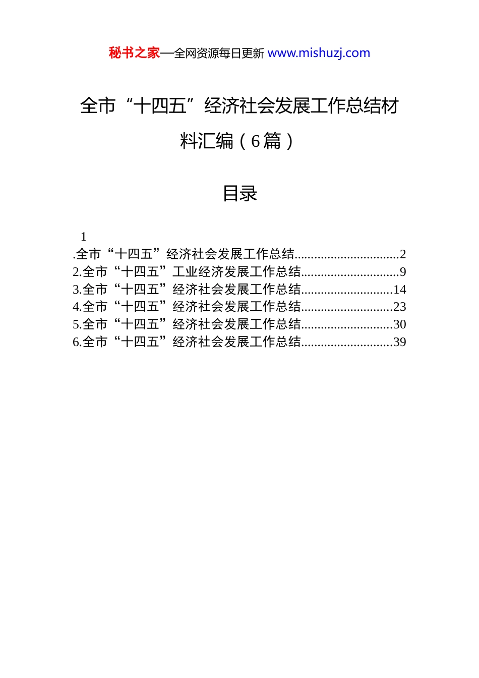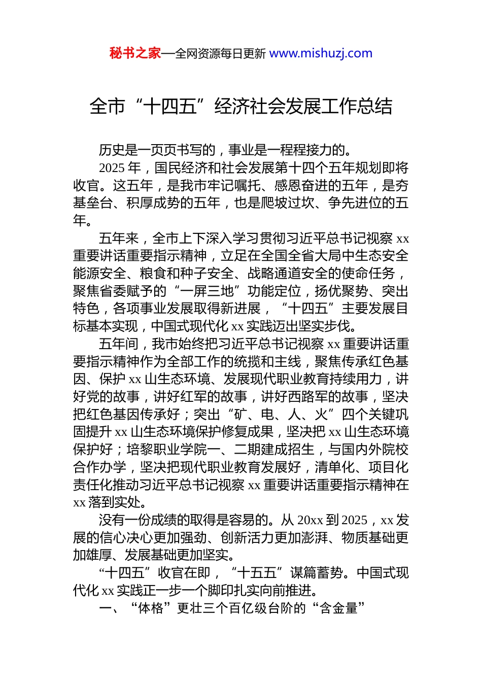 秘书之家—全网资源每日更新 www.mishuzj.com全市“十四五”经济社会发展工作总结材料汇编(6 篇)目录1.全市“十四五”经济社会发展工作总结................................22.全市“十四五”工业经济发展工作总结..............................93.全市“十四五”经济社会发展工作总结............................144.全市“十四五”经济社会发展工作总结............................235.全市“十四五”经济社会发展工作总结............................306.全市“十四五”经济社会发展工作总结............................39秘书之家—全网资源每日更新 www.mishuzj.com全市“十四五”经济社会发展工作总结历史是一页页书写的,事业是一程程接力的。2025 年,国民经济和社会发展第十四个五年规划即将收官。这五年,是我市牢记嘱托、感恩奋进的五年,是夯基垒台、积厚成势的五年,也是爬坡过坎、争先进位的五年。五年来,全市上下深入学习贯彻习近平总书记视察 xx重要讲话重要指示精神,立足在全国全省大局中生态安全能源安全、粮食和种子安全、战略通道安全的使命任务,聚焦省委赋予的“一屏三地”功能定位,扬优聚势、突出特色,各项事业发展取得新进展,“十四五”主要发展目标基本实现,中国式现代化 xx 实践迈出坚实步伐。五年间,我市始终把习近平总书记视察 xx 重要讲话重要指示精神作为全部工作的统揽和主线,聚焦传承红色基因、保护 xx 山生态环境、发展现代职业教育持续用力,讲好党的故事,讲好红军的故事,讲好西路军的故事,坚决把红色基因传承好;突出“矿、电、人、火”四个关键巩固提升 xx 山生态环境保护修复成果,坚决把 xx 山生态环境保护好;培黎职业学院一、二期建成招生,与国内外院校合作办学,坚决把现代职业教育发展好,清单化、项目化责任化推动习近平总书记视察 xx 重要讲话重要指示精神在xx 落到实处。没有一份成绩的取得是容易的。从 20xx 到 2025,xx 发展的信心决心更加强劲、创新活力更加澎湃、物质基础更加雄厚、发展基础更加坚实。“十四五”收官在即,“十五五”谋篇蓄势。中国式现代化 xx 实践正一步一个脚印扎实向前推进。一、“体格”更壮三个百亿级台阶的“含金量”秘书之家—全网资源每日更新 www.mishuzj.com“十四五”时期,全市经济实现了质的有效提升和量的合理增长,“家底”更加殷实,底气持续增强——抢抓新时代推动西部大开发战略机遇,坚持高质量发展首要任务不动摇,从总量看,全市地区生产总值由 20xx年的 xxx.x 亿元提升至 xxxx 年的 xxx.x 亿元、年均增长 x.x%,高于全国 x 个、全省 x.x 个百分点,预计今年经济总量突破 xxx 亿元,实现五年迈上三个百亿级台阶。从质量看,产业升级步伐加快,2024 年战略性新兴产业增加值占规上工业增加值比重达 xx.x%;市场主体活力迸发,2024 年经营主体总量 xx.x 万户、较 xxxx 年增长 xx%,其中“四上”在库企业 xxxx 户、居全省第三;城乡发展更为均衡,城乡居民收入比从 xxxx 年的 x.xx∶x 收窄至 x.xx∶x 一系列数据清晰勾勒出五年经济增长脉络图。增长的背后,是发展理念的深刻转变,是产业结构持续优化的集中体现,是营商环境不断改善激发出的澎湃活力,更是全市上下聚力攻坚、笃行实干的生动诠释。二、结构调优 xx 特色现代化产业体系的“含新量”向新向好,是高质量发展的必然要求。“十四五”以来,我市坚持把发展经济的着力点放在实体经济上,加快构建具有 xx 特色的现代化产业体系——现代种业、综合能源、文化旅游这些镌刻着 xx 印记的产业在新时代迸发出新的光彩。“十四五”以来,我市培育壮大现代种业、绿色蔬菜、xx 肉牛、优质奶业、戈壁节水生态农业“五个百亿级”产业集群,加力拓展现代农业发展“六个空间”,2024 年一产总量达 xxx.x 亿元、居全省第二,农民经营性净收入达 xxxxx 元。深入实施强工业行动,加快构建 xx 特色“xxx”工业发展体系,“十四五”累计开工工业项目 xxx 个、建成 xxx 个,工业固投年均增长 xx.x%,新增规上工业企业 xxx 户、总量达 xxx 户,对规上...