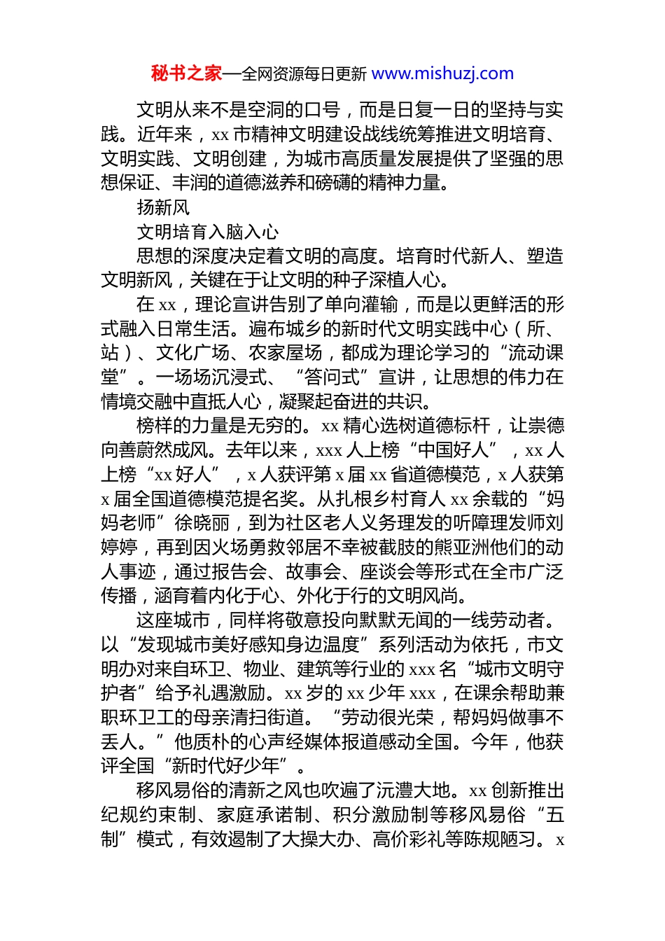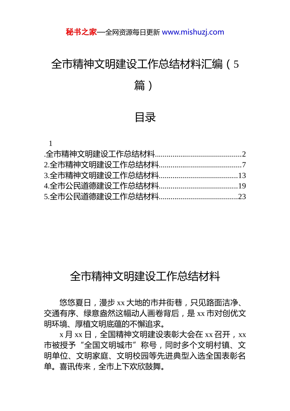 秘书之家—全网资源每日更新 www.mishuzj.com全市精神文明建设工作总结材料汇编(5篇)目录1.全市精神文明建设工作总结材料............................................22.全市精神文明建设工作总结材料..........................................73.全市精神文明建设工作总结材料........................................134.全市公民道德建设工作总结材料........................................195.全市公民道德建设工作总结材料........................................23全市精神文明建设工作总结材料悠悠夏日,漫步 xx 大地的市井街巷,只见路面洁净、交通有序、绿意盎然这幅动人画卷背后,是 xx 市对创优文明环境、厚植文明底蕴的不懈追求。x 月 xx 日,全国精神文明建设表彰大会在 xx 召开,xx市被授予“全国文明城市”称号,同时多个文明村镇、文明单位、文明家庭、文明校园等先进典型入选全国表彰名单。喜讯传来,全市上下欢欣鼓舞。秘书之家—全网资源每日更新 www.mishuzj.com文明从来不是空洞的口号,而是日复一日的坚持与实践。近年来,xx 市精神文明建设战线统筹推进文明培育、文明实践、文明创建,为城市高质量发展提供了坚强的思想保证、丰润的道德滋养和磅礴的精神力量。扬新风文明培育入脑入心思想的深度决定着文明的高度。培育时代新人、塑造文明新风,关键在于让文明的种子深植人心。在 xx,理论宣讲告别了单向灌输,而是以更鲜活的形式融入日常生活。遍布城乡的新时代文明实践中心(所、站)、文化广场、农家屋场,都成为理论学习的“流动课堂”。一场场沉浸式、“答问式”宣讲,让思想的伟力在情境交融中直抵人心,凝聚起奋进的共识。榜样的力量是无穷的。xx 精心选树道德标杆,让崇德向善蔚然成风。去年以来,xxx 人上榜“中国好人”,xx 人上榜“xx 好人”,x 人获评第 x 届 xx 省道德模范,x 人获第x 届全国道德模范提名奖。从扎根乡村育人 xx 余载的“妈妈老师”徐晓丽,到为社区老人义务理发的听障理发师刘婷婷,再到因火场勇救邻居不幸被截肢的熊亚洲他们的动人事迹,通过报告会、故事会、座谈会等形式在全市广泛传播,涵育着内化于心、外化于行的文明风尚。这座城市,同样将敬意投向默默无闻的一线劳动者。以“发现城市美好感知身边温度”系列活动为依托,市文明办对来自环卫、物业、建筑等行业的 xxx 名“城市文明守护者”给予礼遇激励。xx 岁的 xx 少年 xxx,在课余帮助兼职环卫工的母亲清扫街道。“劳动很光荣,帮妈妈做事不丢人。”他质朴的心声经媒体报道感动全国。今年,他获评全国“新时代好少年”。移风易俗的清新之风也吹遍了沅澧大地。xx 创新推出纪规约束制、家庭承诺制、积分激励制等移风易俗“五制”模式,有效遏制了大操大办、高价彩礼等陈规陋习。x秘书之家—全网资源每日更新 www.mishuzj.com县深化婚俗改革的经验获全国推介,xx 县 xx 镇 xx 村、xx市 xx 镇 x 社区的村规民约(居民公约)入选 xx 省“十佳”。这些探索与实践,被央级、省级媒体广泛关注和报道,xx“正家风、树新风、育民风”的扎实成效赢得赞誉。聚民心文明实践出新出彩文明,不仅在于理念的认同,更在于行动的自觉。xx精心构筑平台,创新活动形式,让文明实践真正成为服务群众、凝聚人心的温暖桥梁。特色阵地焕发蓬勃活力。xx 统筹整合文化馆(站)、城市书房等 xxxx 余个文化阵地,将其打造为文明实践的坚实依托。一系列新时代文明实践活动在此蓬勃开展,让文明看得见、摸得着、可参与、有温度。去年以来,xx 街精心打造“桃花源式待客之道”示范街区,成为展示城市文明的新窗口。面向全体市民发出的《xx》倡议,引发超过xx 万市民的热烈响应与共鸣,“灵醒好客”正内化为 xx 的城市品格。文化惠民结出丰硕果实。以“四季村晚”“百团大赛”“送戏下乡”等群众性文化活动为载体,xx 将精神食粮送到百姓家门口。x 万场次活动惠及群众 xxxx 万人次,xxx 余支基层文艺团队活跃在城乡大地,群众文化生活日益丰盈,精神面貌愈发昂扬向上。志愿精神绘就最美底色。超过 xx 万人的注册志愿者队伍以及...