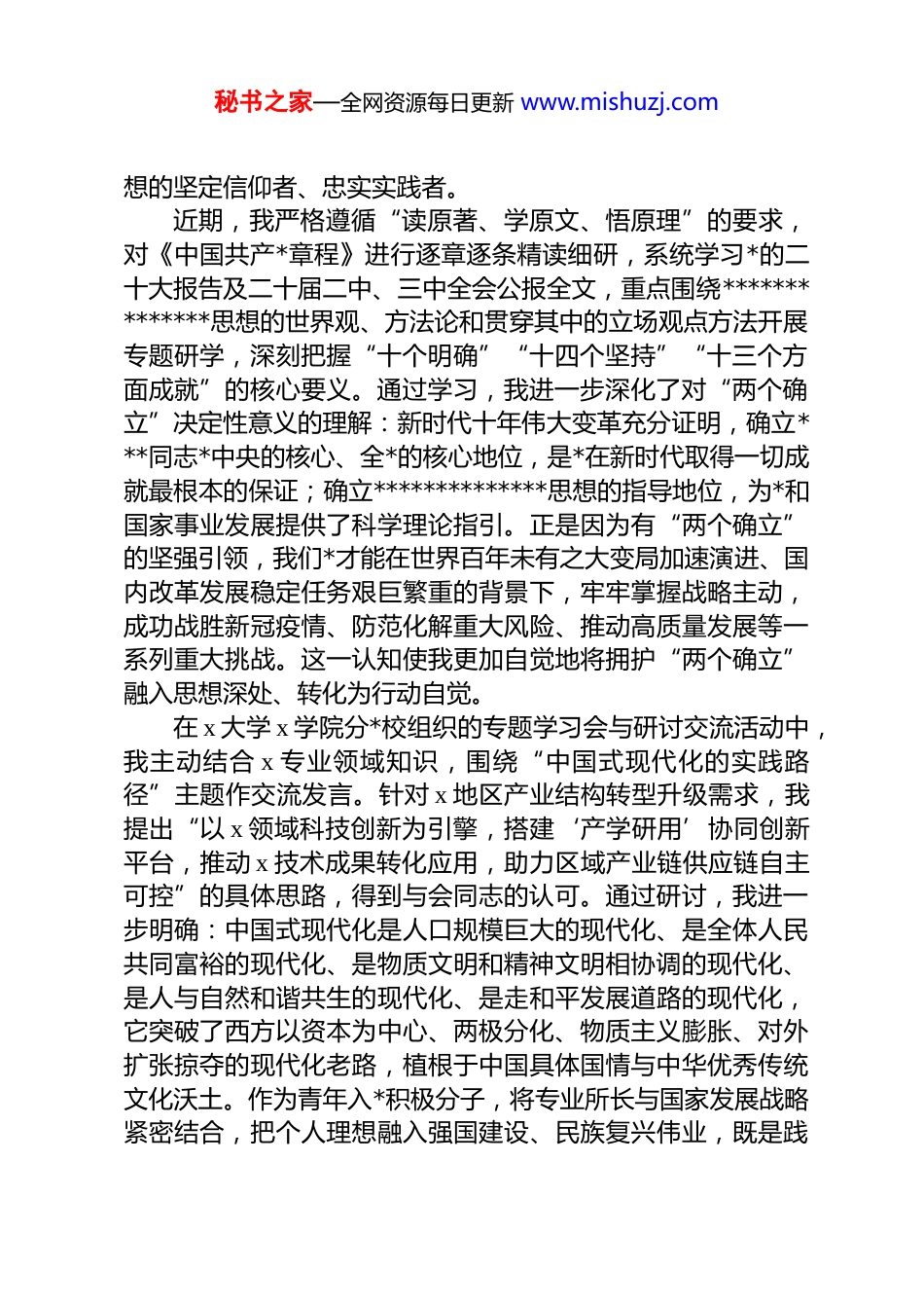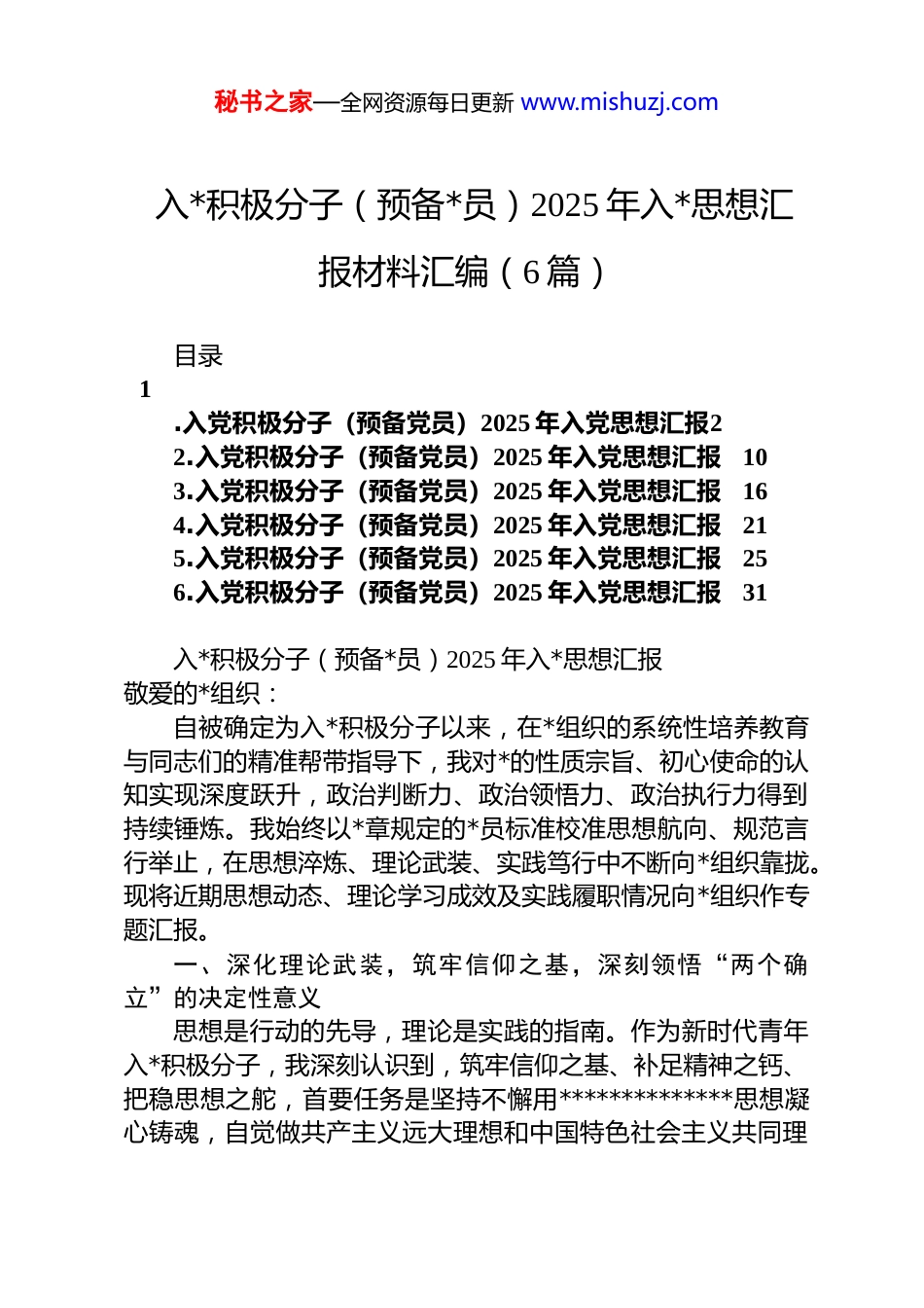 秘书之家—全网资源每日更新 www.mishuzj.com入*积极分子(预备*员)2025 年入*思想汇报材料汇编(6 篇)目录1.入党积极分子(预备党员)2025 年入党思想汇报22.入党积极分子(预备党员)2025 年入党思想汇报103.入党积极分子(预备党员)2025 年入党思想汇报164.入党积极分子(预备党员)2025 年入党思想汇报215.入党积极分子(预备党员)2025 年入党思想汇报256.入党积极分子(预备党员)2025 年入党思想汇报31入*积极分子(预备*员)2025 年入*思想汇报敬爱的*组织:自被确定为入*积极分子以来,在*组织的系统性培养教育与同志们的精准帮带指导下,我对*的性质宗旨、初心使命的认知实现深度跃升,政治判断力、政治领悟力、政治执行力得到持续锤炼。我始终以*章规定的*员标准校准思想航向、规范言行举止,在思想淬炼、理论武装、实践笃行中不断向*组织靠拢。现将近期思想动态、理论学习成效及实践履职情况向*组织作专题汇报。一、深化理论武装,筑牢信仰之基,深刻领悟“两个确立”的决定性意义思想是行动的先导,理论是实践的指南。作为新时代青年入*积极分子,我深刻认识到,筑牢信仰之基、补足精神之钙、把稳思想之舵,首要任务是坚持不懈用**************思想凝心铸魂,自觉做共产主义远大理想和中国特色社会主义共同理秘书之家—全网资源每日更新 www.mishuzj.com想的坚定信仰者、忠实实践者。近期,我严格遵循“读原著、学原文、悟原理”的要求,对《中国共产*章程》进行逐章逐条精读细研,系统学习*的二十大报告及二十届二中、三中全会公报全文,重点围绕**************思想的世界观、方法论和贯穿其中的立场观点方法开展专题研学,深刻把握“十个明确”“十四个坚持”“十三个方面成就”的核心要义。通过学习,我进一步深化了对“两个确立”决定性意义的理解:新时代十年伟大变革充分证明,确立***同志*中央的核心、全*的核心地位,是*在新时代取得一切成就最根本的保证;确立**************思想的指导地位,为*和国家事业发展提供了科学理论指引。正是因为有“两个确立”的坚强引领,我们*才能在世界百年未有之大变局加速演进、国内改革发展稳定任务艰巨繁重的背景下,牢牢掌握战略主动,成功战胜新冠疫情、防范化解重大风险、推动高质量发展等一系列重大挑战。这一认知使我更加自觉地将拥护“两个确立”融入思想深处、转化为行动自觉。在 x 大学 x 学院分*校组织的专题学习会与研讨交流活动中,我主动结合 x 专业领域知识,围绕“中国式现代化的实践路径”主题作交流发言。针对 x 地区产业结构转型升级需求,我提出“以 x 领域科技创新为引擎,搭建‘产学研用’协同创新平台,推动 x 技术成果转化应用,助力区域产业链供应链自主可控”的具体思路,得到与会同志的认可。通过研讨,我进一步明确:中国式现代化是人口规模巨大的现代化、是全体人民共同富裕的现代化、是物质文明和精神文明相协调的现代化、是人与自然和谐共生的现代化、是走和平发展道路的现代化,它突破了西方以资本为中心、两极分化、物质主义膨胀、对外扩张掠夺的现代化老路,植根于中国具体国情与中华优秀传统文化沃土。作为青年入*积极分子,将专业所长与国家发展战略紧密结合,把个人理想融入强国建设、民族复兴伟业,既是践秘书之家—全网资源每日更新 www.mishuzj.com行初心使命的必然要求,也是实现人生价值的根本路径。这种“理论+实践”的学习模式,有效破除了以往“学用脱节”的问题,让我切实感受到*的创新理论的实践伟力与真理光芒。同时,我清醒认识到自身理论学习仍存在短板:对马克思主义经典著作的研读深度不足,对*的创新理论与基层实践结合的理解不够透彻,运用理论解决实际问题的能力有待提升。下一步,我将制定系统学习计划,持续深化对**************思想的学习,既做到“知其然”,更做到“知其所以然、知其所以必然”,切实将*的创新理论内化为世界观、人生观、价值观,外化为推动学习、服务群众的实际行动。二、践行根本宗旨,厚植为民情怀,自觉把服务人民融入日常实践全心全意为人民服务是*的根本宗旨,是*员干部的根本价值追求。作为在校大学生入*...